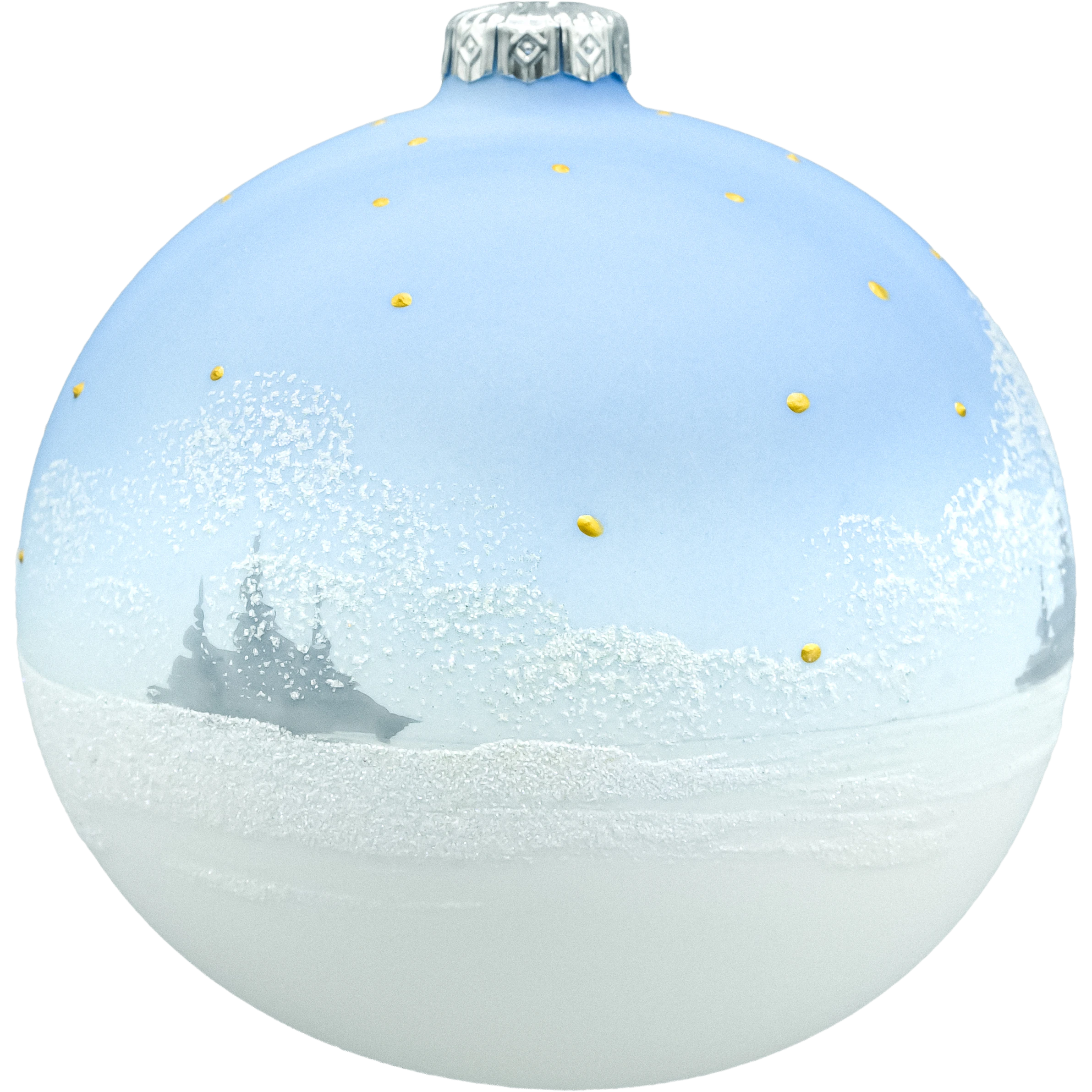 • Wykończenie: w 100% ręcznie malowana; gradient błękit–śnieżna biel, brokatowe bombki na choince, drobne złote gwiazdki oraz tekstura „śniegu”.