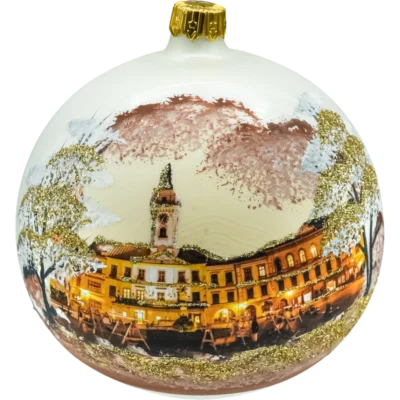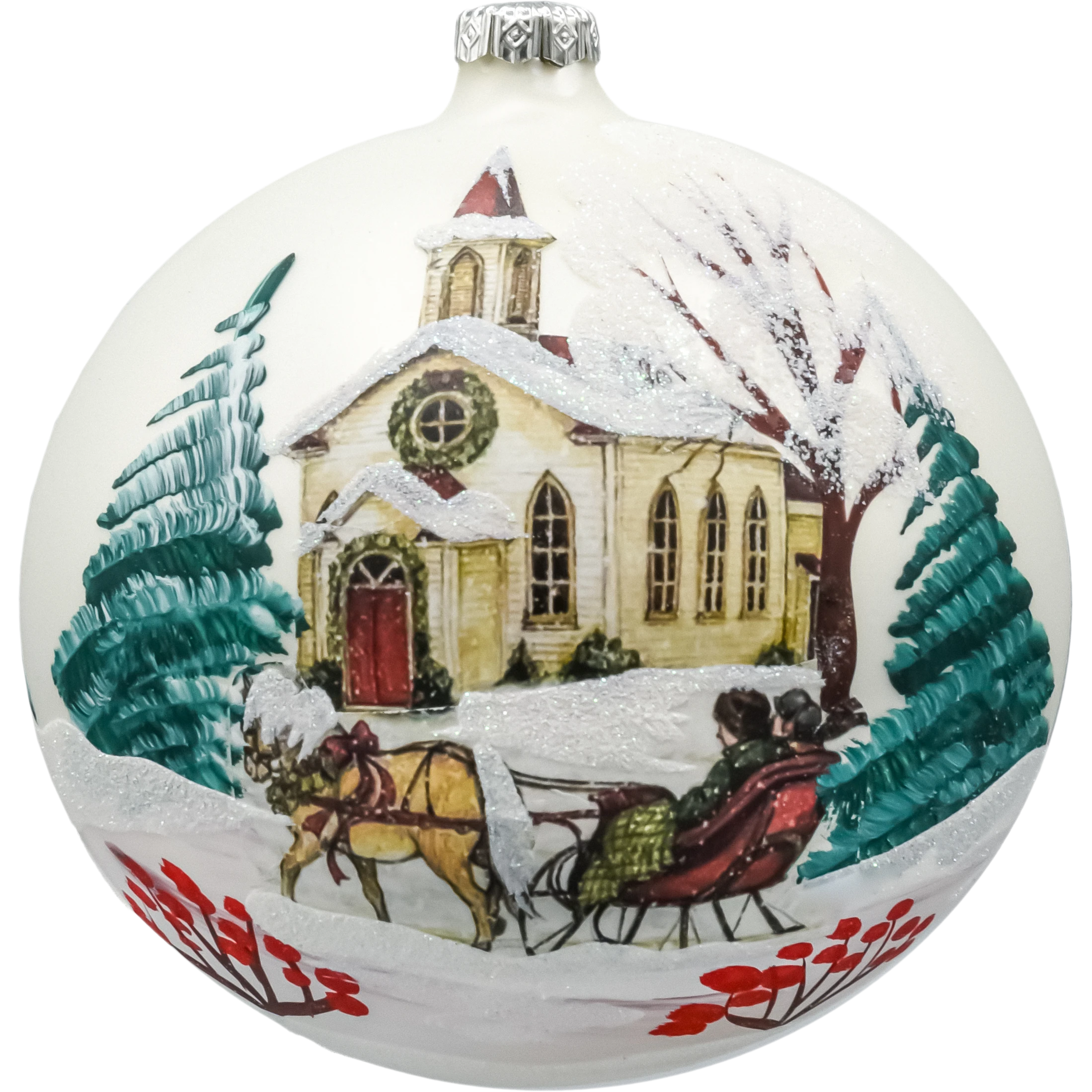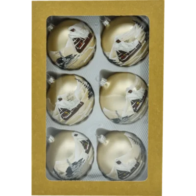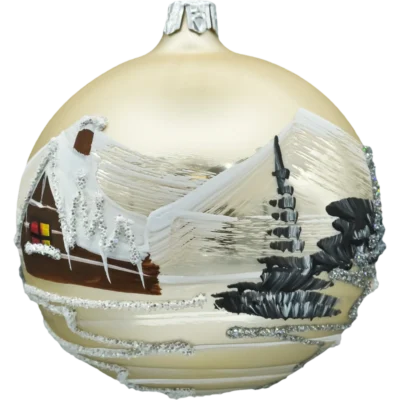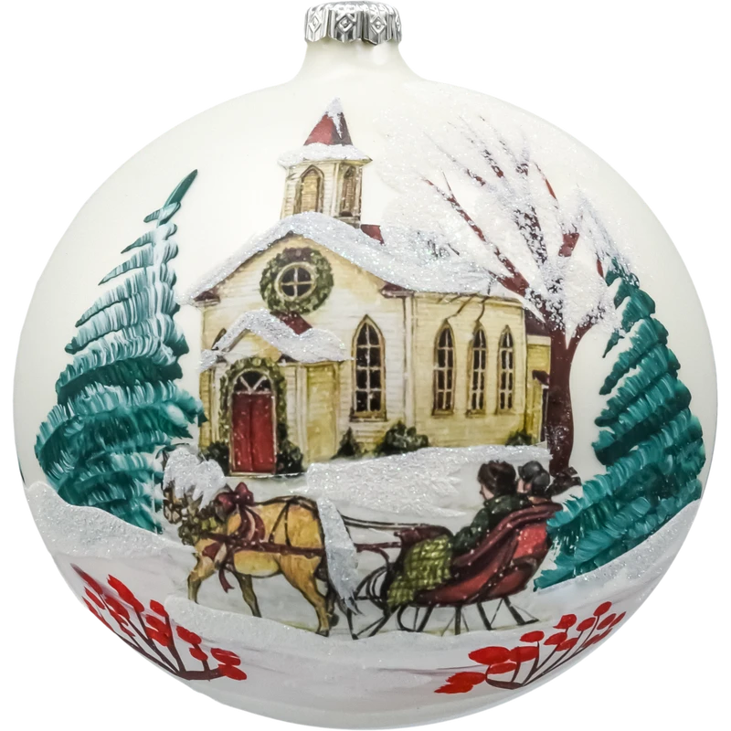 Duża szklana bombka choinkowa o średnicy 150 mm, wykonana metodą decoupage, to prawdziwa perła wśród świątecznych dekoracji. Na powierzchni bombki przedstawiono nastrojową scenę zimową – zabytkowy, ośnieżony kościółek otoczony świerkami, z parą zakochanych jadącą saniami zaprzężonymi w konia. Całość malowniczo zatopiona w śnieżnej scenerii, dopełnionej akcentami brokatu, który subtelnie mieni się w świetle lampek choinkowych.