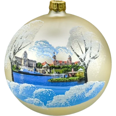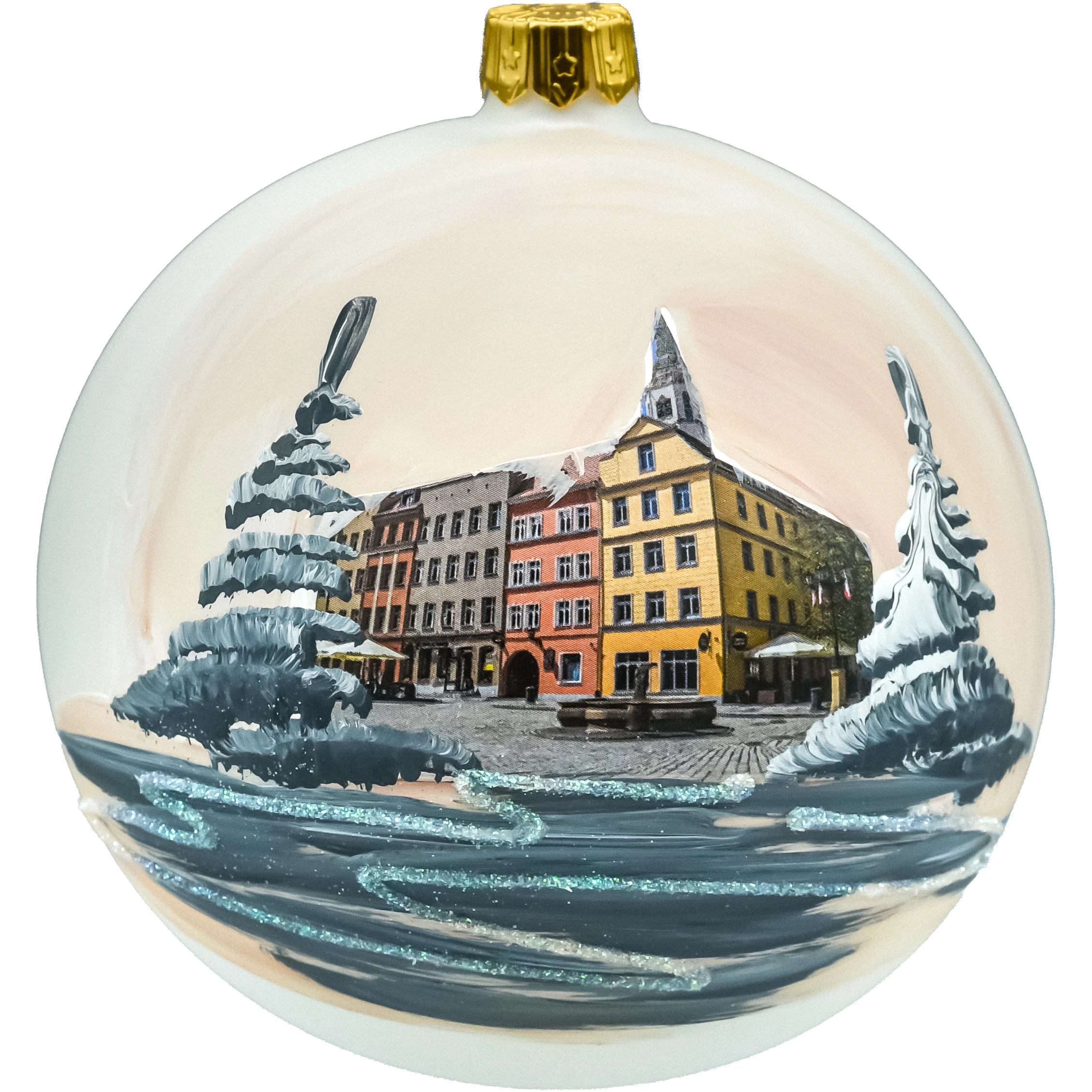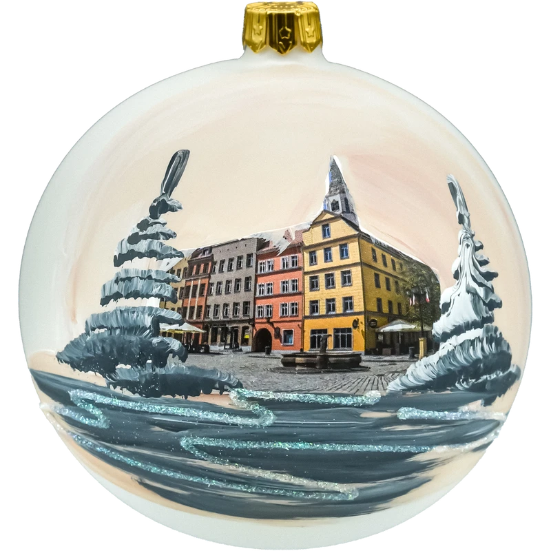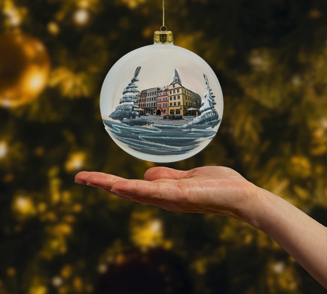 • Ręcznie malowana bombka szklana – precyzyjny, autorski obraz świdnickiego rynku; delikatne akcenty brokatu dodają błysku, a perłowe tło podkreśla głębię sceny.