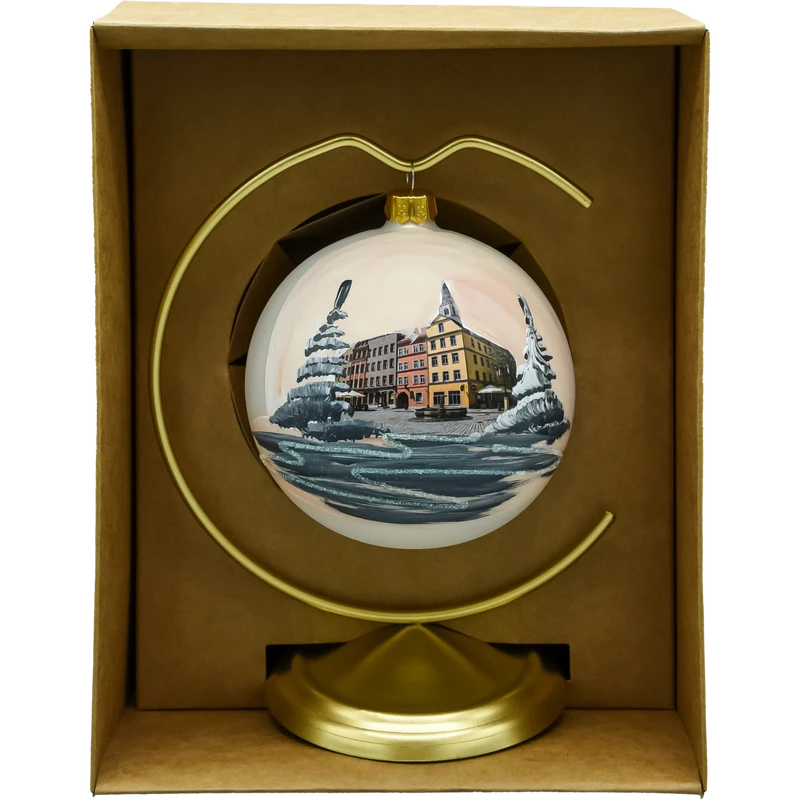 Ręcznie malowana bombka szklana 10 cm „Świdnica” z kolorowymi kamienicami rynku i zimową scenerią. W komplecie złoty metalowy stojak, dzięki któremu ozdoba może zdobić wnętrze także poza sezonem. Idealna pamiątka ze Świdnicy i stylowy prezent świąteczny.
