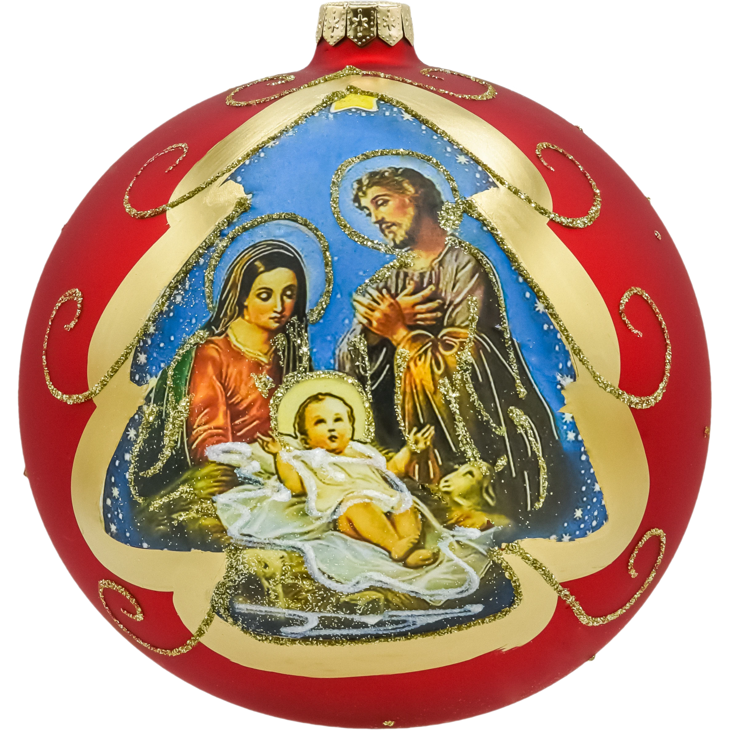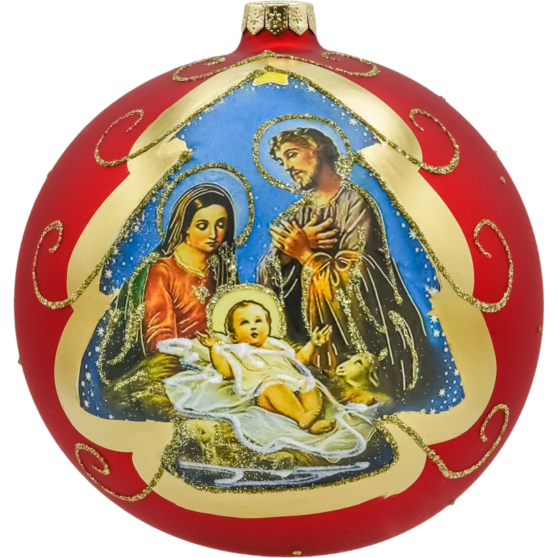 Ręcznie zdobiona bombka szklana decoupage z motywem Świętej Rodziny – elegancka, religijna dekoracja choinkowa o średnicy 150 mm. Idealna ozdoba świąteczna i wyjątkowy prezent.