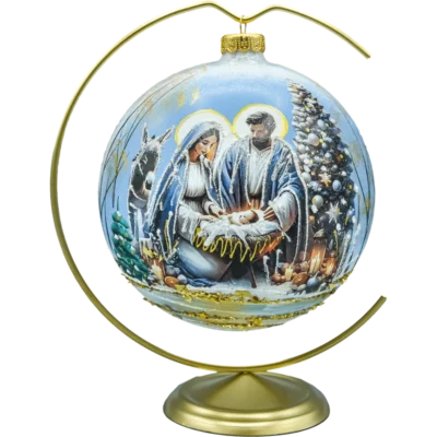 Ta ręcznie zdobiona bombka zachwyca dbałością o detale – od wyrazistych konturów postaci, przez połyskujące aureole i gwiezdne tło, po efektowne ornamenty w postaci złotych spiral na całej powierzchni. Bombka została wykonana z najwyższej jakości szkła dmuchanego i ręcznie malowana przez polskich artystów-rzemieślników, co czyni ją unikatowym dodatkiem do każdej kolekcji świątecznej.