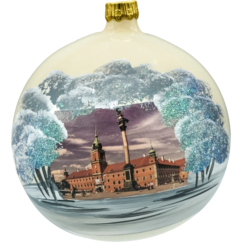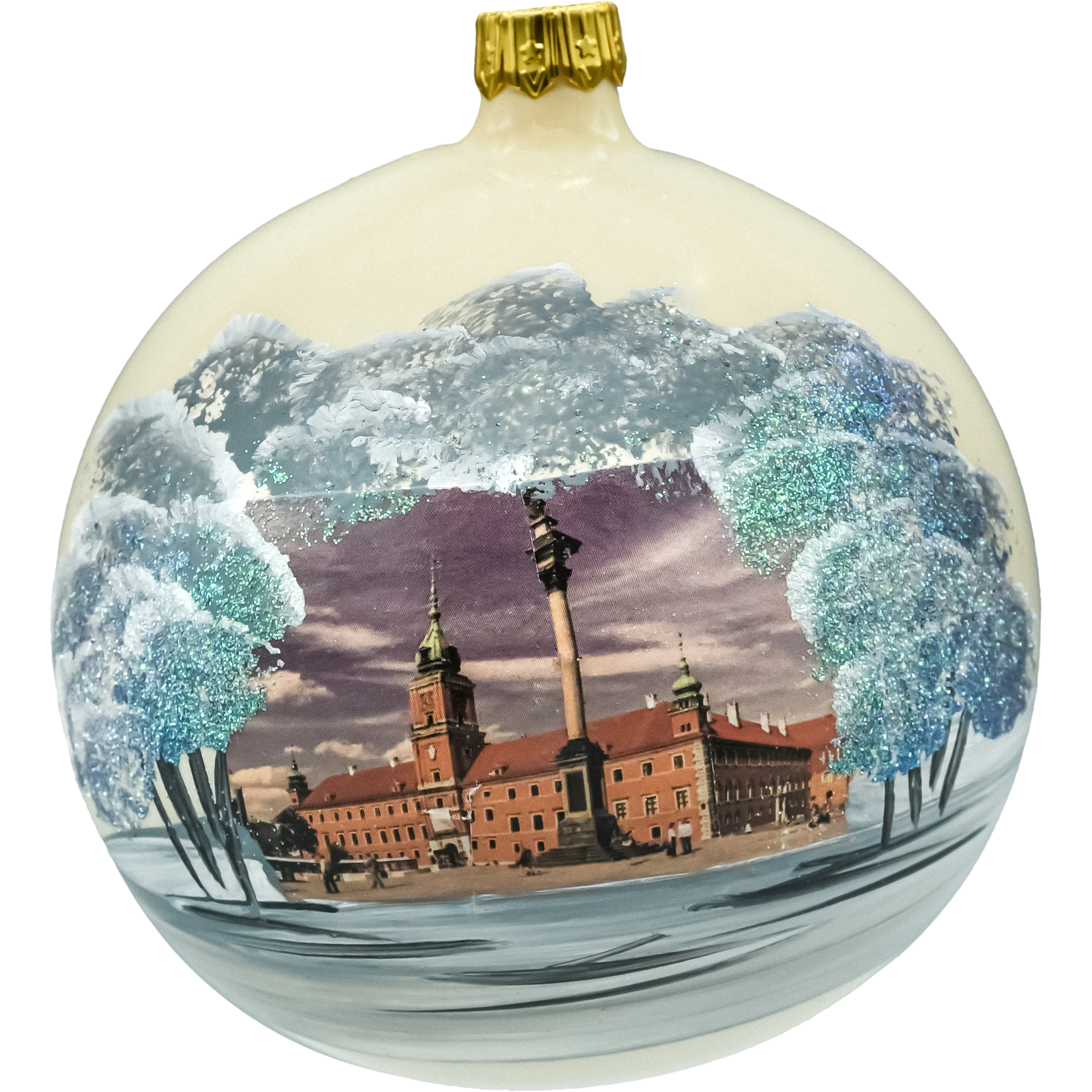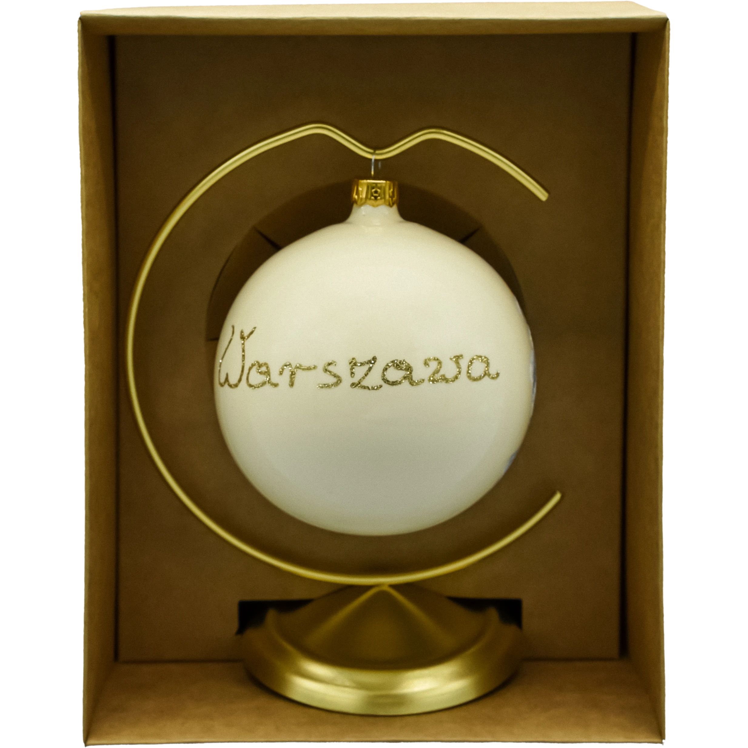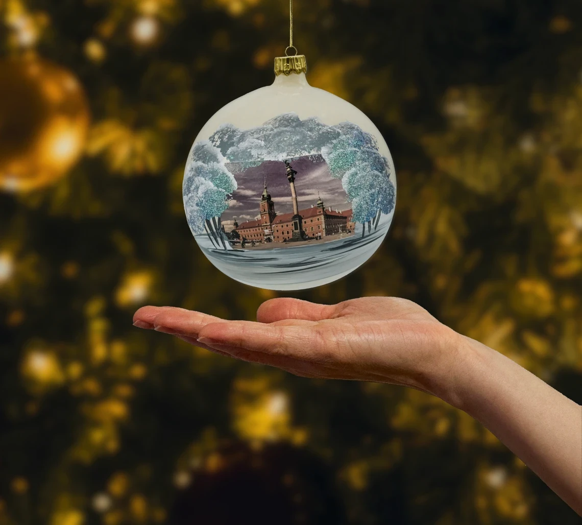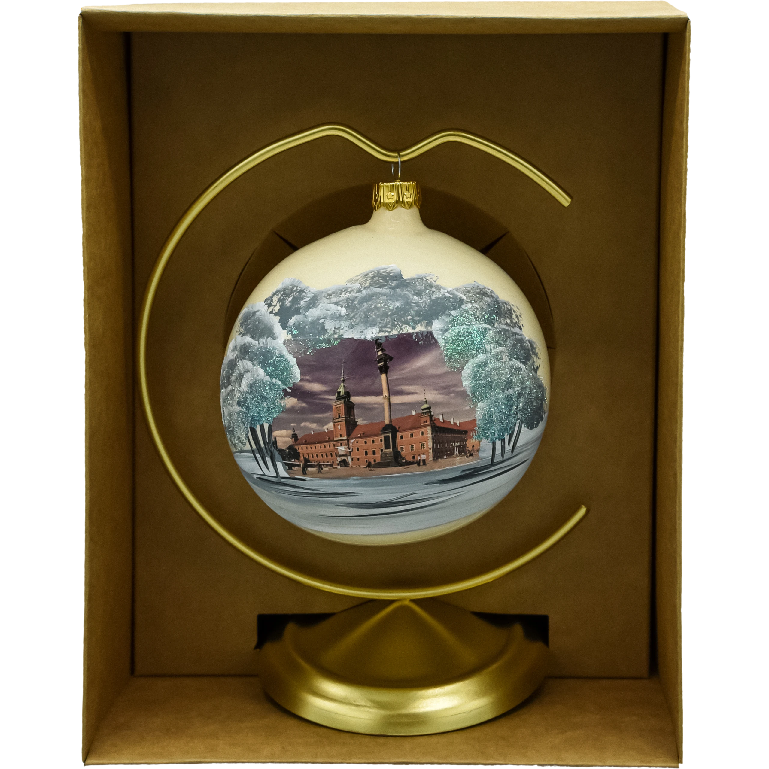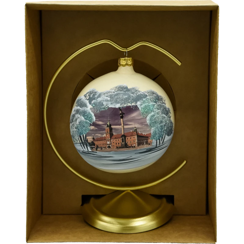 Ręcznie malowana bombka szklana 10 cm „Warszawa” z motywem Zamku Królewskiego i Kolumny Zygmunta. W komplecie złoty metalowy stojak i pudełko prezentowe kraft. Elegancka pamiątka z Warszawy, idealna na prezent, do domu i do biura – błyszczący akcent świąteczny w polskim wydaniu.