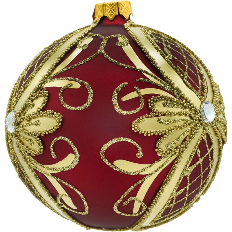 Efektowna bombka choinkowa 10 cm wykonana ze szkła dmuchanego i misternie ręcznie zdobiona. Głęboka, matowa czerwień stanowi eleganckie tło dla kunsztownego wzoru: złote, roślinne ornamenty z brokatu, wypukłe mikrokoraliki tworzące relief 3D, pola w dekoracyjną kratkę karo oraz błyszczący kryształek w centrum rozety. Złote linie przechodzą przez całą kulę, optycznie nadając jej biżuteryjnego charakteru. To bombka premium do aranżacji glamour i klasycznych świątecznych dekoracji.