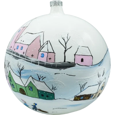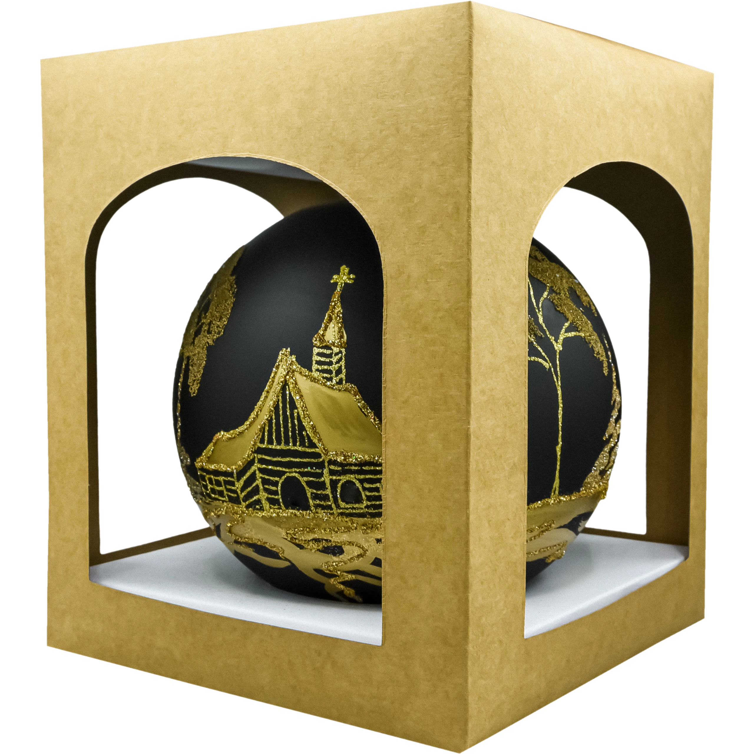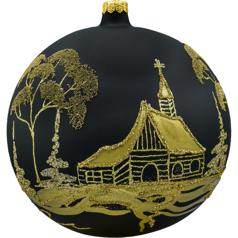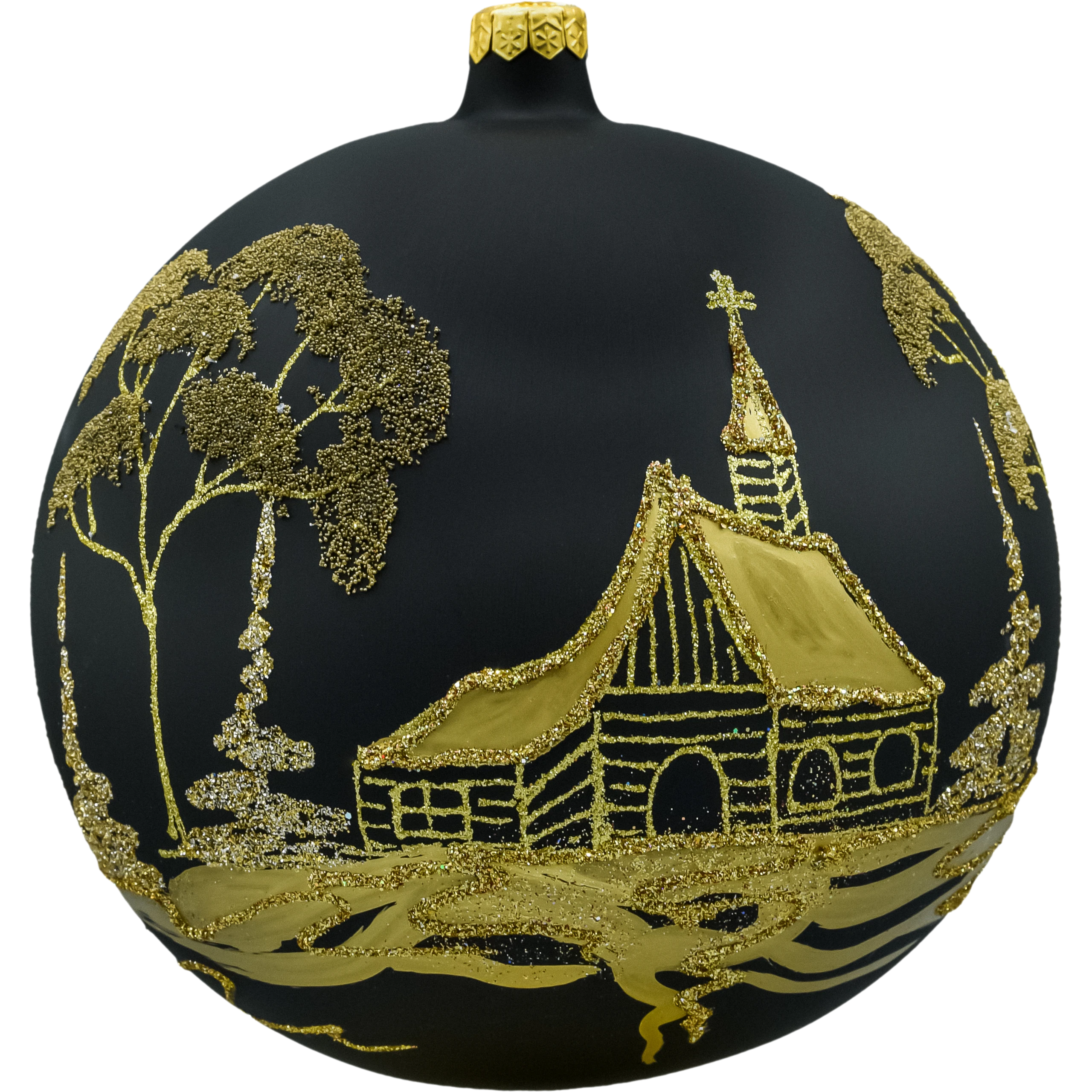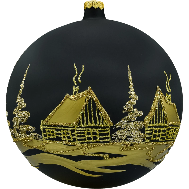 Wyjątkowa, duża bombka choinkowa 20 cm wykonana ze szkła i ręcznie malowana. Matowa czerń stanowi eleganckie tło dla złotego, brokatowego pejzażu zimowej wioski z kościółkiem i chatami. Dekor ma delikatny efekt 3D, pięknie łapie światło lampek, nadając choince i aranżacjom glamour i świątecznego blasku. To dekoracja klasy premium, która sprawdzi się zarówno w domu, jak i w przestrzeniach reprezentacyjnych.