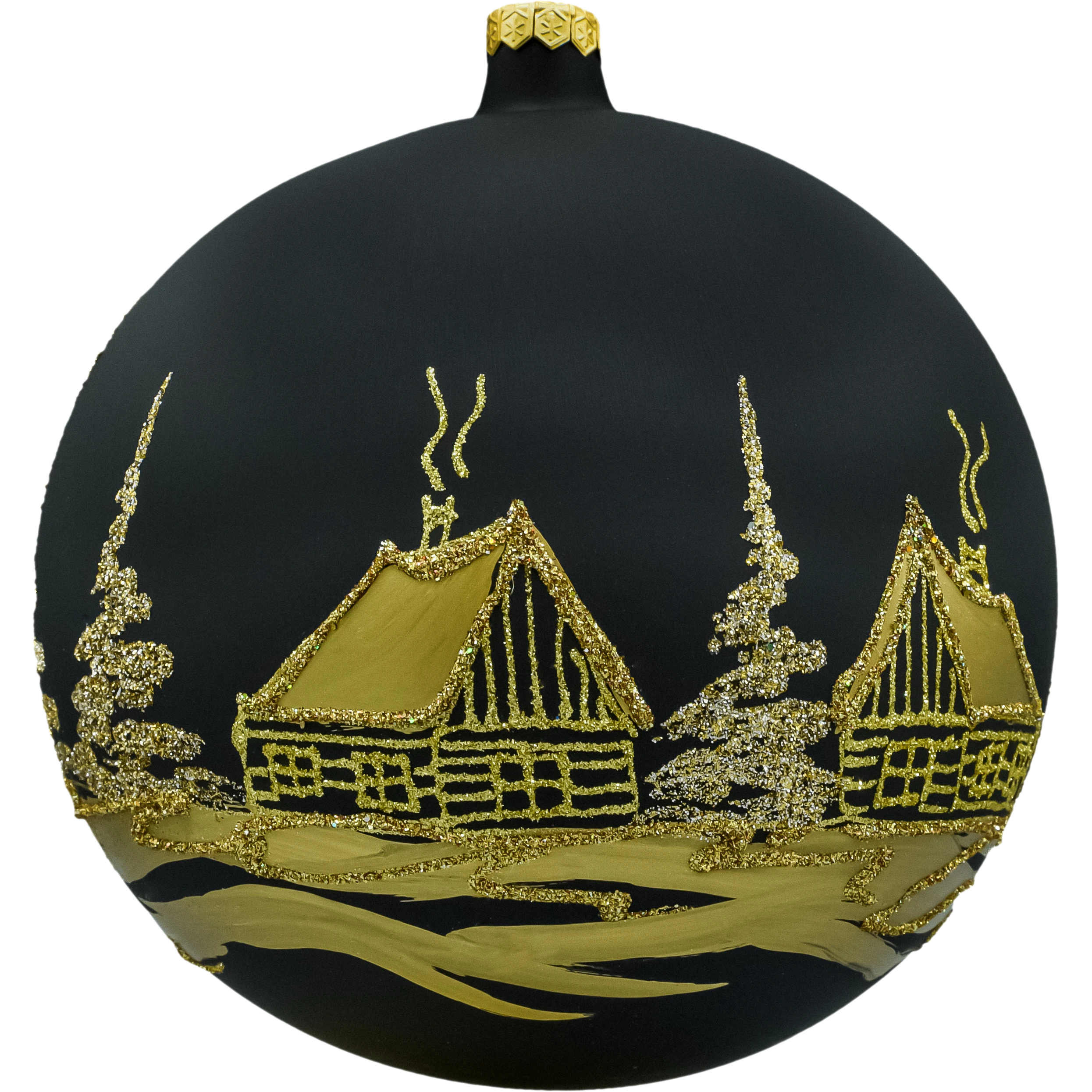 Duża bombka szklana 20 cm w czarnym macie z ręcznie malowanym, złotym zimowym pejzażem i brokatowymi reliefami. Ręcznie dmuchana w Polsce, zapakowana w pudełko prezentowe z okienkiem. Idealna ozdoba choinkowa premium oraz elegancka dekoracja stołu lub kominka w stylistyce black & gold.