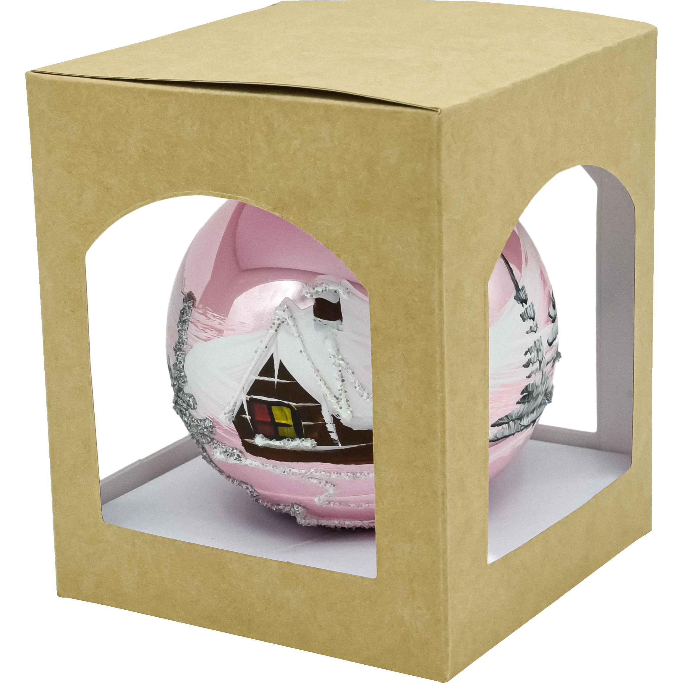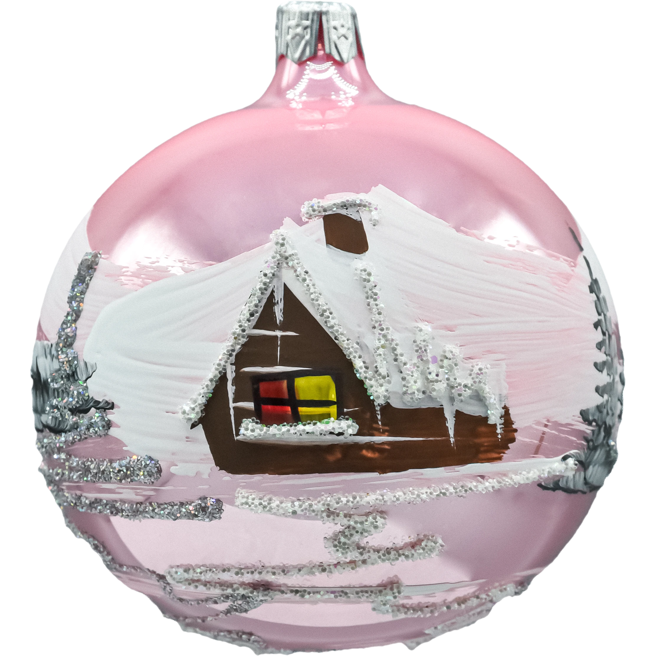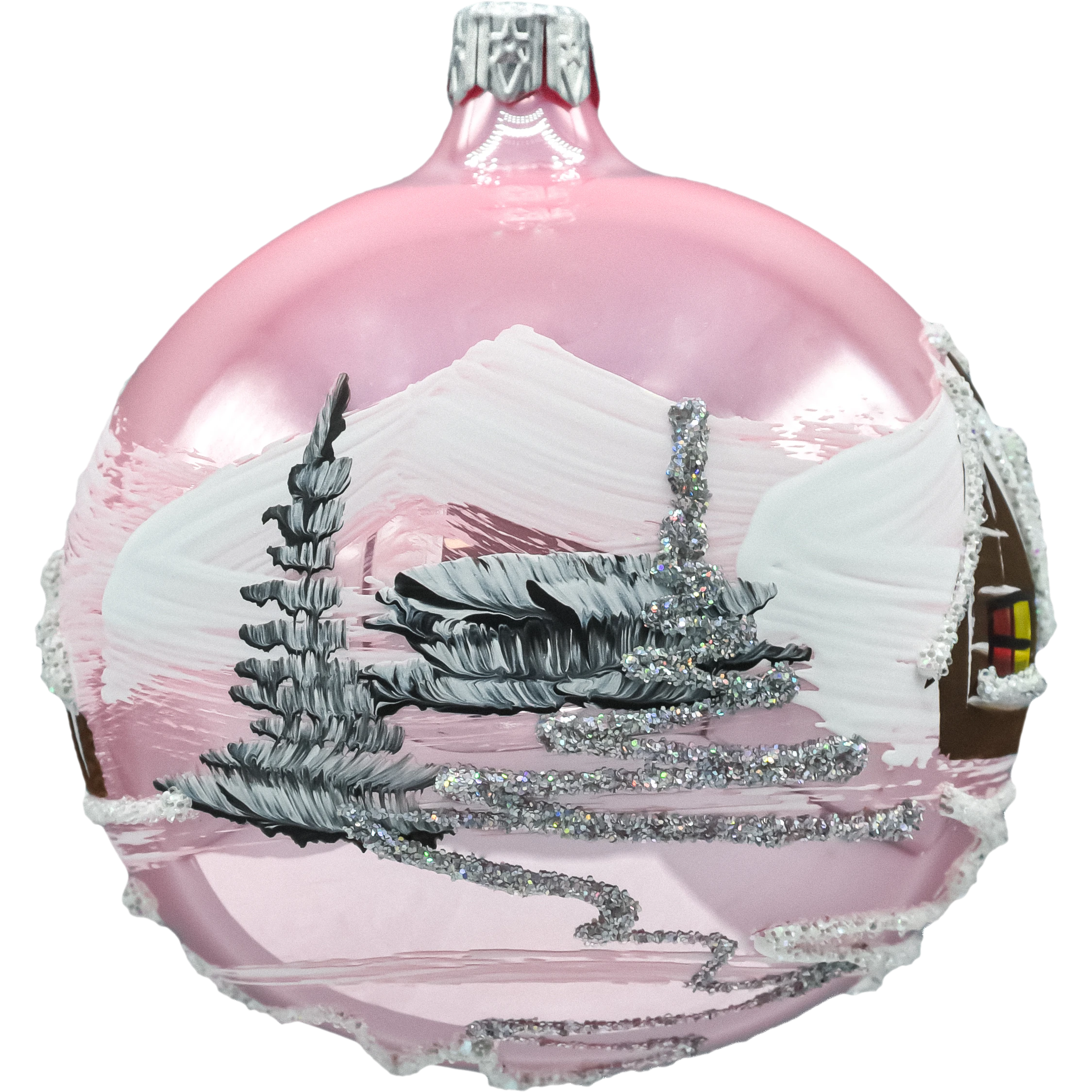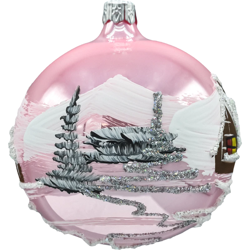 Ta elegancka bombka szklana kula w odcieniu delikatnego różu została ręcznie malowana i zdobiona połyskującym brokatem. Na powierzchni widnieje klasyczny zimowy pejzaż – drewniany domek okryty śniegiem, górskie zbocza, choinki i połyskująca, brokatowa droga. Lustrzana poświata szkła pięknie odbija światło lampek, a warstwowe pociągnięcia farby tworzą efekt 3D. To ponadczasowa ozdoba choinkowa w stylu retro, która wprowadza na choinkę klimat świąt i domowego ciepła.