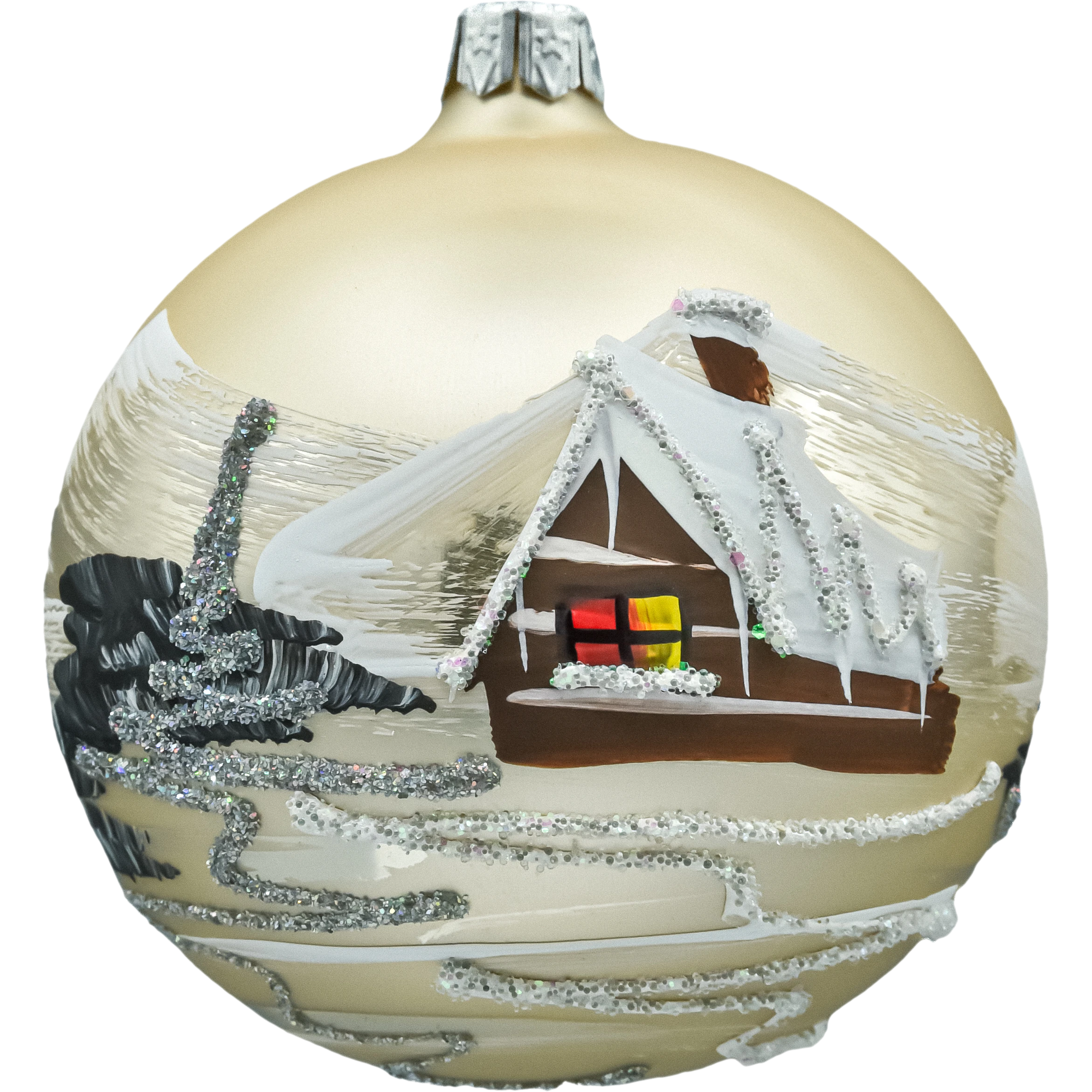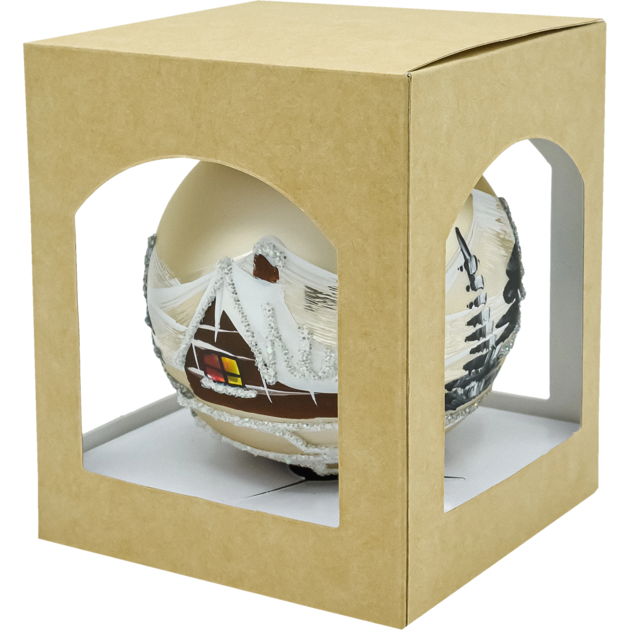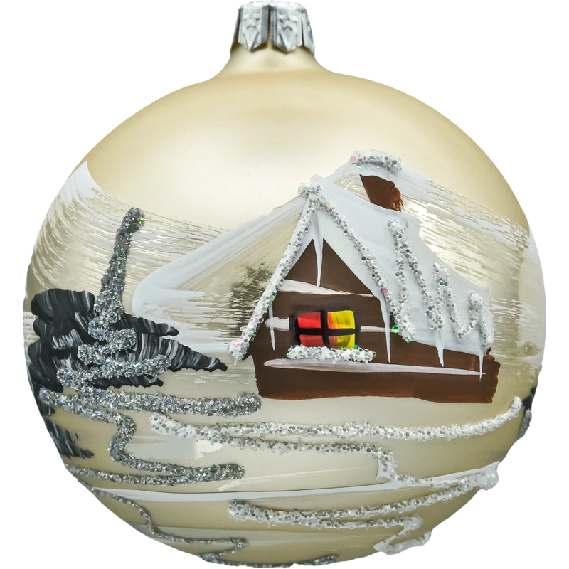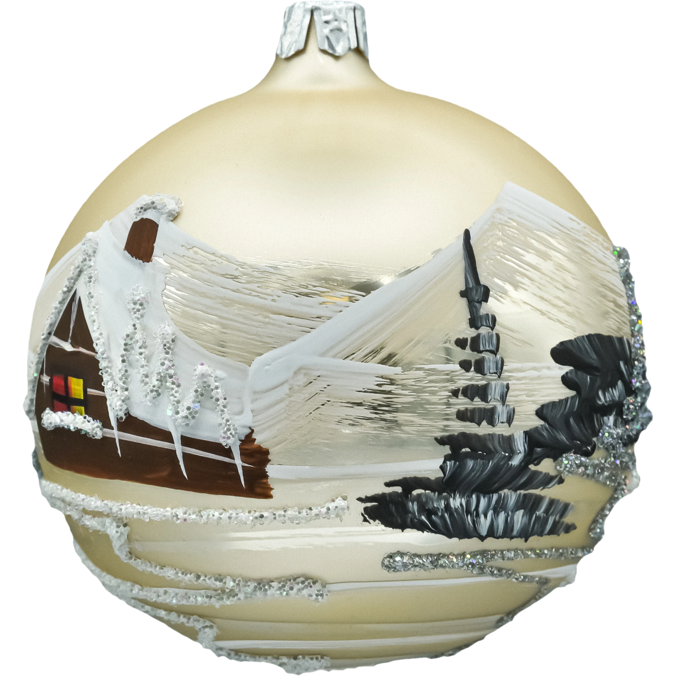 Elegancka szklana bombka 8 cm w kolorze szampana, ręcznie malowana zimowym pejzażem z chatką. Subtelny brokat i matowo-perłowe wykończenie pięknie odbijają światło lampek. Dostarczana w pudełku z okienkiem – idealna ozdoba choinkowa i gotowy prezent na Święta.