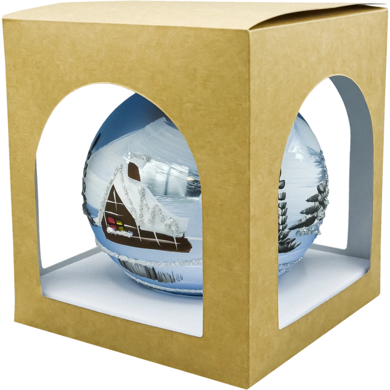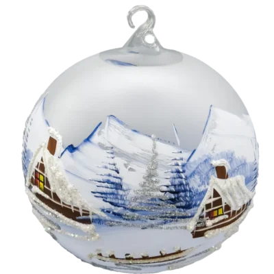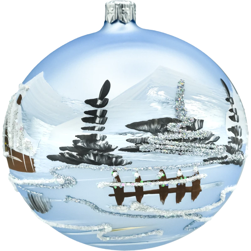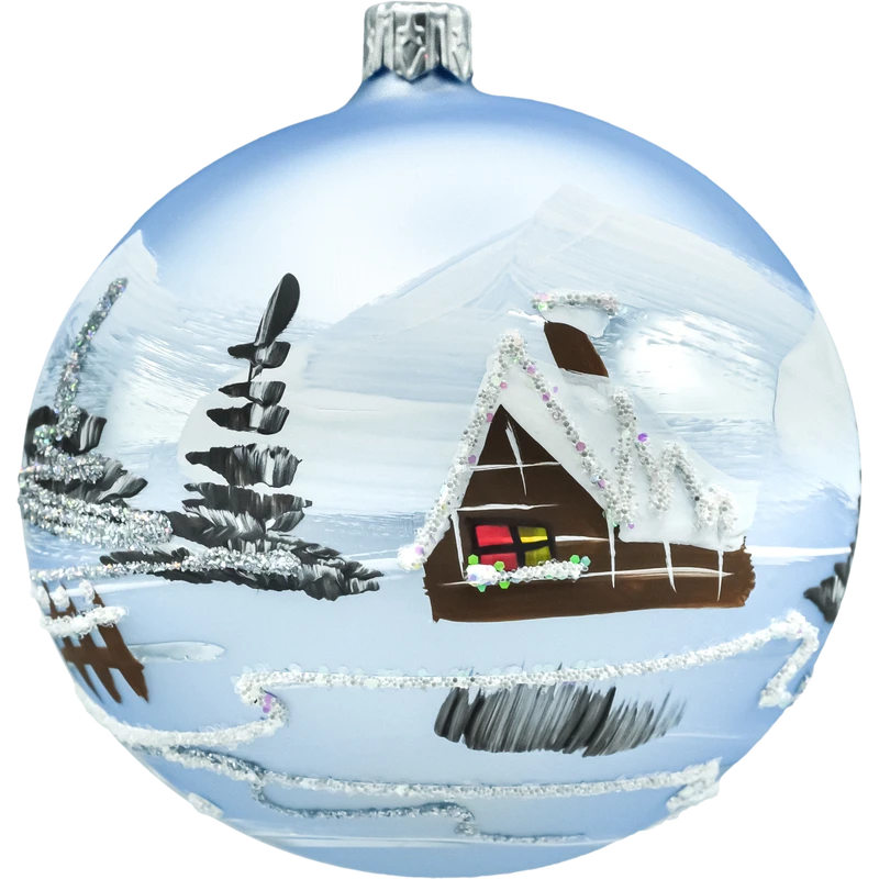 Ręcznie malowana, szklana bombka o średnicy 10 cm w chłodnym, błękitnym kolorze. Na powierzchni widoczny jest klasyczny zimowy pejzaż: ośnieżona chatka z rozświetlonym oknem, świerki, górskie tło oraz połyskujące śnieżne drogi i mostek podkreślone srebrnym brokatem. Delikatny półmatowo-perłowy połysk nadaje ozdobie elegancji, a srebrna koronka z oczkiem ułatwia zawieszenie na choince. Bombka dostarczana jest w kartoniku z okienkami, idealnym do bezpiecznego przechowywania lub wręczenia w prezencie.