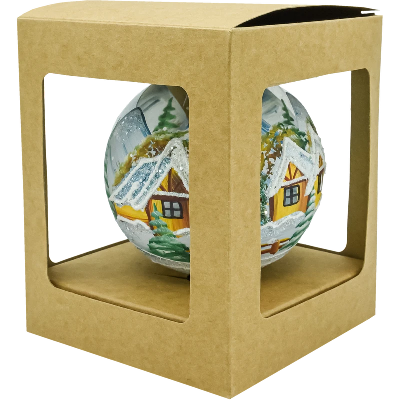 Wysokiej klasy, ręcznie malowana bombka choinkowa o średnicy 10 cm zachwyca klimatycznym pejzażem zimowej wioski. Na perłowym tle artysta namalował drewniane, żółte domki otulone śniegiem, migoczącą choinkę przybrane brokatem i miękko zarysowane góry. Każdy egzemplarz jest unikatowy – różni się pociągnięciami pędzla i układem brokatu. Bombka wykonana jest z dmuchanego szkła i wykończona klasyczną srebrną zawieszką, a w zestawie otrzymujesz pudełko prezentowe z okienkiem, idealne do wręczenia lub bezpiecznego przechowywania.