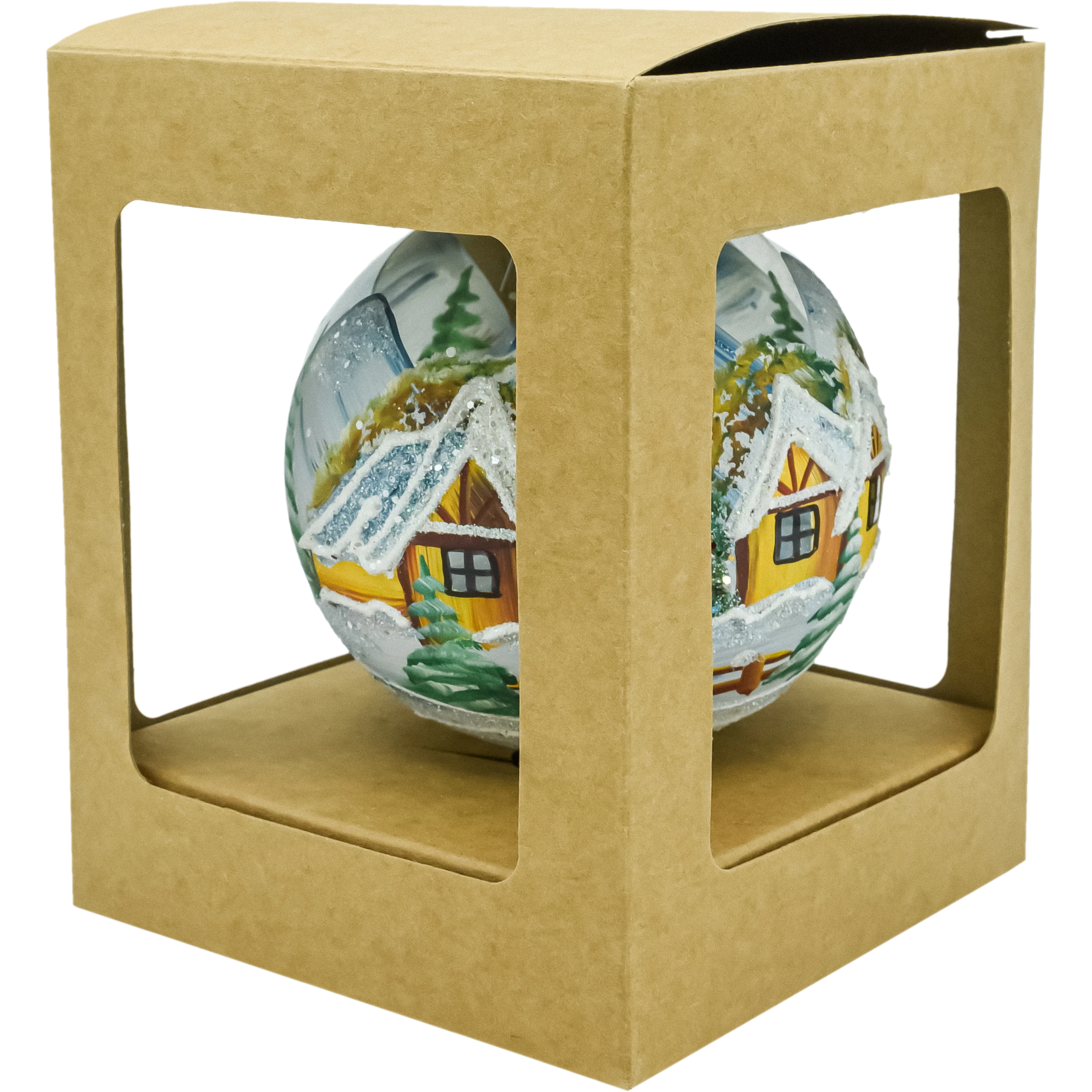 Elegancka bombka szklana 10 cm z ręcznie malowanym motywem zimowej wioski i brokatowej choinki. Wykonana z dmuchanego szkła, błyszcząca i lekka, zapakowana w pudełko prezentowe. Idealna bombka choinkowa, do stroików i jako prezent na święta. Rękodzieło, polska produkcja.