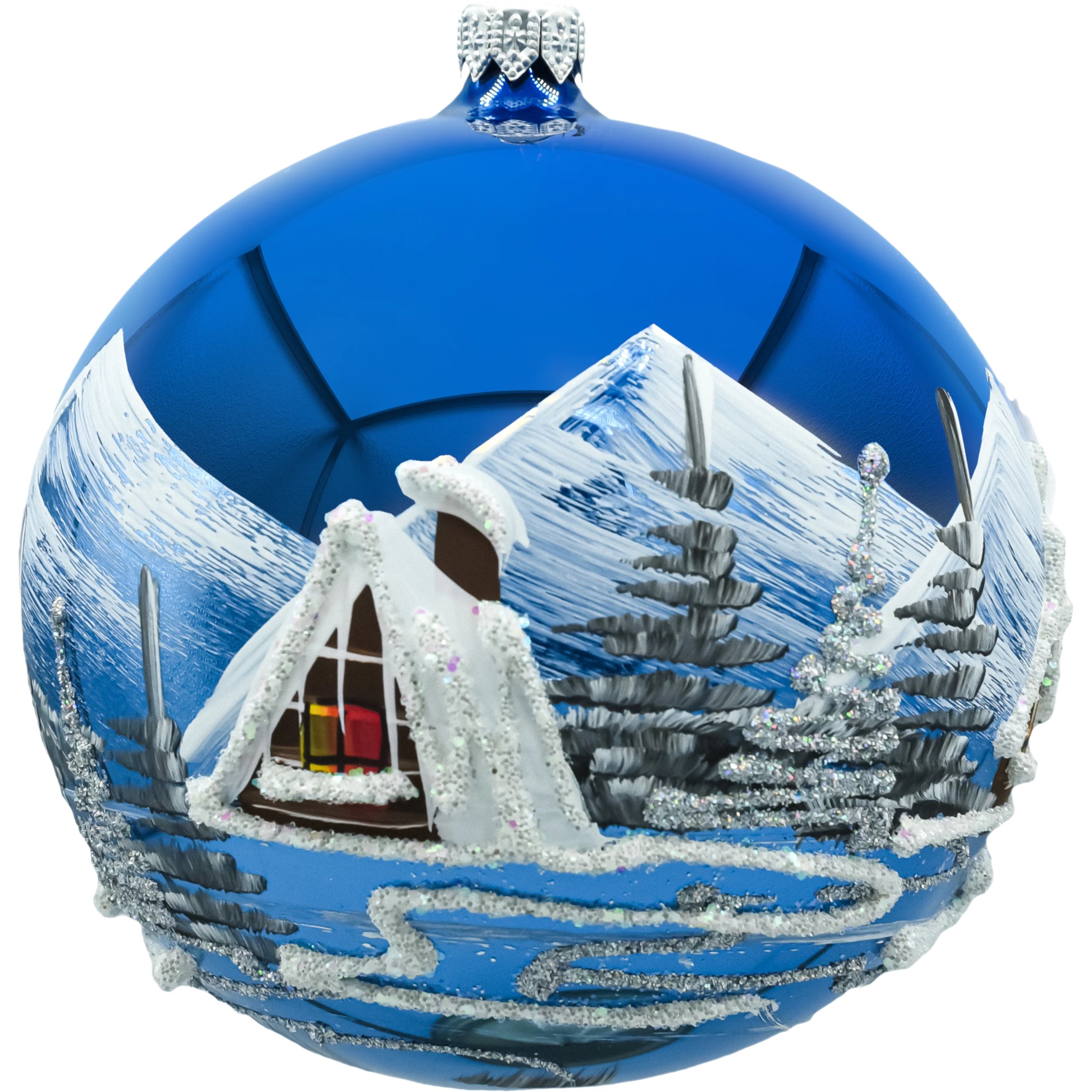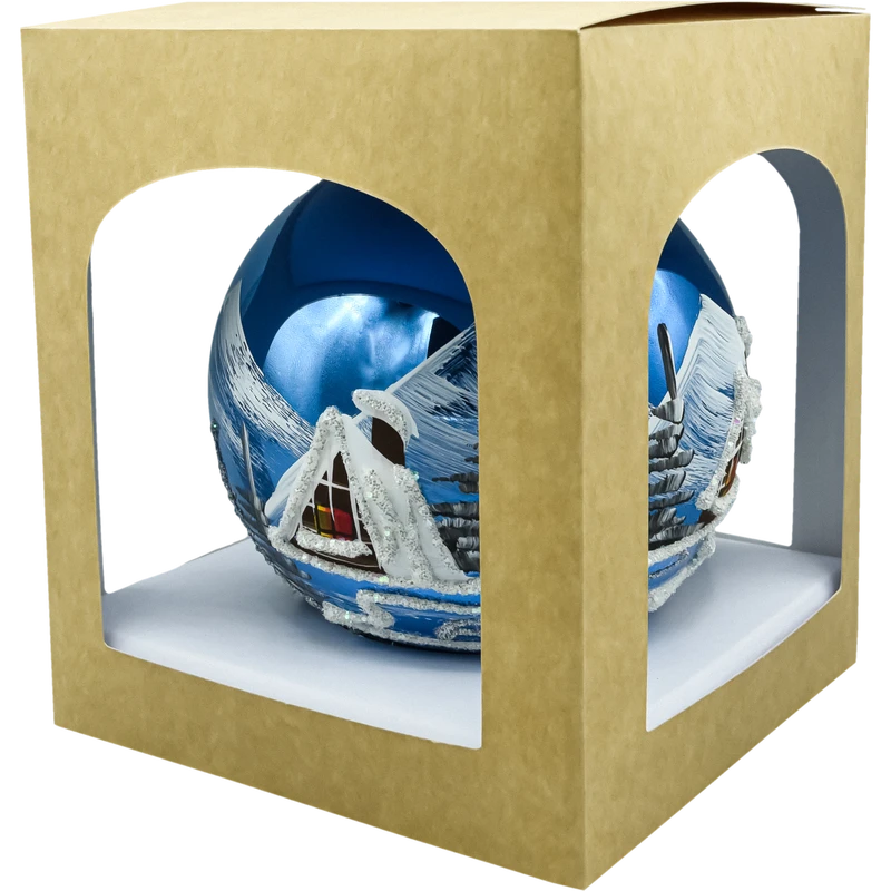 Elegancka bombka choinkowa o średnicy 12 cm wykonana z lekkiego, dmuchanego szkła. Powierzchnia w głębokim, granatowym odcieniu stanowi tło dla ręcznie malowanego motywu zimowej wioski: gór, świerków i przytulnych domków z ośnieżonymi dachami. Kontury i śnieżne akcenty zostały podkreślone srebrnym brokatem, dzięki czemu bombka pięknie mieni się w świetle lampek. Każda sztuka powstaje ręcznie – każda jest unikatowa. Zwieńczeniem jest srebrna czapeczka z oczkiem do wygodnego zawieszenia. Bombka zapakowana jest w ozdobne pudełko z okienkiem, idealne na prezent i bezpieczne przechowywanie po sezonie.