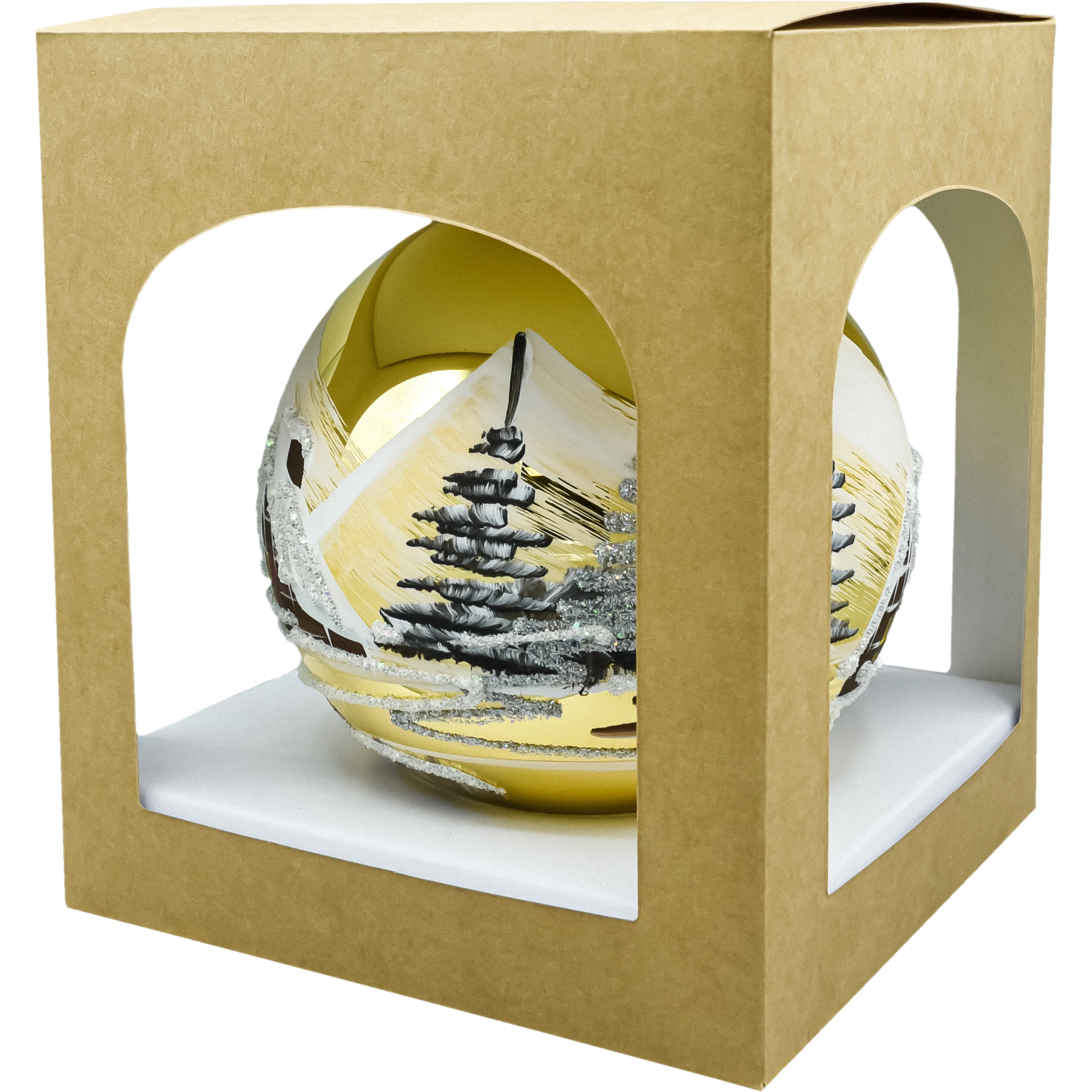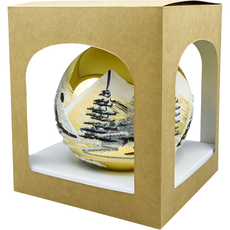 Elegancka szklana bombka choinkowa 12 cm w kolorze złotym, ręcznie malowana zimowym pejzażem z brokatem. Polska produkcja, wysoka jakość, pudełko prezentowe w zestawie. Idealna dekoracja na choinkę i na prezent – klasyka, która rozświetli każde święta.