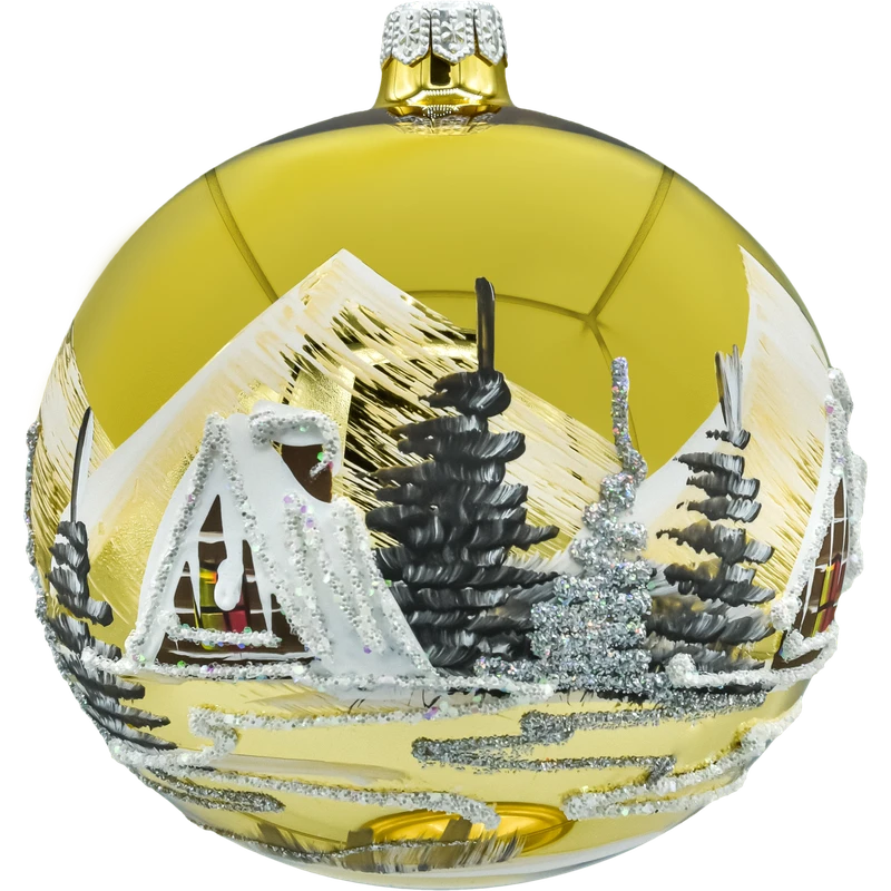 Szklana bombka choinkowa 12 cm – złota, ręcznie malowana z motywem zimowego pejzażu. Każda sztuka została wydmuchiwana ustnie z cienkiego szkła i malowana pędzlem przez polskich dekoratorów. Na lśniącej, złotej powierzchni rozpościera się scena ze śnieżnymi górami, chatkami z ośnieżonym dachem, świerkami i iskrzącym brokatem – klasyczna, elegancka dekoracja, która pięknie odbija światło choinkowych lampek. Bombka ma metalową czapeczkę i wygodne oczko do zawieszenia. Dostarczana w estetycznym pudełku prezentowym typu kraft z okienkami, które chroni podczas przechowywania i świetnie nadaje się na upominek. To ponadczasowa bombka szklana dla miłośników tradycyjnych, ale wytwornych ozdób.