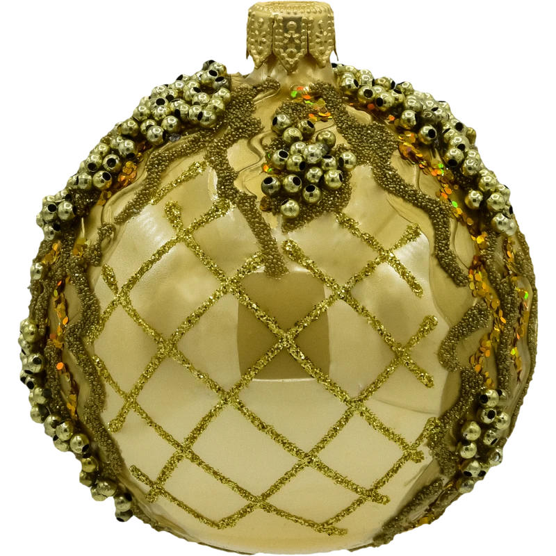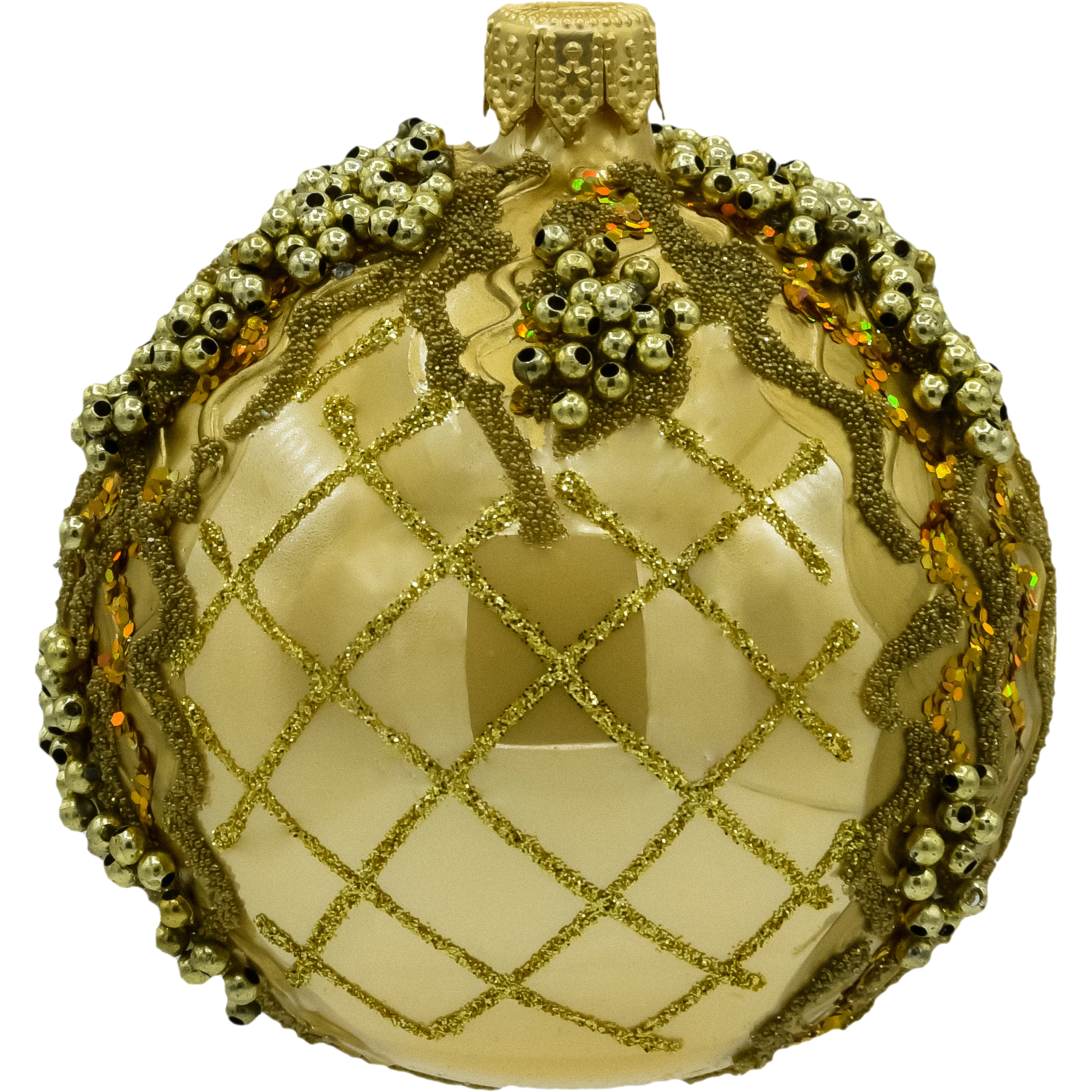Ta wyjątkowa ozdoba przyciąga wzrok wyrafinowanym, złotym kolorem oraz szczegółowymi, ręcznie wykonanymi zdobieniami. Bombka pokryta jest delikatną, złotą siateczką, która tworzy efektowny wzór. Centralna część ozdoby udekorowana jest bogatymi aplikacjami z perełek oraz brokatowymi akcentami. Drobinki brokatu mienią się w świetle, tworząc efekt subtelnego, świątecznego blasku.