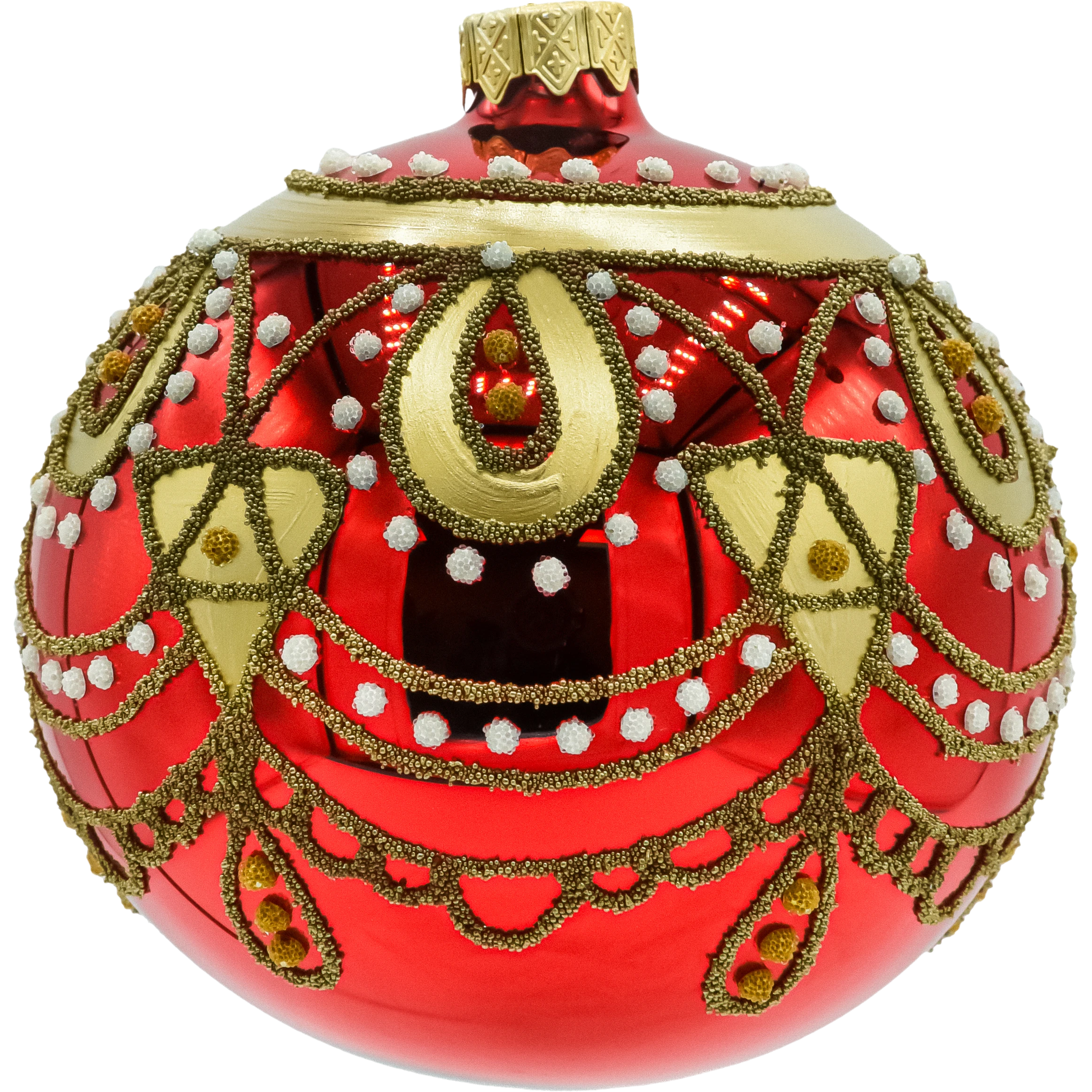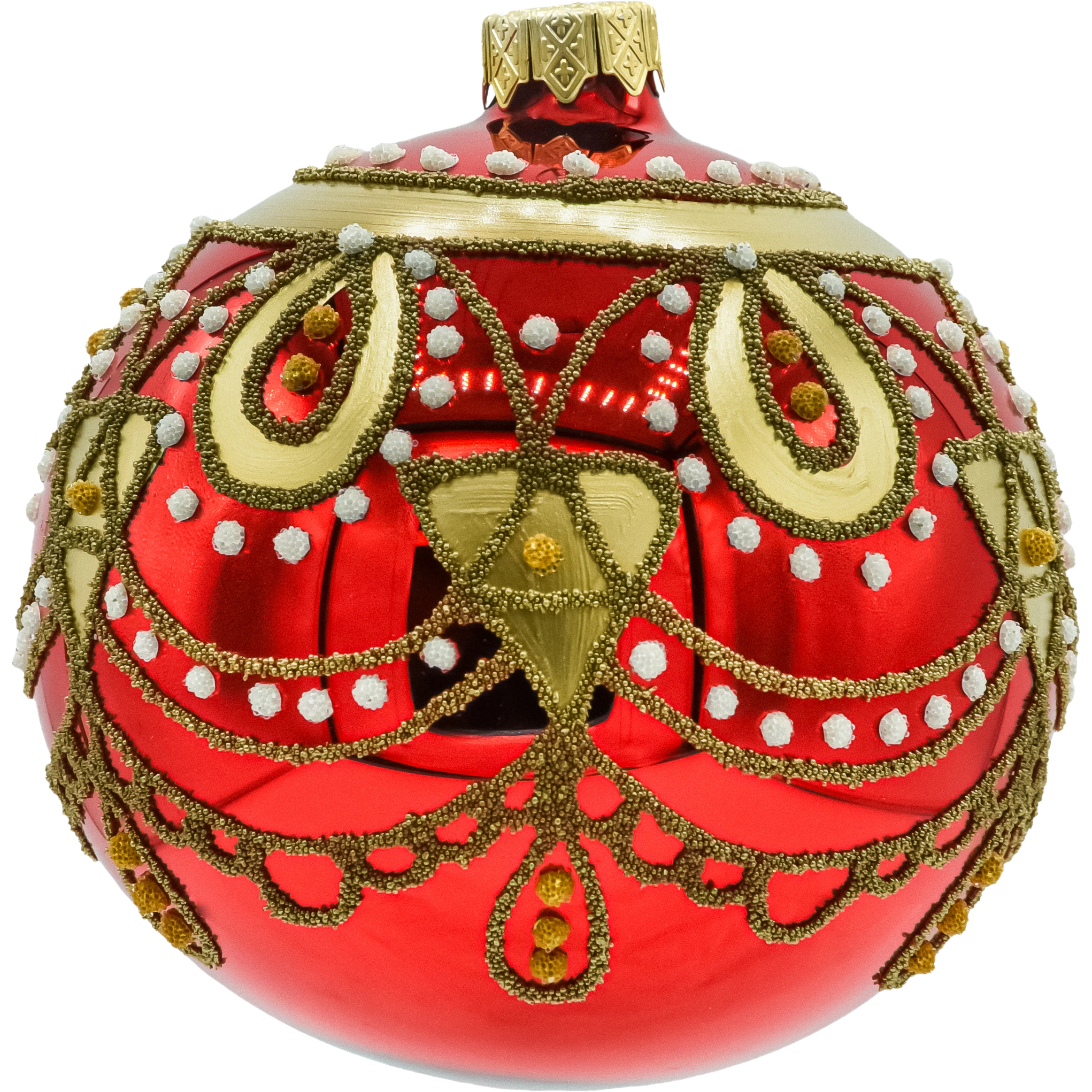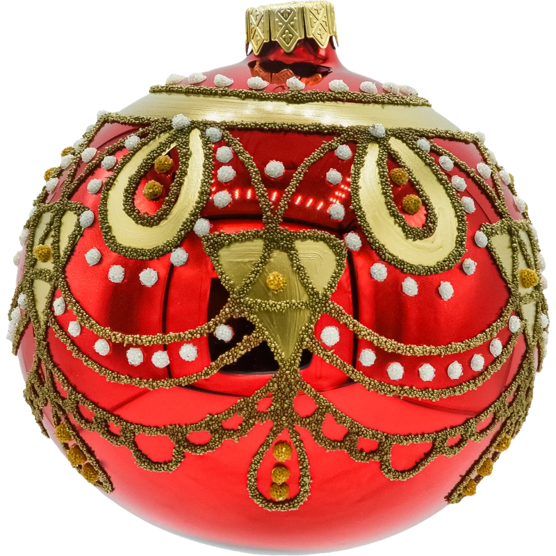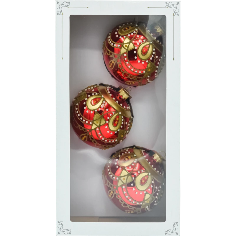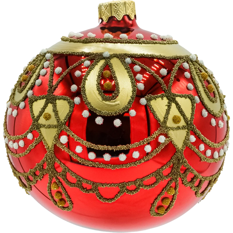 Rozświetl choinkę klasyką w wydaniu glamour. Ten komplet trzech szklanych bombek choinkowych 10 cm powstał z myślą o eleganckich, czerwono-złotych aranżacjach. Błyszcząca, głęboka czerwień stanowi tło dla misternie ręcznie zdobionych wzorów: koronkowych łuków ze złotego brokatu, perełkowych kropek 3D oraz fasetowanych kryształków odbijających światło. Dzięki reliefowym aplikacjom każda kula mieni się i zyskuje wyraźny efekt 3D, a złote koronki i kropki „śniegu” tworzą na powierzchni biżuteryjną siatkę. Złota czapeczka dopełnia całości, podkreślając luksusowy charakter dekoracji.