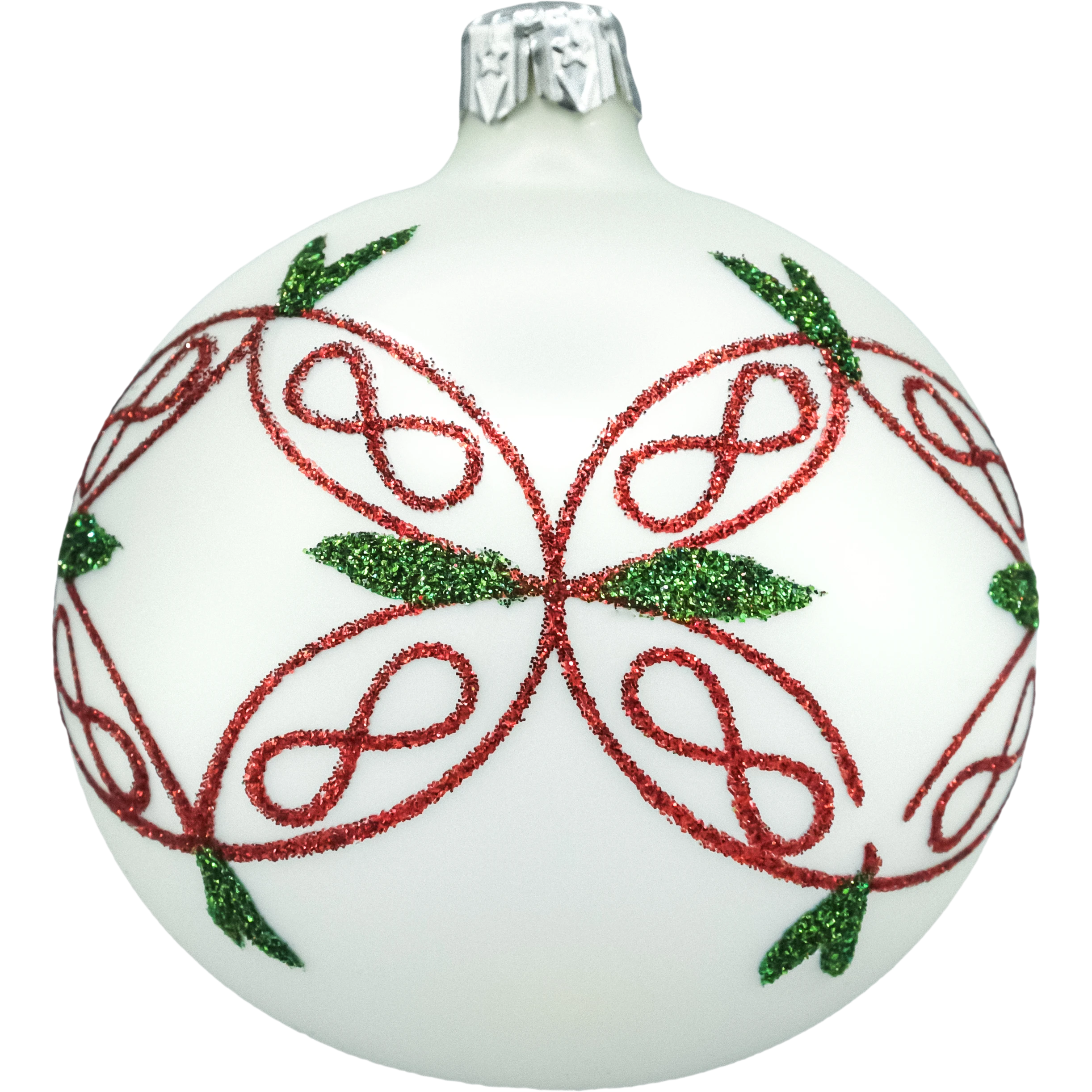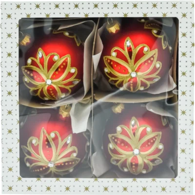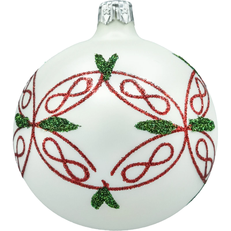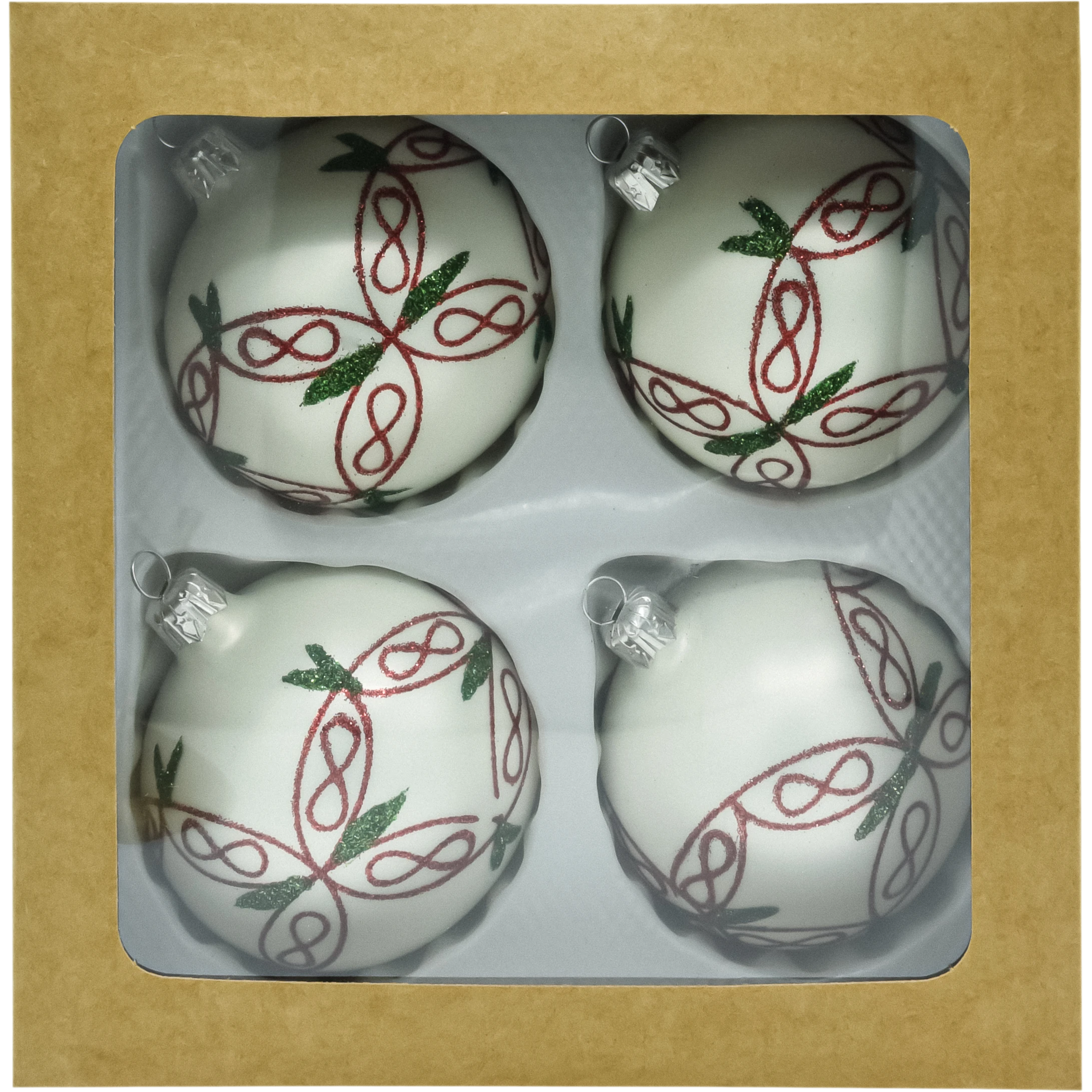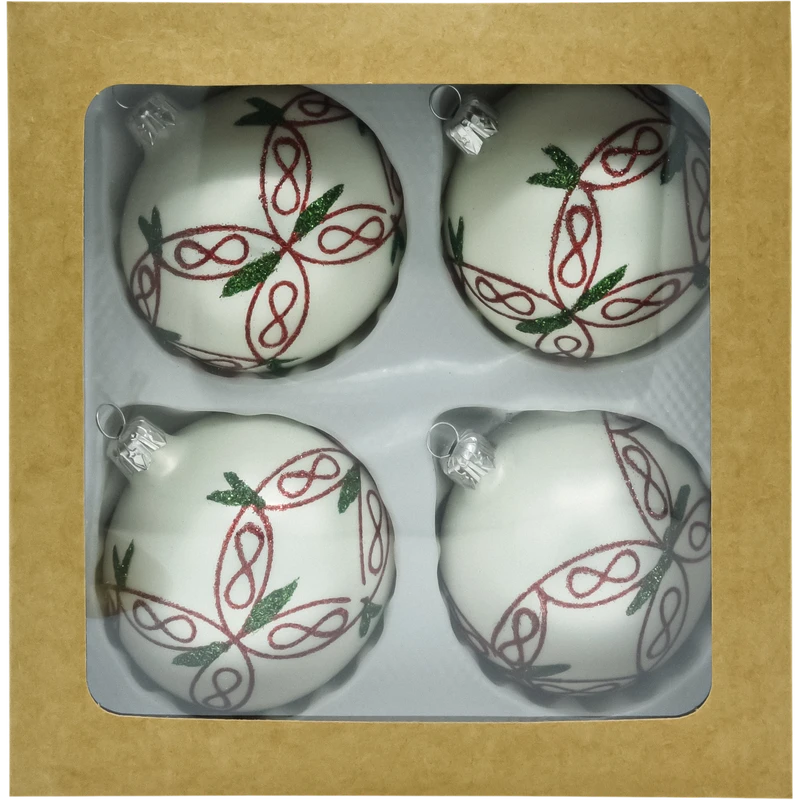 Elegancki zestaw 4 szklanych bombek 8 cm – biały mat z czerwono-zielonym, brokatowym ornamentem. Ręcznie zdobione, w pudełku kraft z okienkiem. Idealne do klasycznych aranżacji choinki i stroików.