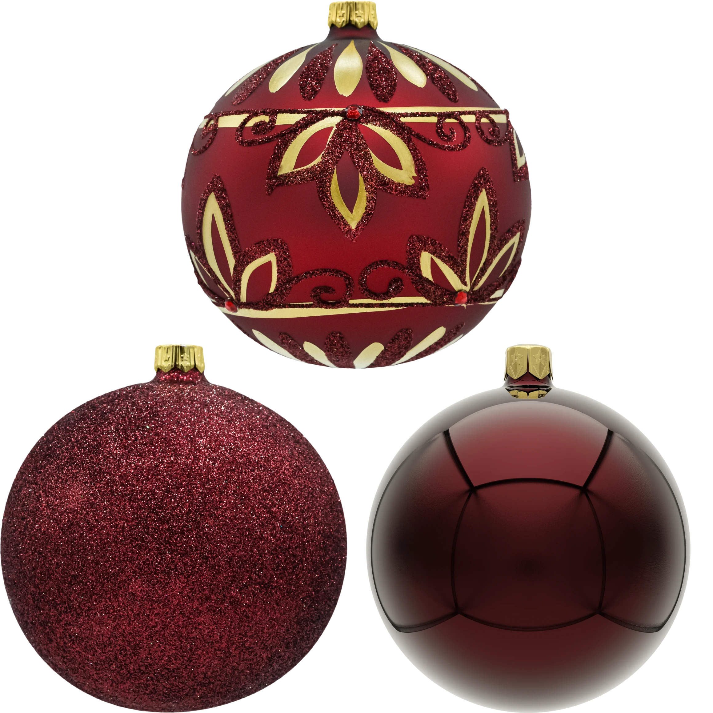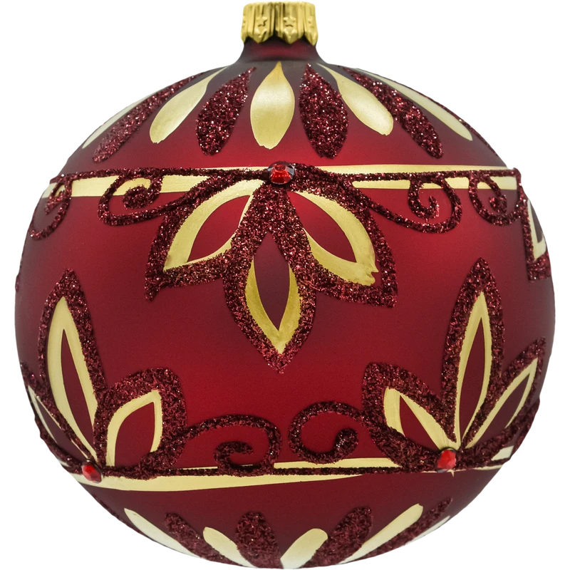 Zestaw 3 bombek szklanych 10 cm w czerwieni/bordo: połysk, mat ze złotym ornamentem i pełny brokat. Ręcznie zdobione, wykonane w Polsce, w pudełku prezentowym z okienkiem. Idealne bombki choinkowe w stylu glamour – na choinkę, do stroików i jako elegancki prezent świąteczny.