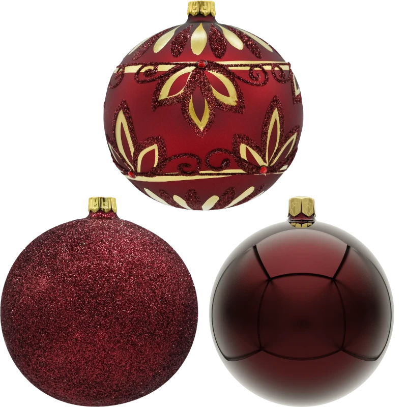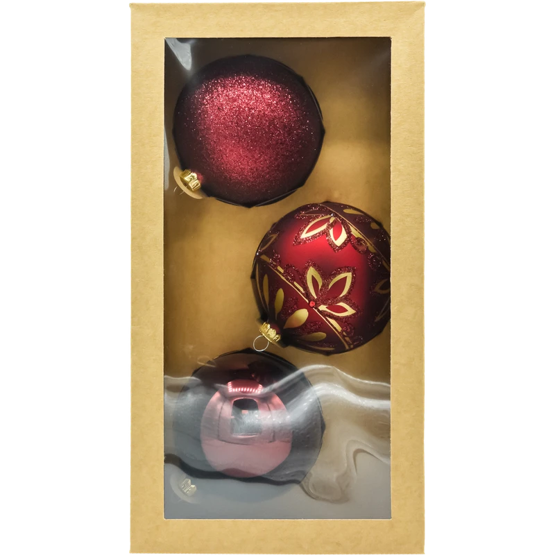 Elegancki zestaw bombek choinkowych 10 cm (3 szt.) w ponadczasowej palecie czerwieni i bordo. W komplecie znajdują się trzy różne wykończenia, dzięki którym dekoracja drzewka jest spójna, ale niejednolita: