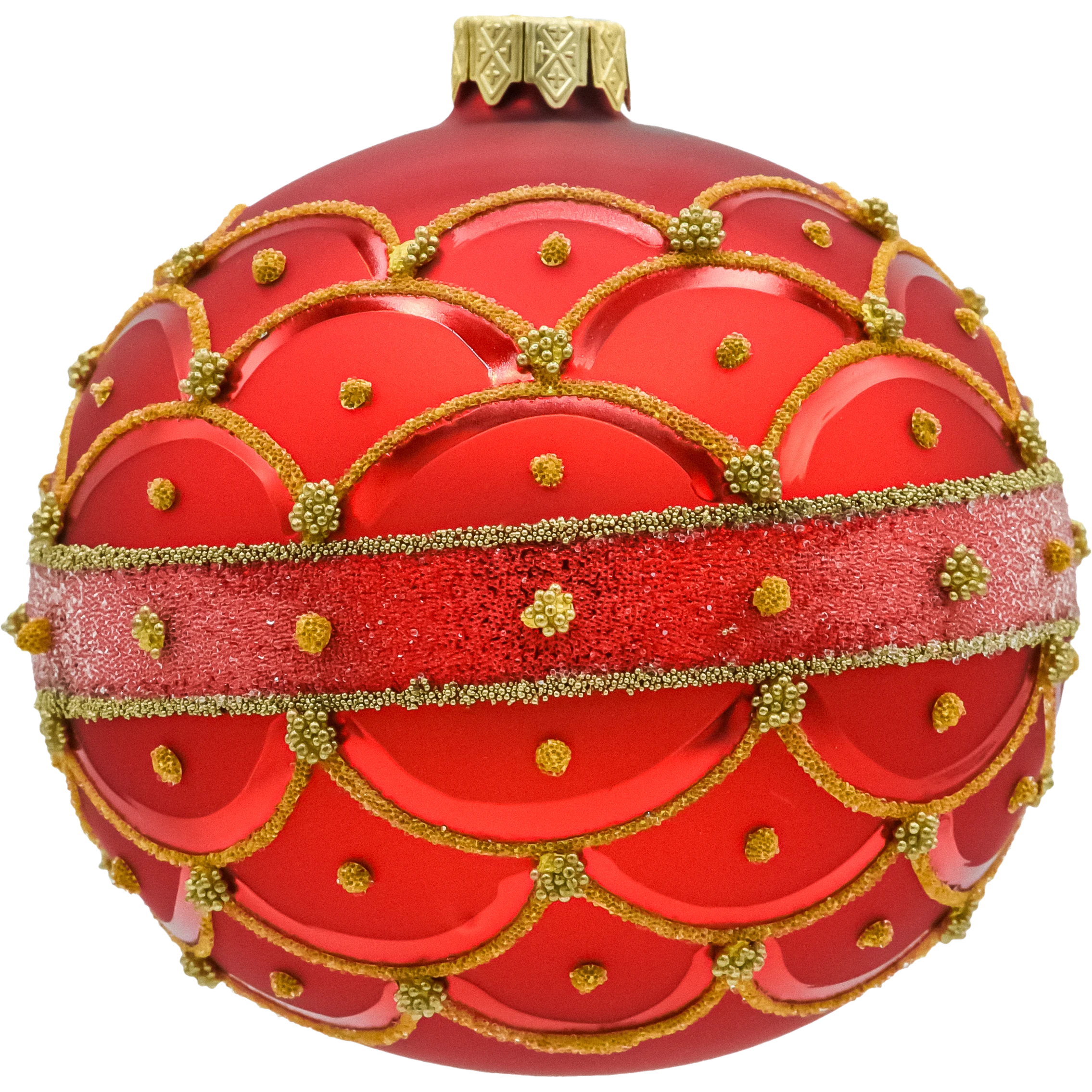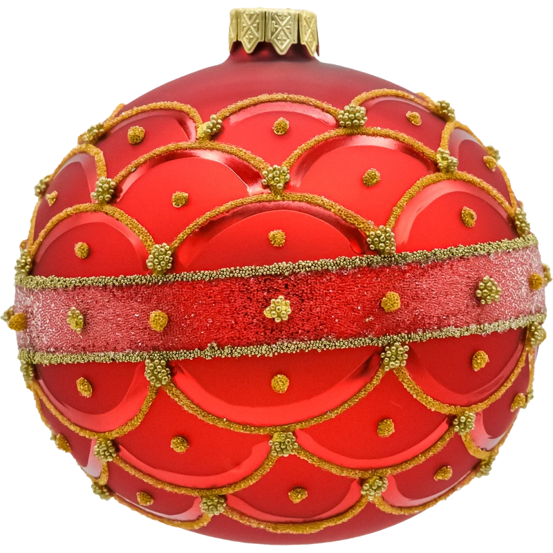 Wytworne, czerwone bombki choinkowe o średnicy 10 cm, ręcznie zdobione misterną, złotą „koronką” z mikrokuleczek i brokatu. Przez środek każdej bombki biegnie szeroki, dekoracyjny pas z drobnych iskier – nadaje głębi, a choinkowe światła pięknie się w nim odbijają. To klasyka Bożego Narodzenia w luksusowym wydaniu: intensywna czerwień, eleganckie złoto, solidne szkło i perfekcyjna prezencja na drzewku, wieńcu czy w stroiku.