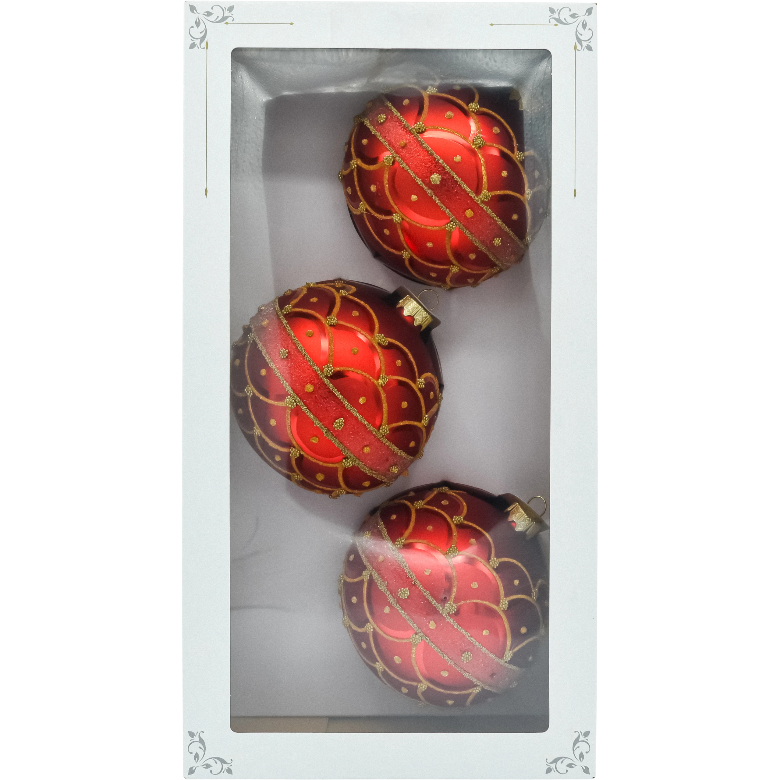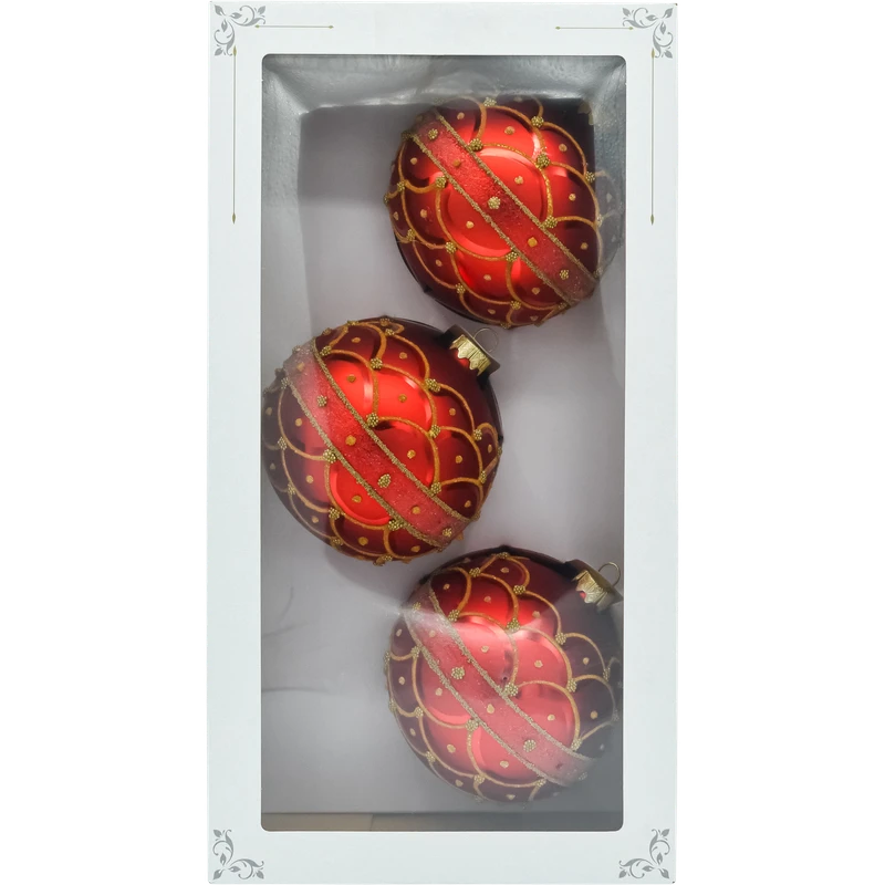 Elegancki zestaw 3 szklanych bombek 10 cm w kolorze czerwonym z bogatym, złotym zdobieniem i szerokim pasem brokatu. Ręcznie dekorowane, idealne na choinkę, wieniec i stroiki. Klasyka świąteczna w stylu glamour – intensywny blask, solidne szkło, pudełko prezentowe. Szklane bombki choinkowe, czerwone, złote, zestaw bombek 10 cm.