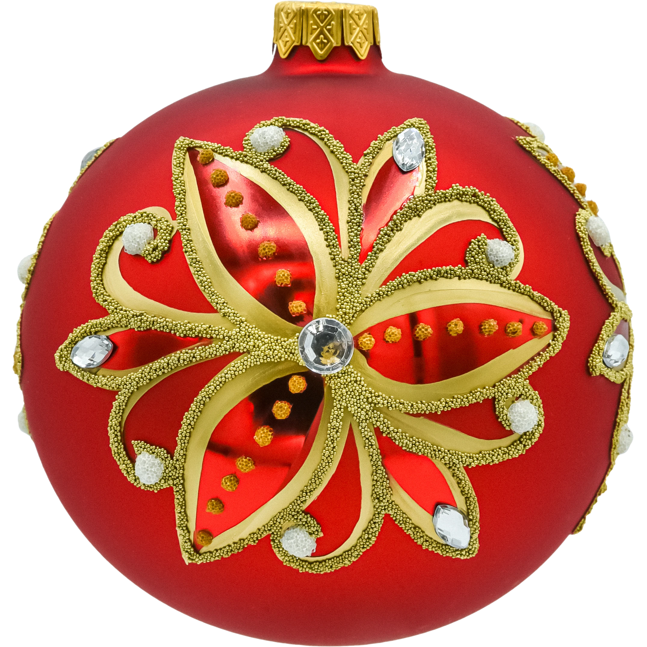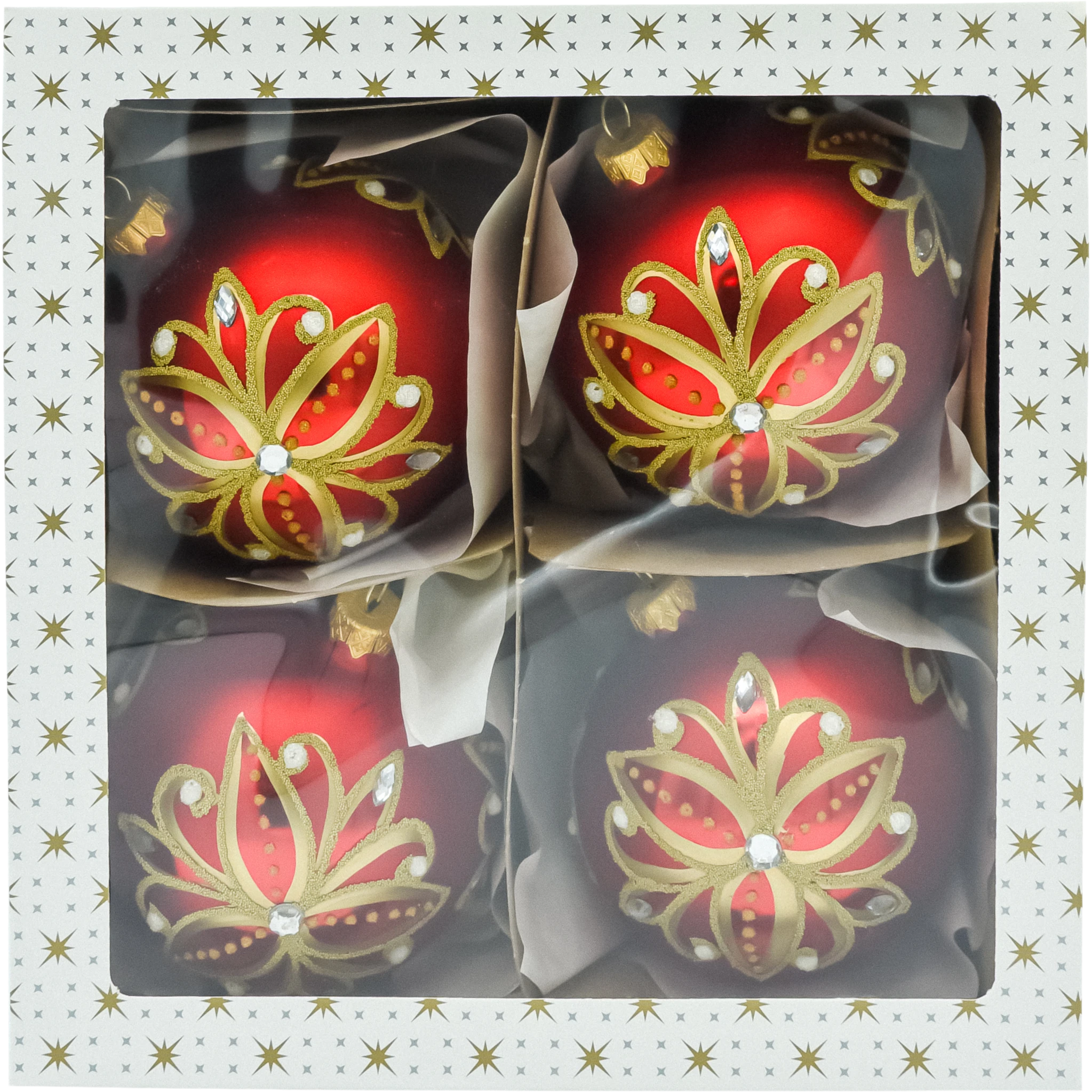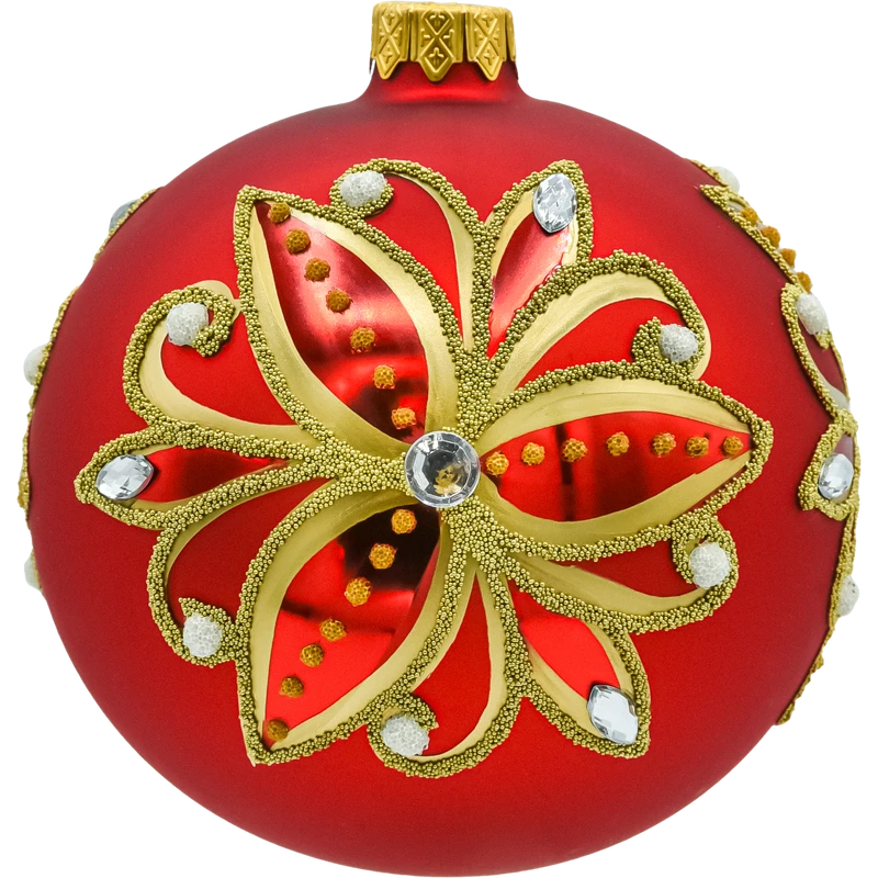 Wytworne, ręcznie zdobione bombki choinkowe ze szkła, których matowa czerwień i złote ornamenty tworzą efekt prawdziwej biżuterii na choince. Każda kula (Ø ok. 10 cm) ma na froncie rozbudowany, roślinny motyw w formie „płatków” – malowany złotem, wysypany drobnymi perełkami brokatowymi i punktowany śnieżnymi kropkami. Centralnie oraz wokół wzoru osadzono połyskujące, fasetowane kryształki, które pięknie łapią światło lampek. Złota koronka-zawieszka dopełnia całości w stylistyce glamour. Bombki są lekkie i wytrzymałe jak na szkło dekoracyjne, dzięki czemu nie obciążają gałązek, a ręczne wykonanie sprawia, że każda sztuka ma unikalny charakter.