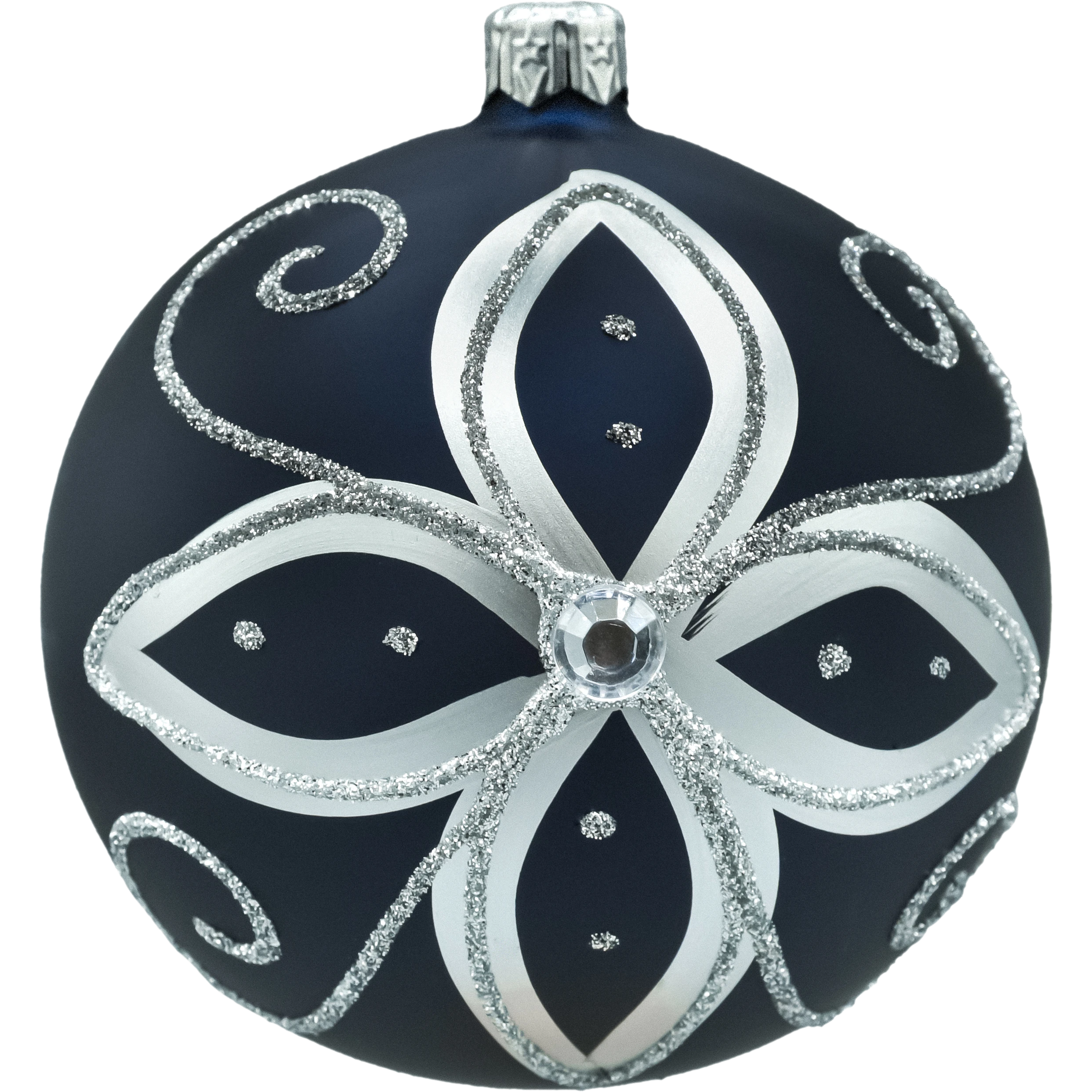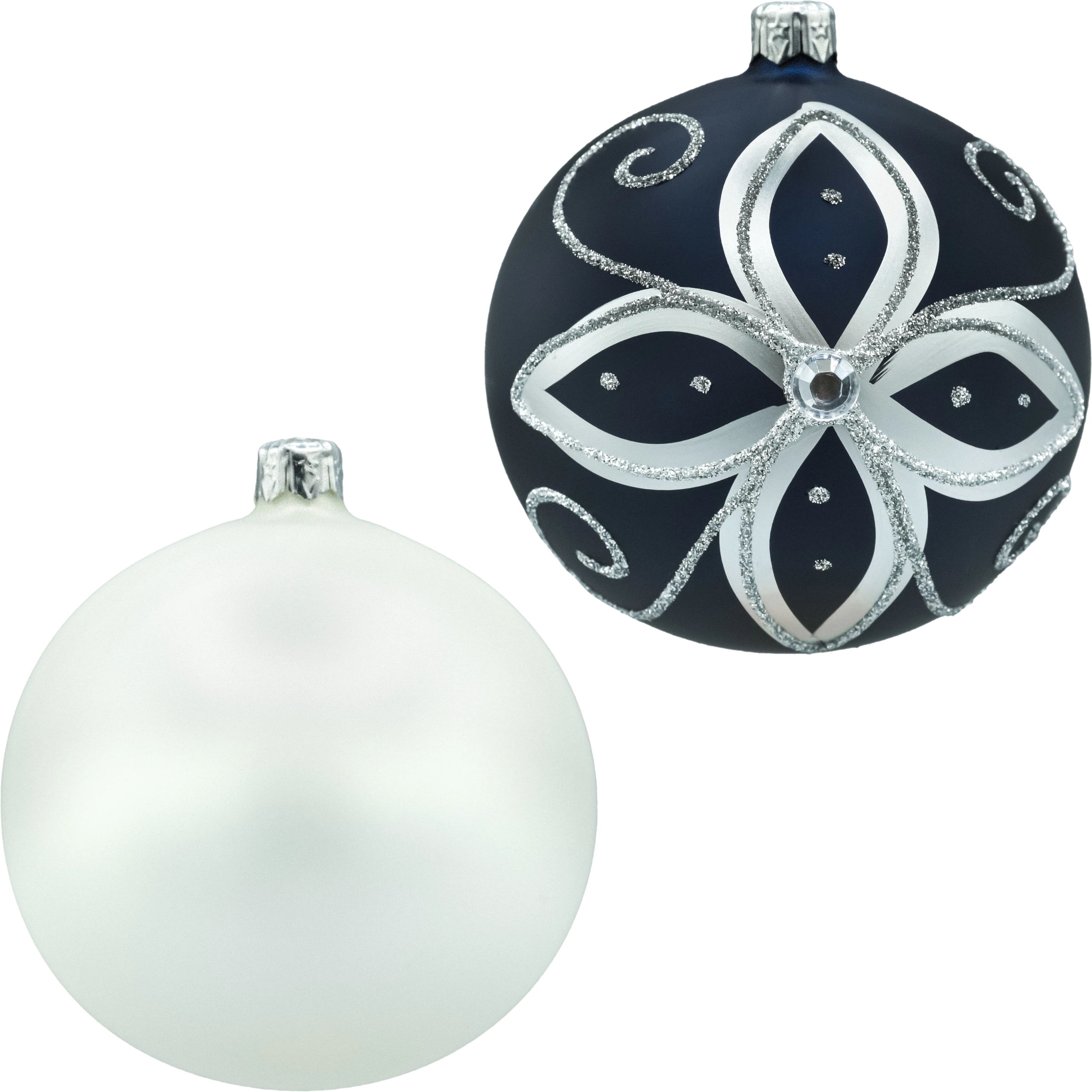 Wytworny komplet czterech ręcznie zdobionych bombek, który łączy ponadczasową elegancję perłowej bieli z głębokim granatem i lśniącym srebrem. Dwie bombki mają gładkie, matowo-perłowe wykończenie (idealne do „uspokojenia” kompozycji na choince), a dwie zdobione są florystycznym rozetowym motywem ze srebrnym brokatem, metalicznymi listkami oraz szlifowanym oczkiem-kryształkiem w centrum. Całość tworzy spójny, luksusowy zestaw w stylu glamour/classic, który pięknie współgra zarówno z zieloną jodłą, jak i z nowoczesnymi, sztucznymi choinkami.