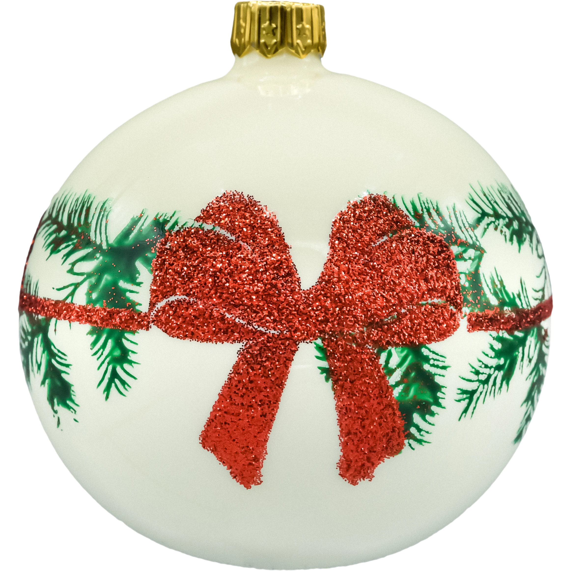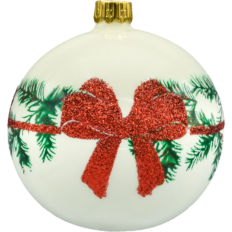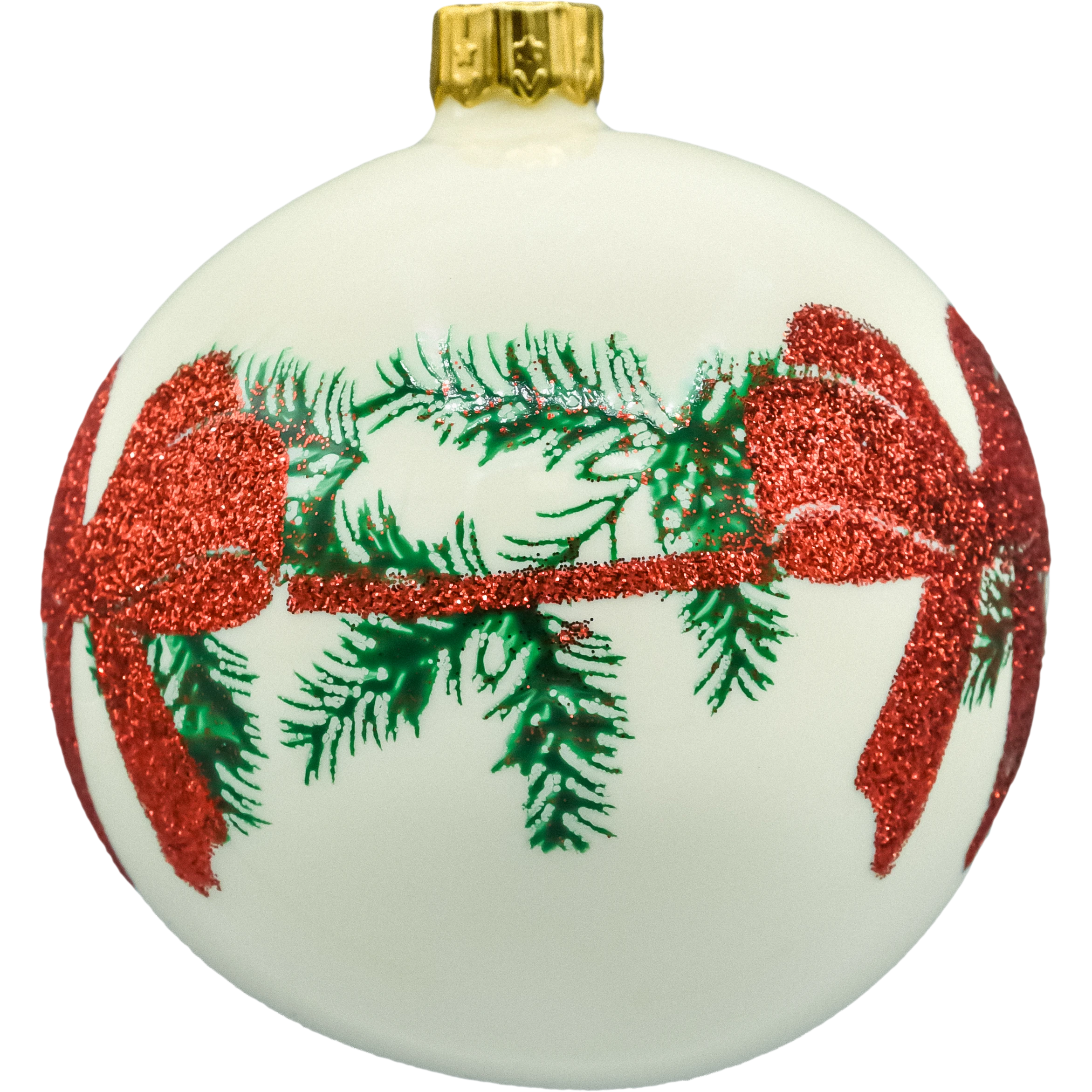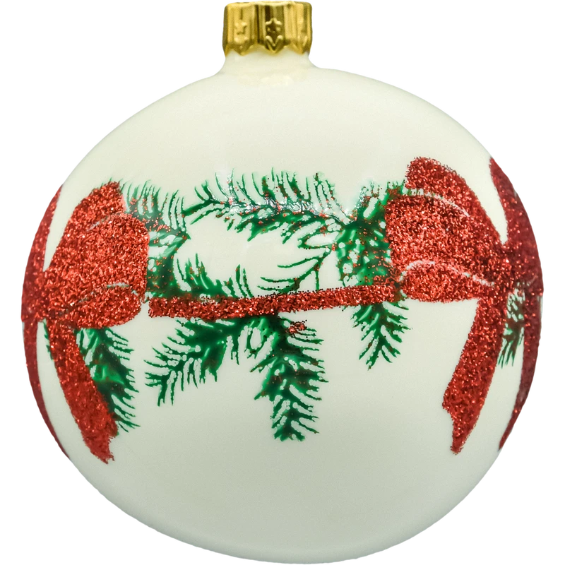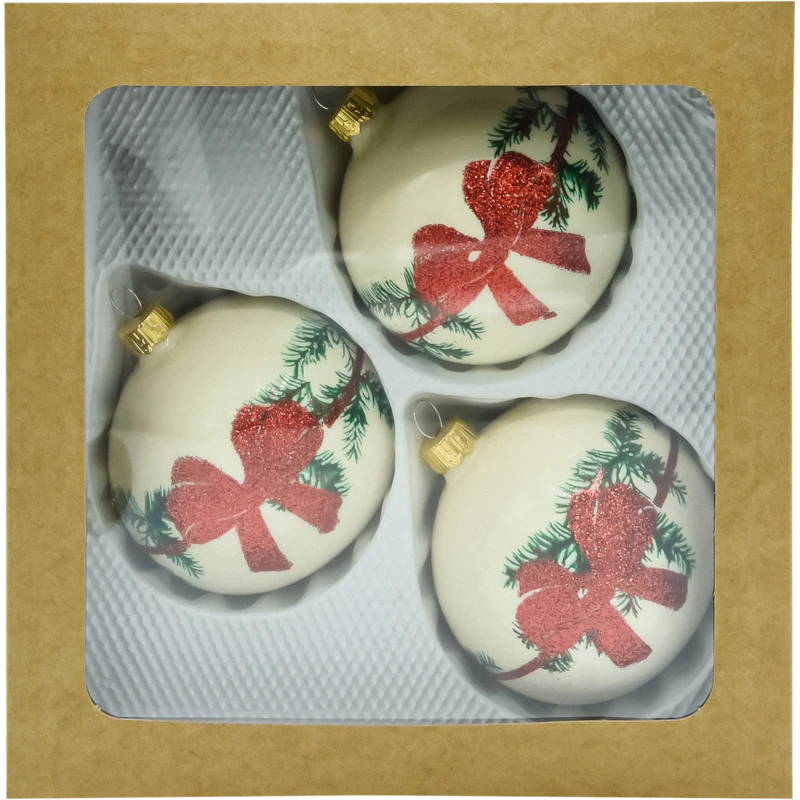 Zestaw 3 szklanych bombek 8 cm – kremowe, ręcznie dekorowane gałązkami świerku i czerwonymi brokatowymi kokardami. Klasyczna ozdoba choinkowa w pudełku kraft, idealna na prezent i do tradycyjnych aranżacji red & green. Eleganckie polskie rękodzieło.