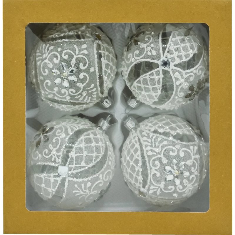 Ekskluzywny zestaw 4 szklanych bombek 10 cm w bieli i srebrze. Ręcznie zdobione koronkowym reliefem z brokatu i kryształkami, zachwycają połyskiem i klasą. Idealne bombki na choinkę glamour, do stroików i na prezent – w eleganckim pudełku.