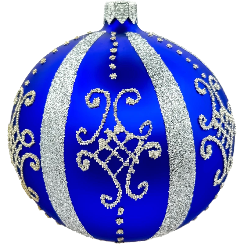 Elegancki komplet niebieskich bombek choinkowych o średnicy 10 cm. Każda bombka została wydmuchana z polskiego szkła i ręcznie malowana, a następnie zdobiona srebrnymi pasami brokatowymi oraz złotymi, perlistymi ornamentami w stylu pałacowym. Głębokie, szafirowe wykończenie (mat + delikatny połysk) pięknie kontrastuje z błyskiem srebra i złota, dzięki czemu ozdoby wyraźnie łapią światło lampek LED i dodają choince blasku w stylu glamour.