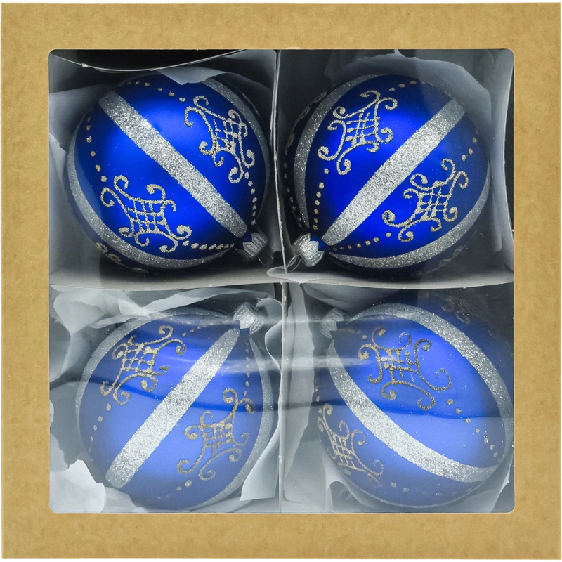 Zestaw 4 szklanych bombek 10 cm w kolorze royal blue z srebrnymi pasami brokatu i złotymi ornamentami. Ręcznie wykonane polskie bombki choinkowe w stylu glamour, zapakowane w pudełko kraft – idealne na prezent i do eleganckich aranżacji świątecznych.