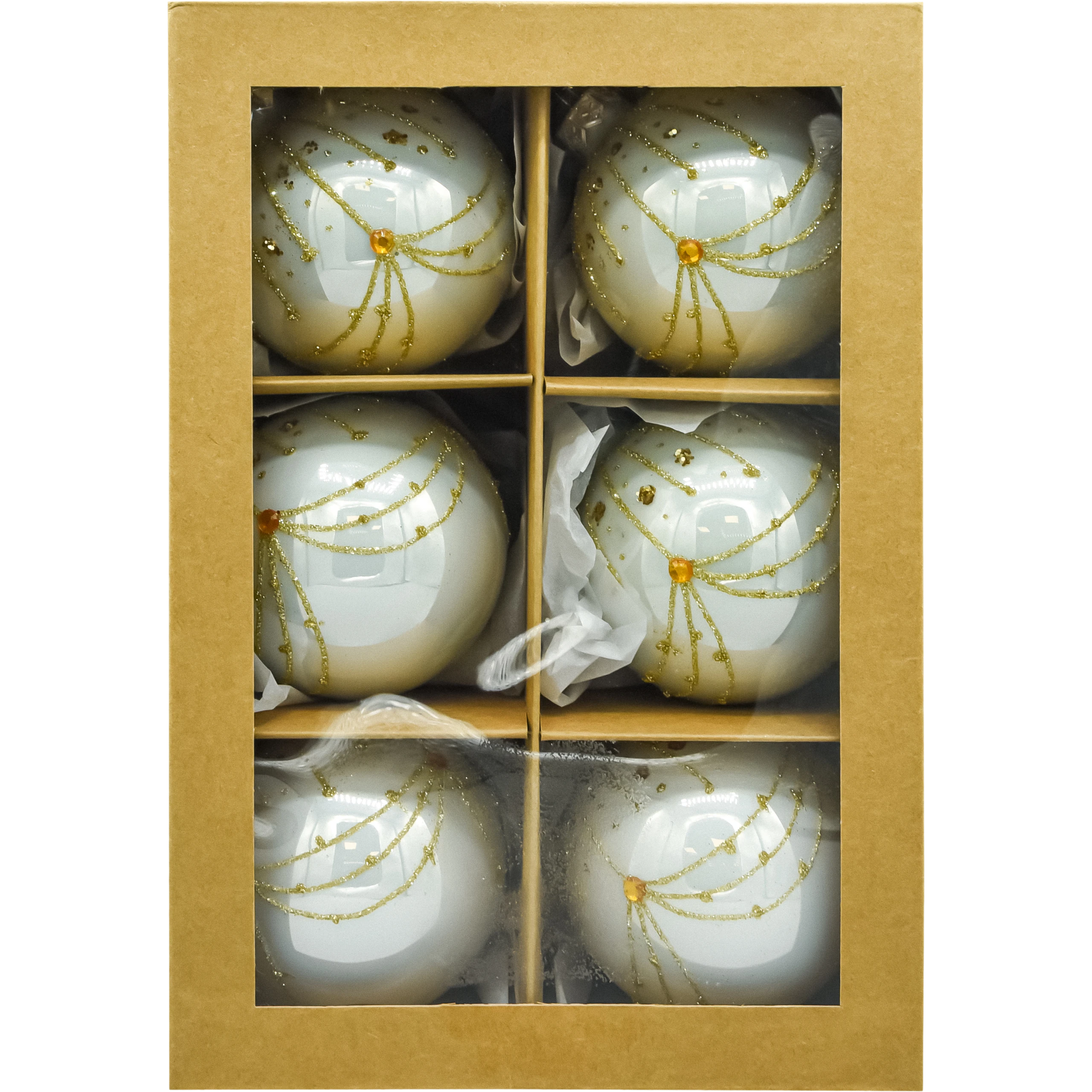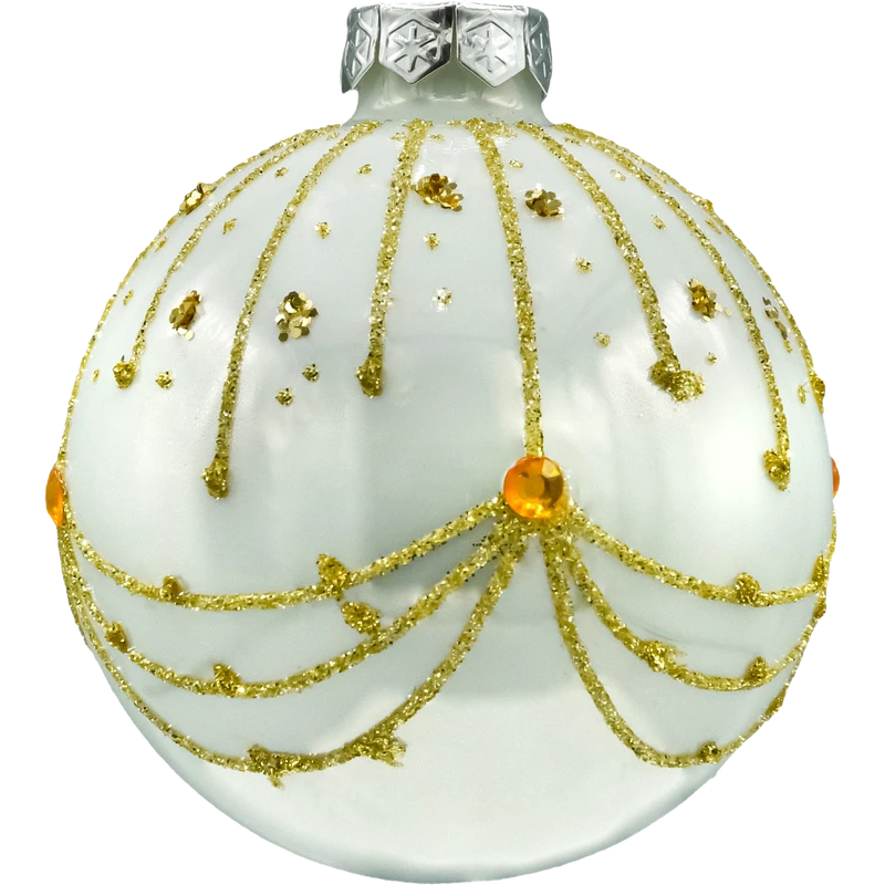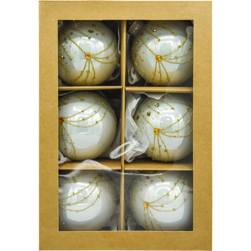 Komplet 6 bombek szklanych 8 cm w perłowej bieli, ręcznie zdobionych złotym brokatem i bursztynowymi kryształkami. Klasyczne kule ze srebrną koronką, w pudełku prezentowym z przegródkami. Idealne bombki choinkowe do eleganckich aranżacji w stylu glamour i klasycznym, na choinkę, stroik i wieniec.