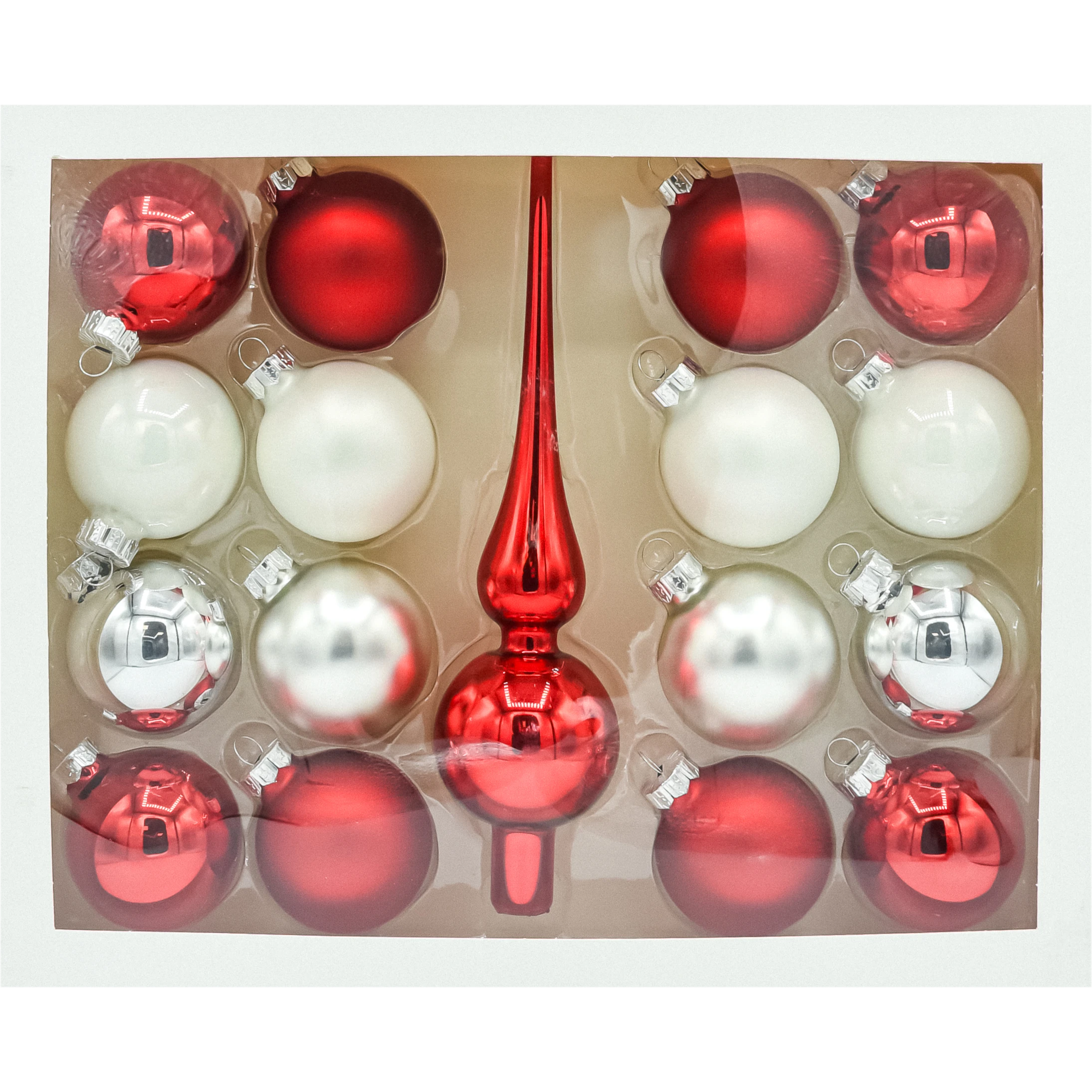 Elegancki zestaw szklanych bombek z czubkiem: 16 kul w kolorach czerwieni, bieli i srebra (mix mat/połysk) + smukły szpic w czerwieni. Ręcznie dmuchane i malowane bombki, gotowe do efektownego ubrania choinki. Idealne do domu, biura i na prezent.