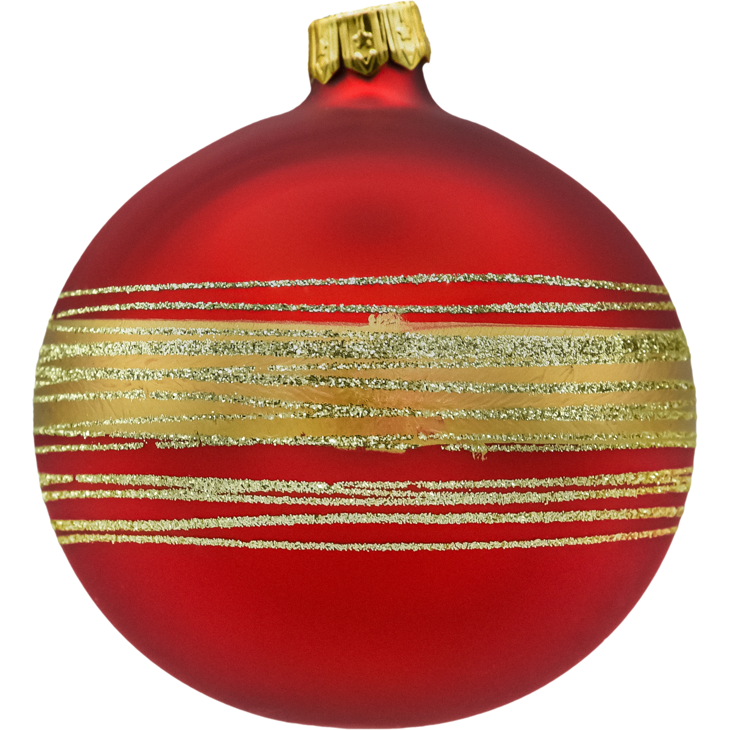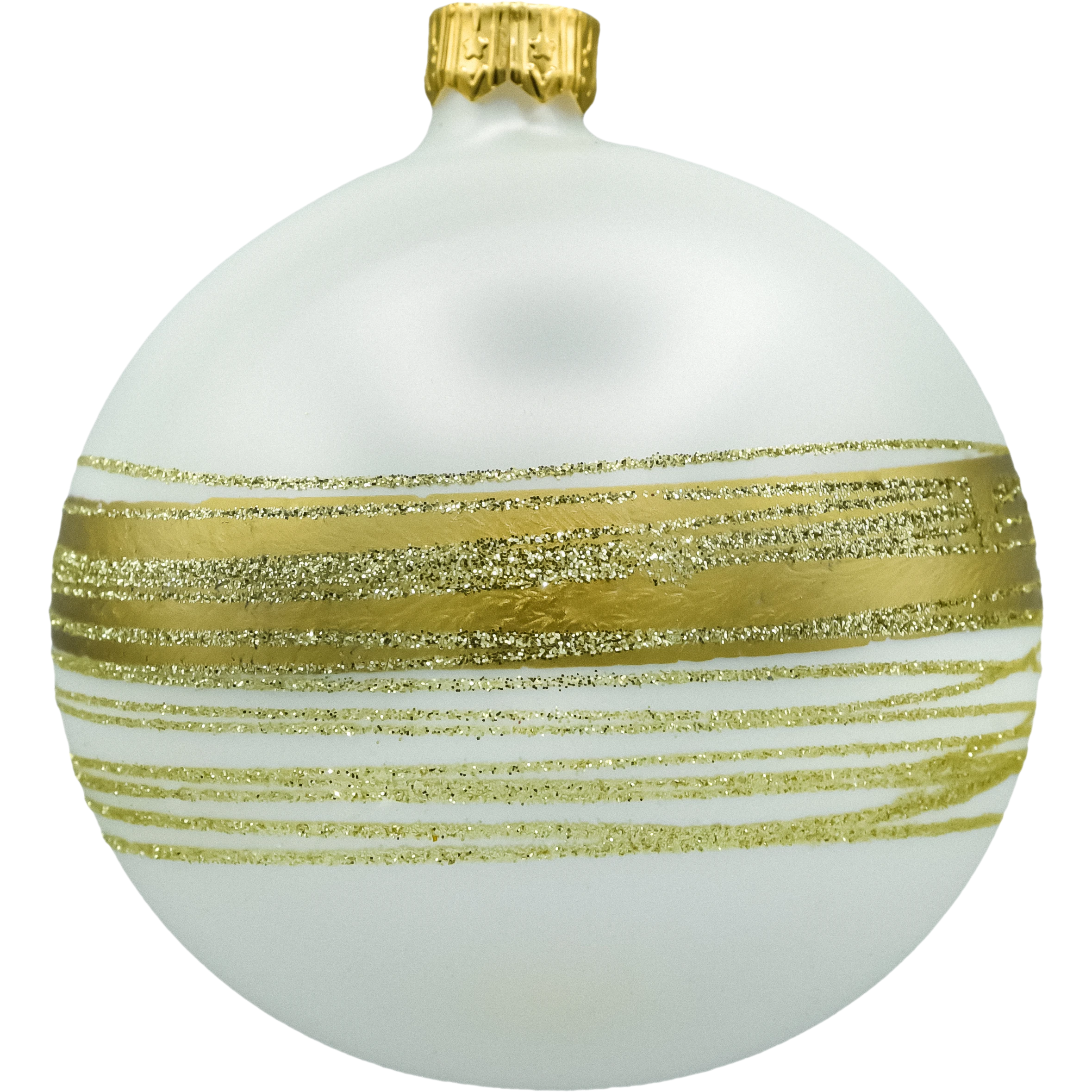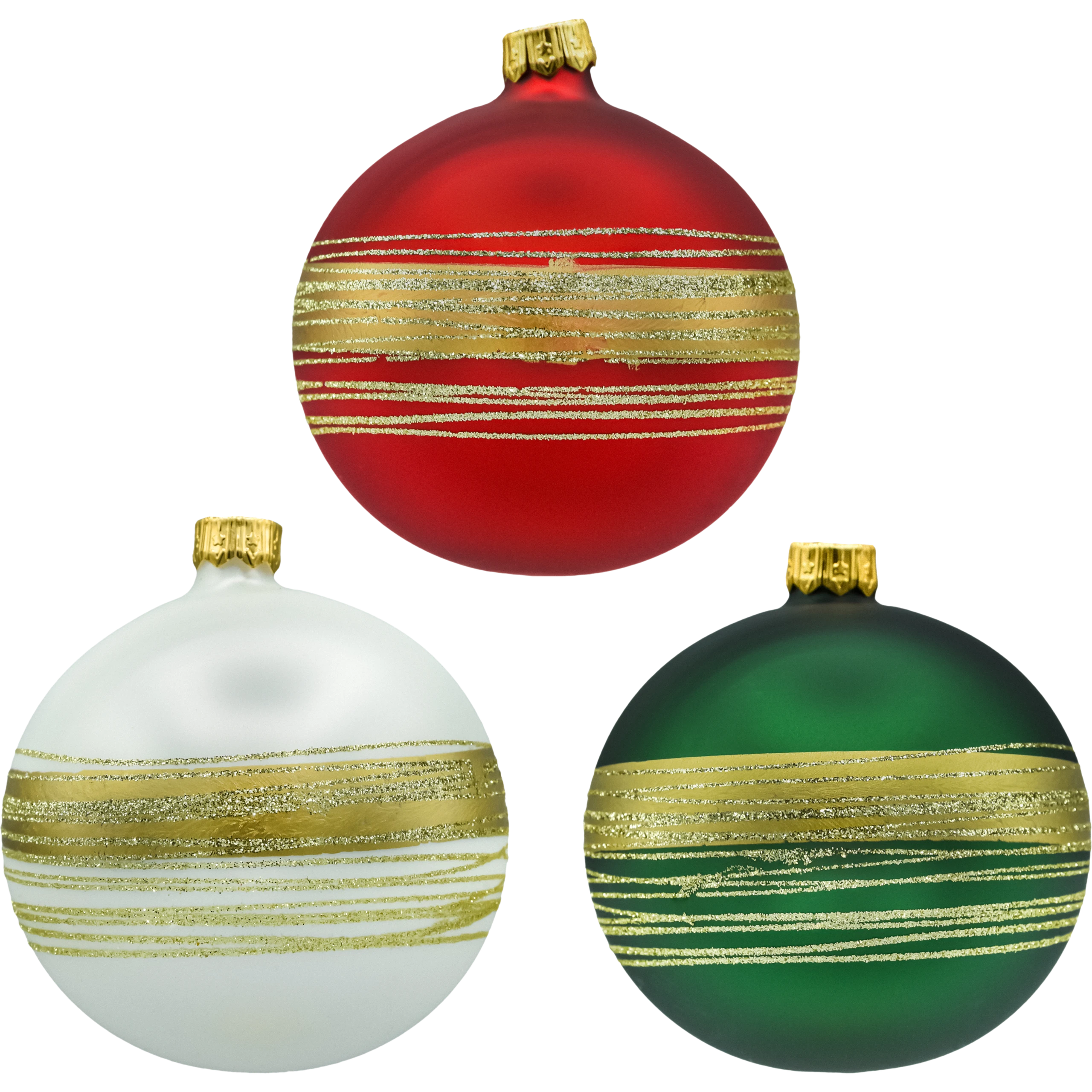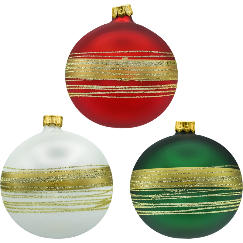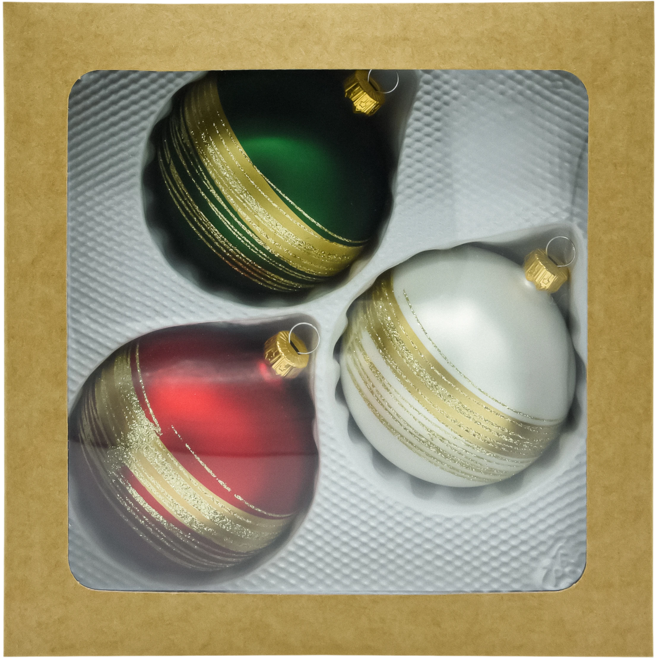 Zestaw 3 ręcznie dekorowanych bombek szklanych 8 cm w kolorach czerwonym, zielonym i białym, zdobionych złotymi pasami i brokatem. Klasyka świątecznego stylu – idealna na choinkę, do stroików i na prezent. Polskie szkło dmuchane, eleganckie opakowanie.