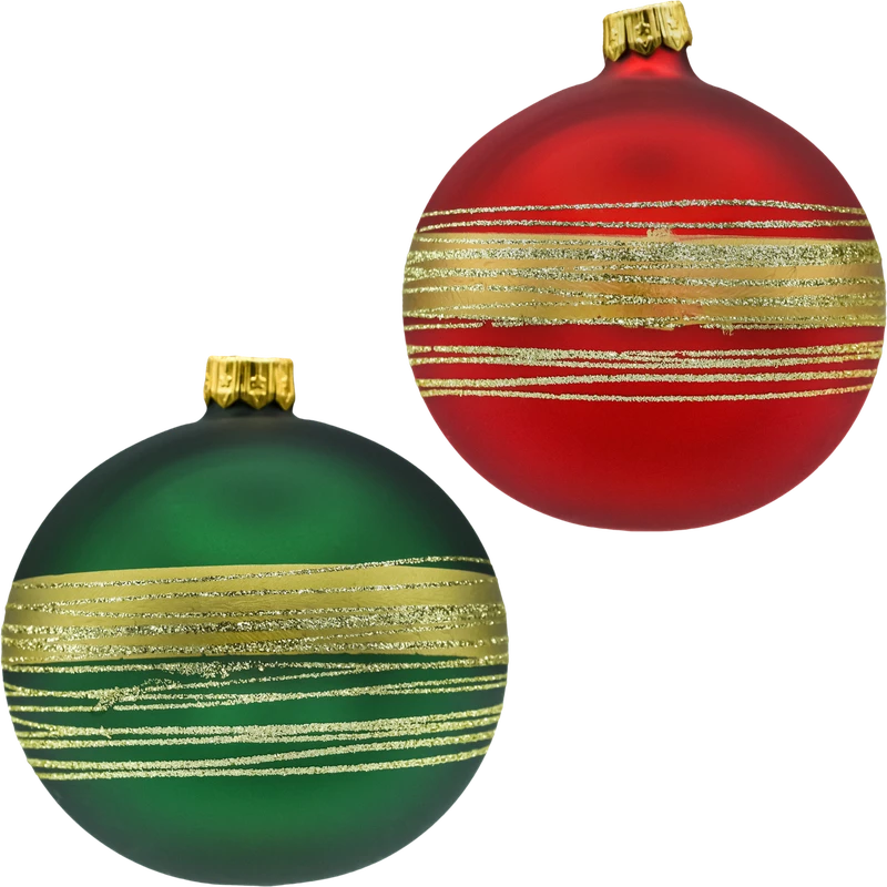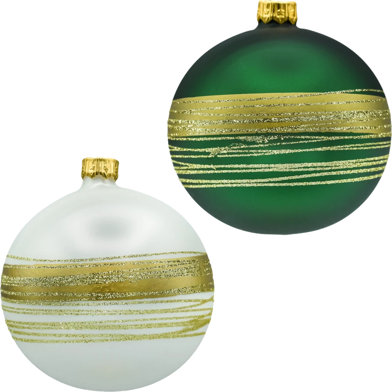 Klasyczne, a zarazem efektowne bombki choinkowe z polskiego szkła dmuchanego. W zestawie znajdują się 3 sztuki o średnicy 8 cm – matowa czerwień, głęboka zieleń i elegancka biel. Każda kula została ręcznie wykończona złotymi pasami oraz drobnym brokatem, który pięknie odbija światło lampek. Harmonijna kolorystyka czerwieni, zieleni i złota tworzy ponadczasowy, świąteczny duet, dzięki któremu zestaw bez trudu dopasujesz do większości aranżacji – od tradycyjnej choinki w salonie po styl glamour w hotelowym lobby.