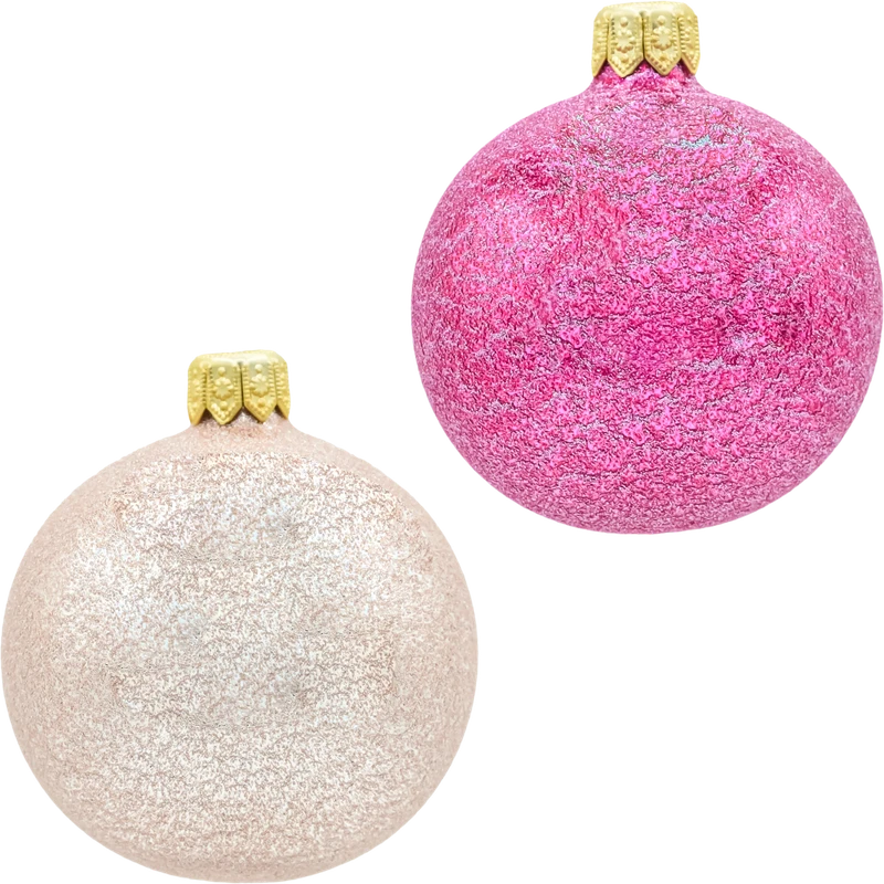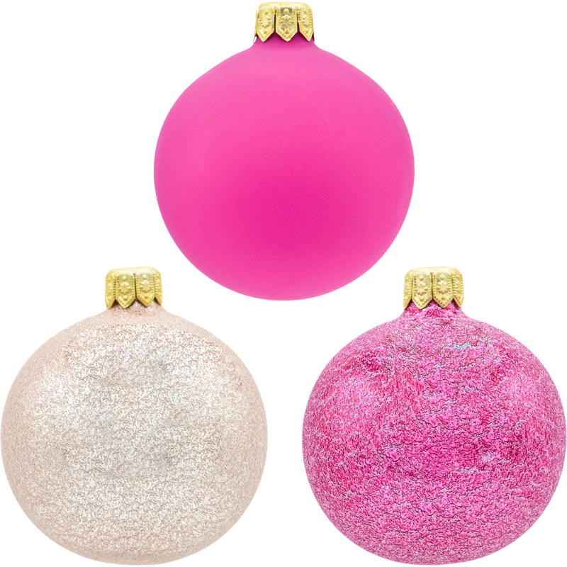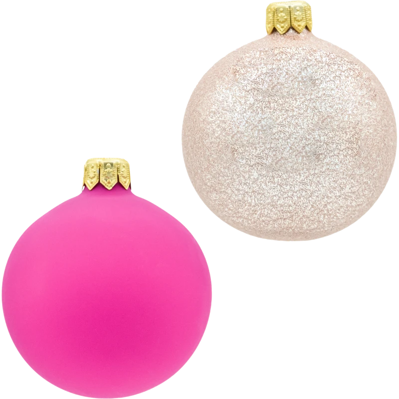 Zestaw 24 szklanych bombek choinkowych Ø 6 cm w modnej, różowej palecie – od intensywnej fuksji po delikatny róż i różowe złoto. Komplet łączy wykończenia matowe i mocno iskrzące brokatem, dzięki czemu dekoracje pięknie grają światłem wśród lampek i tworzą spójny, elegancki efekt na choince. Każda bombka ma złotą koronę z oczkiem, które pasuje do standardowych haczyków, żyłki lub wstążki. Bombki zapakowane są w estetyczne pudełko – ułatwia bezpieczne przechowywanie po sezonie i sprawia, że zestaw świetnie nadaje się na prezent.