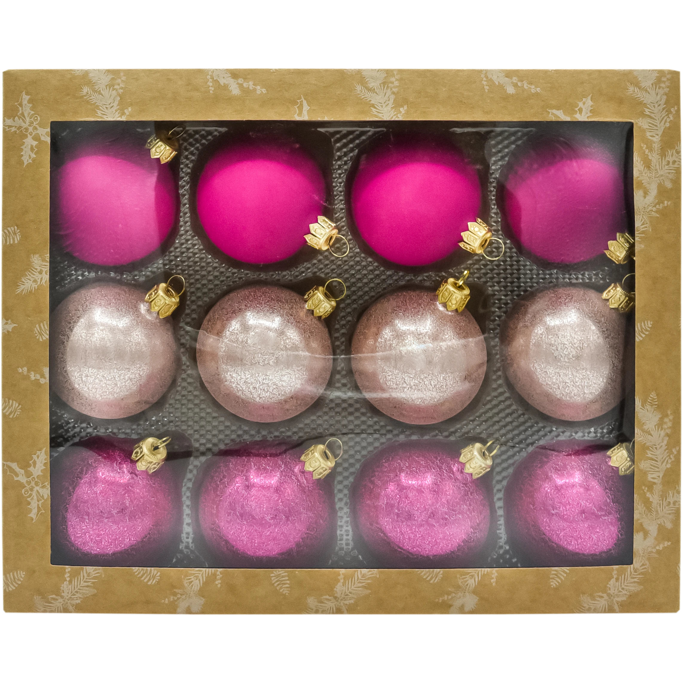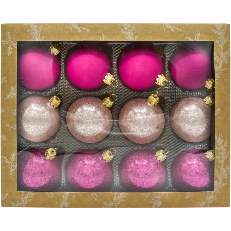 Elegancki zestaw 24 szklanych bombek 6 cm w odcieniach fuksji, pudrowego różu i różowego złota. Mix matu i połyskującego brokatu gwarantuje piękny blask choinki, a złote zawieszki i pudełko do przechowywania czynią komplet praktycznym i gotowym do wręczenia prezentem. Idealne bombki choinkowe szklane do dekoracji w stylu glamour i modern.