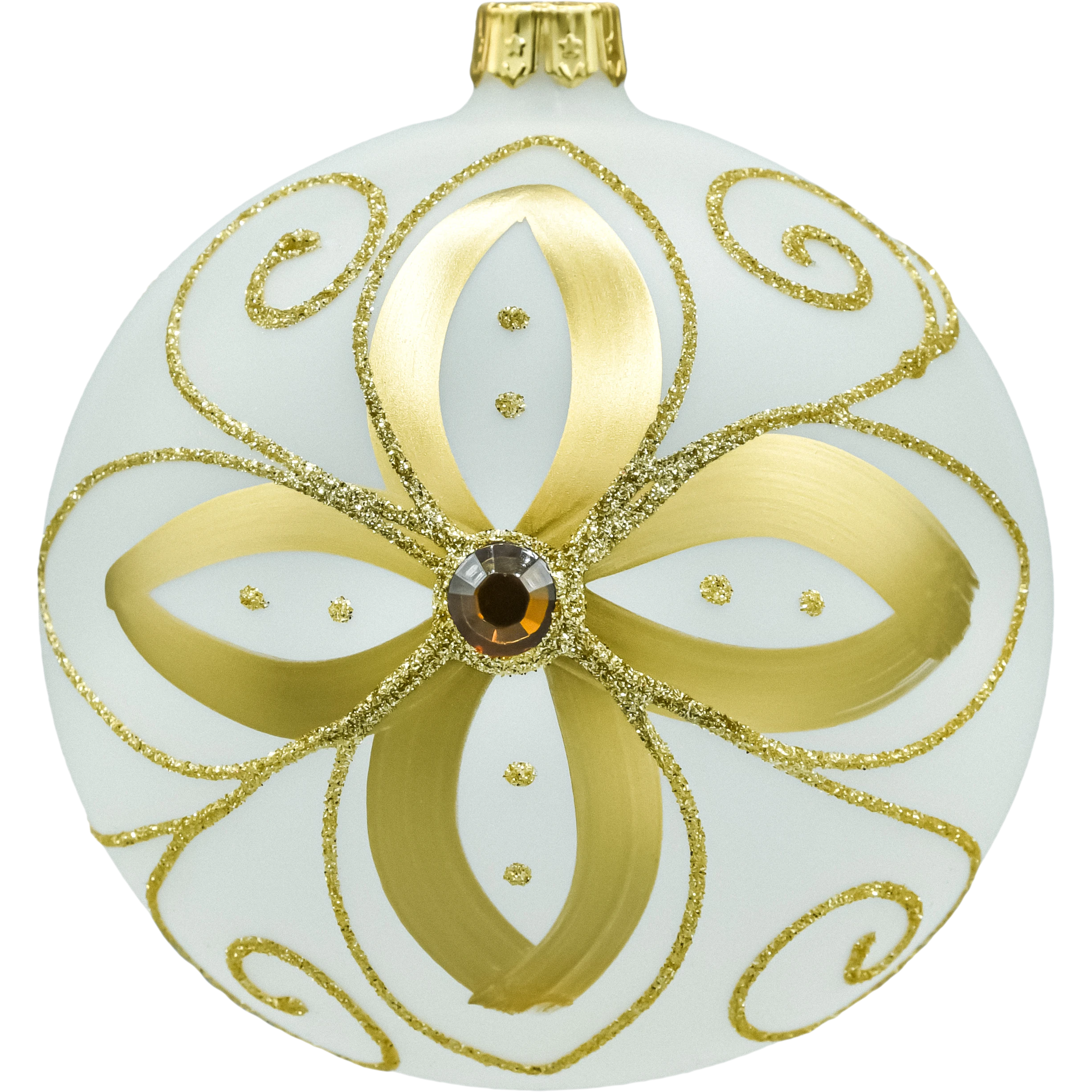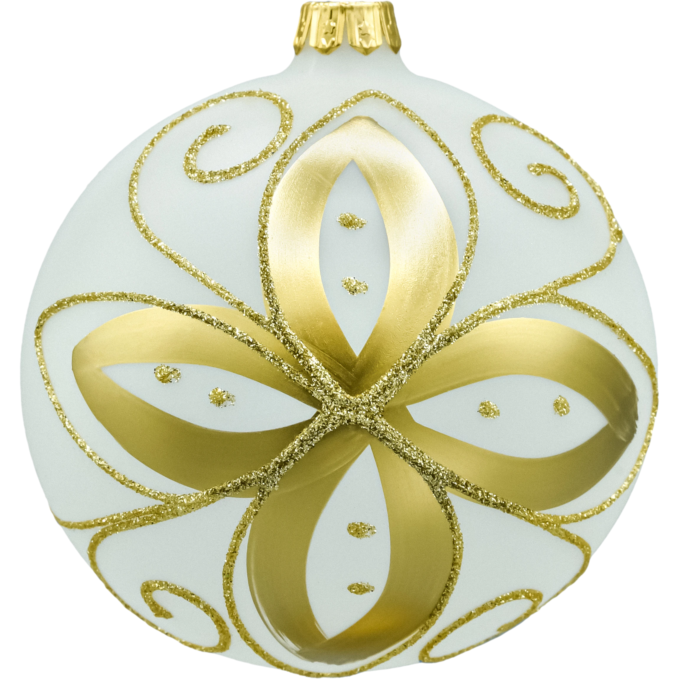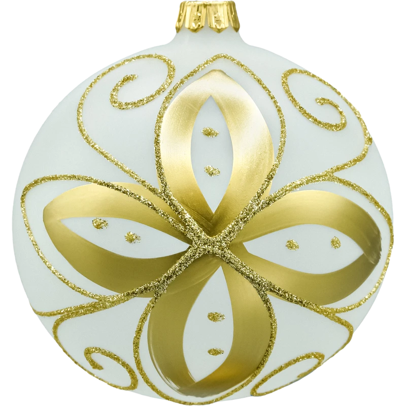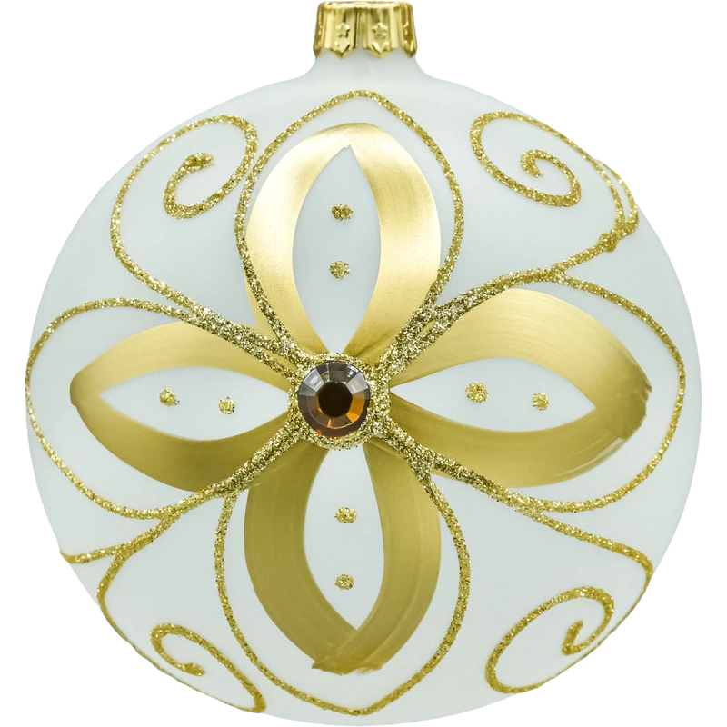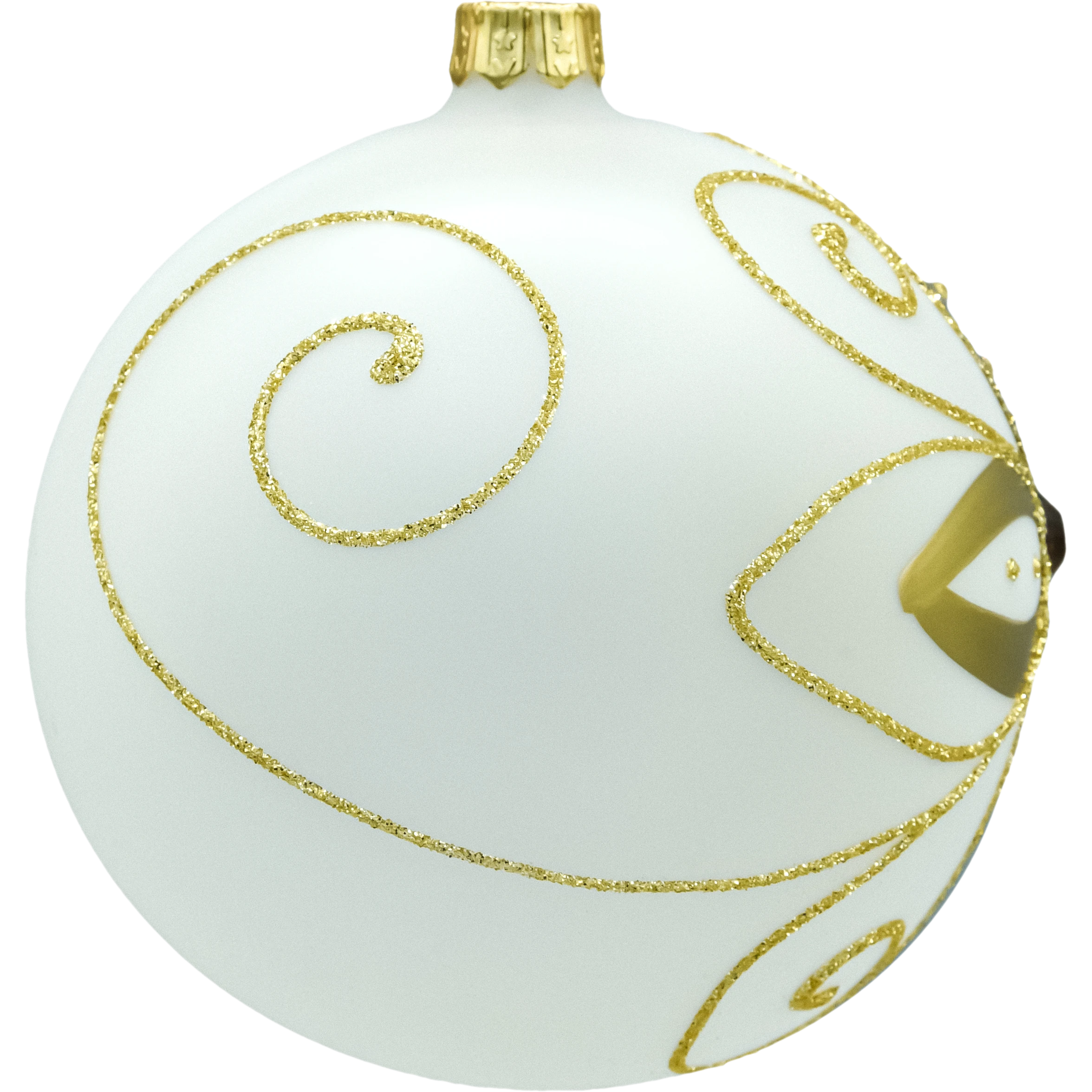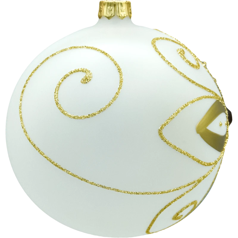 Elegancki zestaw 4 szklanych bombek w bieli i złocie – ręcznie dmuchanych i malowanych w polskiej manufakturze. Satynowa kula z brokatową rozetą i złotymi zawijasami doda Twojej choince klasy glamour. Idealne na prezent i do dekoracji domu, stołu i stroików.