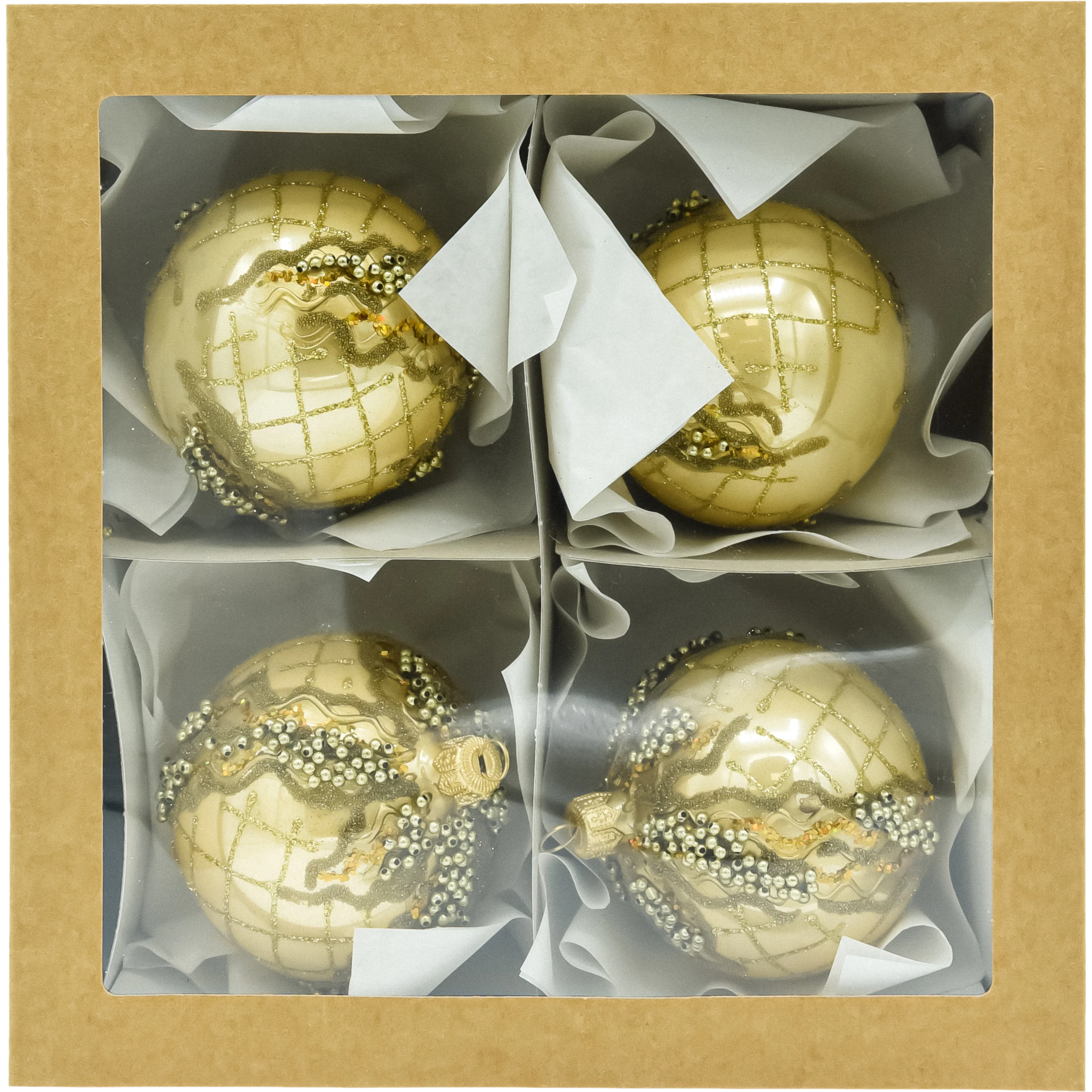 Ekskluzywny zestaw 4 szklanych bombek 8 cm w kolorze szampańskiego złota. Ręcznie malowane i bogato zdobione brokatem, mikrokoralikami oraz perłową aplikacją 3D, tworzą biżuteryjny akcent na choince, w stroiku i dekoracjach stołu. Eleganckie pudełko kraft z okienkiem sprawia, że to również gotowy prezent świąteczny.