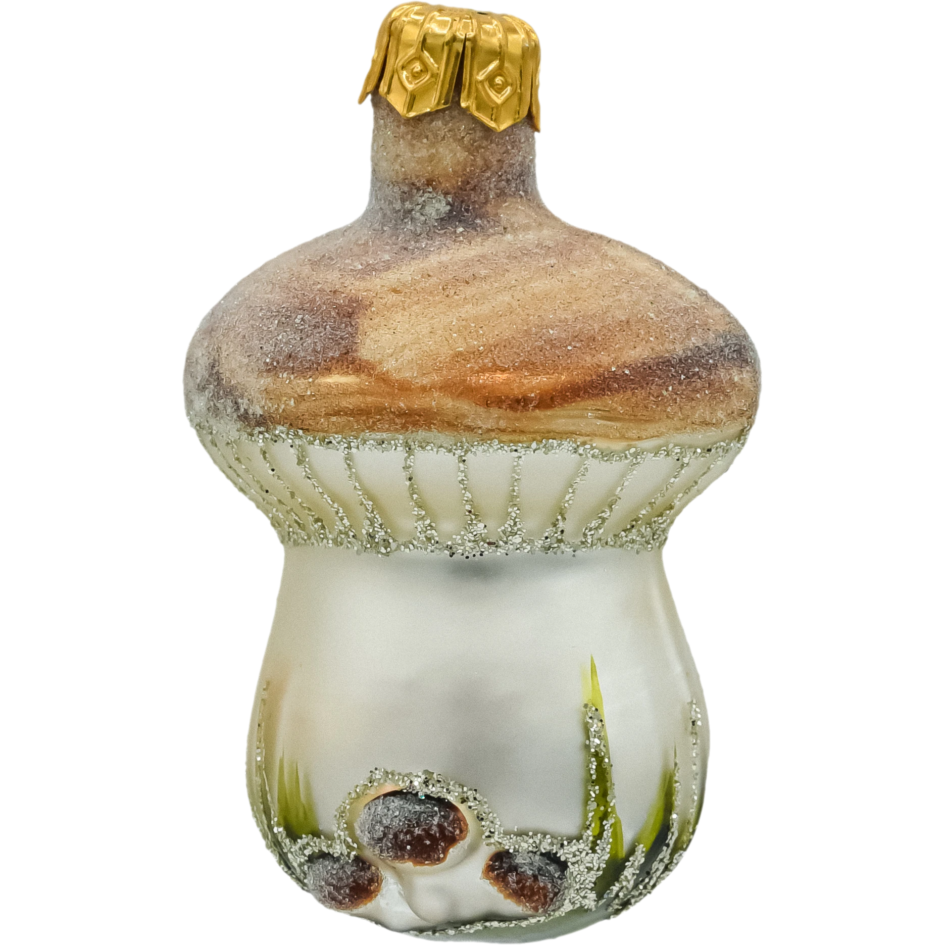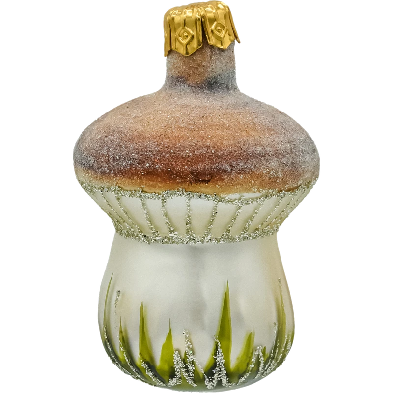Górna część bombki – kapelusz borowika – została utrzymana w ciepłych odcieniach brązu z efektem przyprószenia delikatnym brokatem, który pięknie mieni się w świetle choinkowych lampek. Blaszki kapelusza zaznaczone zostały srebrnym brokatem, a trzon ozdobiono malowanymi trawkami i trzema maleńkimi grzybkami u podstawy – dodając całości uroku i realizmu.