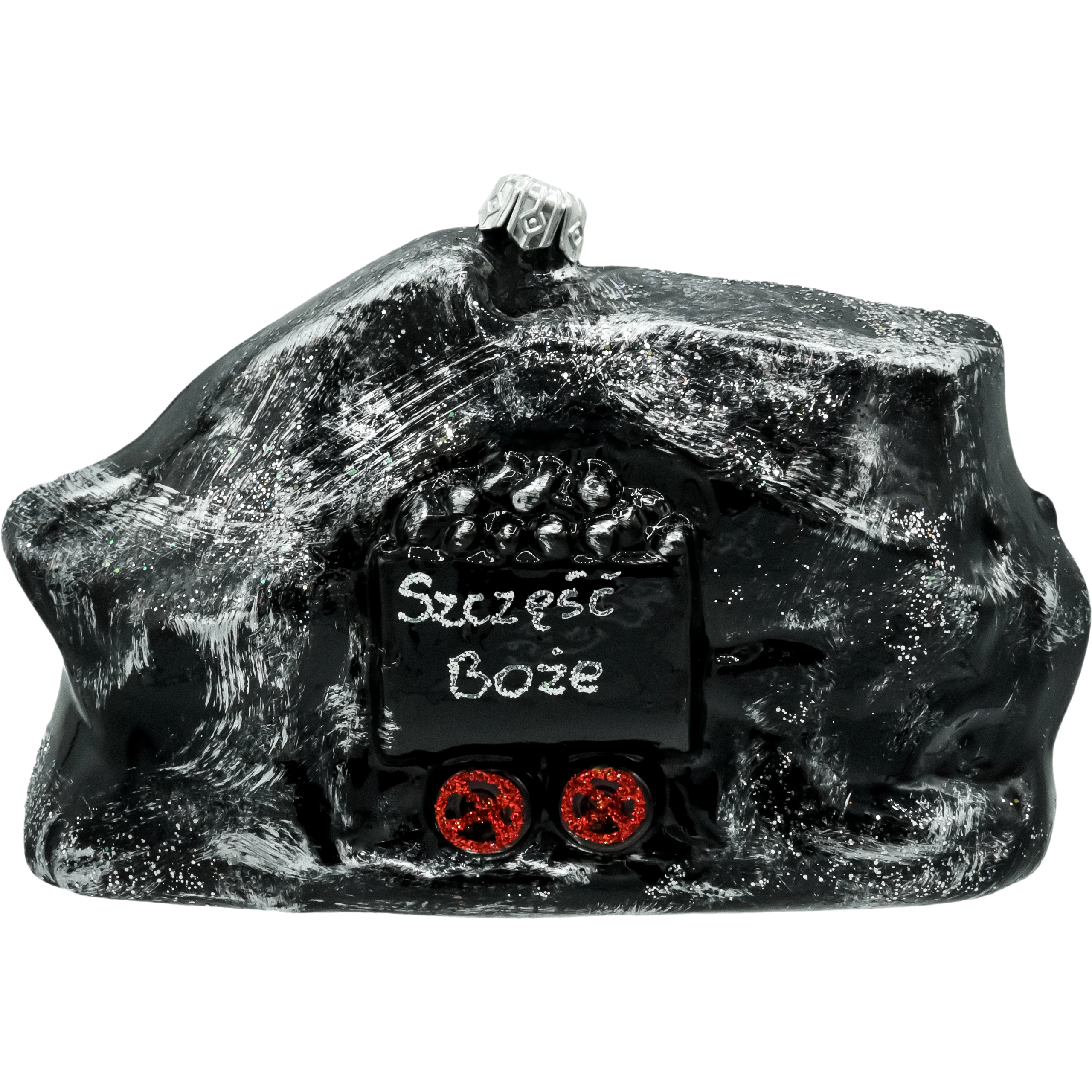 Bombka „Bryła węgla z wózkiem – Szczęść Boże” to unikalna dekoracja choinkowa, która odzwierciedla tradycje górnicze i polskie dziedzictwo. Ręcznie wykonana z najwyższej jakości szkła, ozdobiona realistycznymi detalami i napisem „Szczęść Boże”, bombka symbolizuje ciężką pracę górników oraz ich wkład w budowanie społeczności. Czerń węgla, srebrne refleksy oraz kontrastujące czerwone koła wózka tworzą niepowtarzalny design, który przyciąga uwagę i wprowadza na choinkę nutę tradycji.