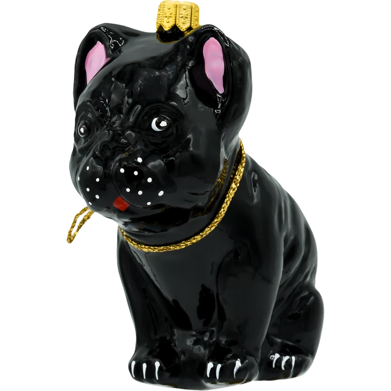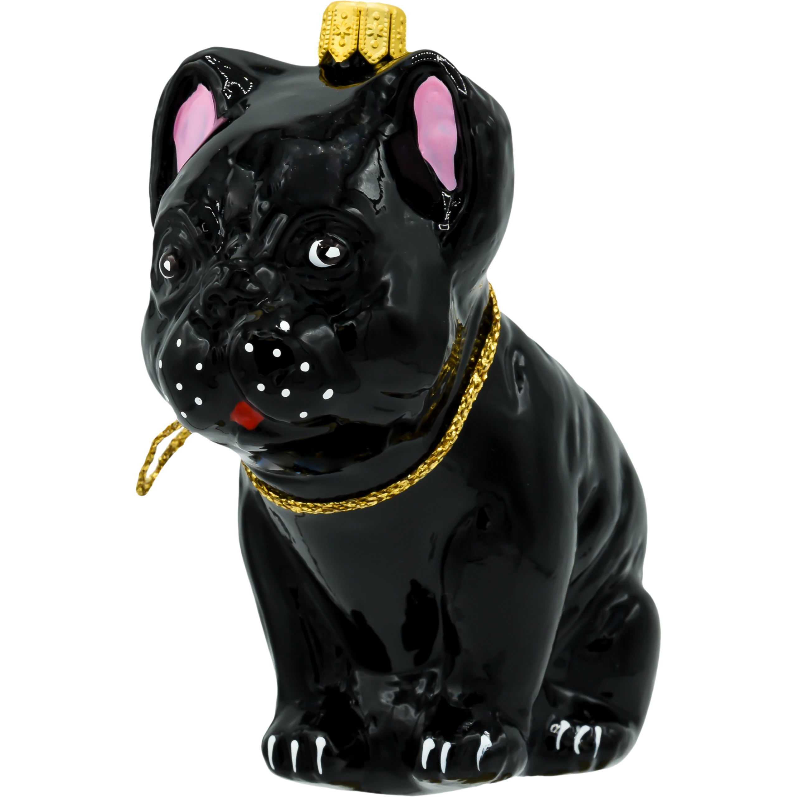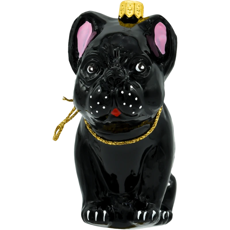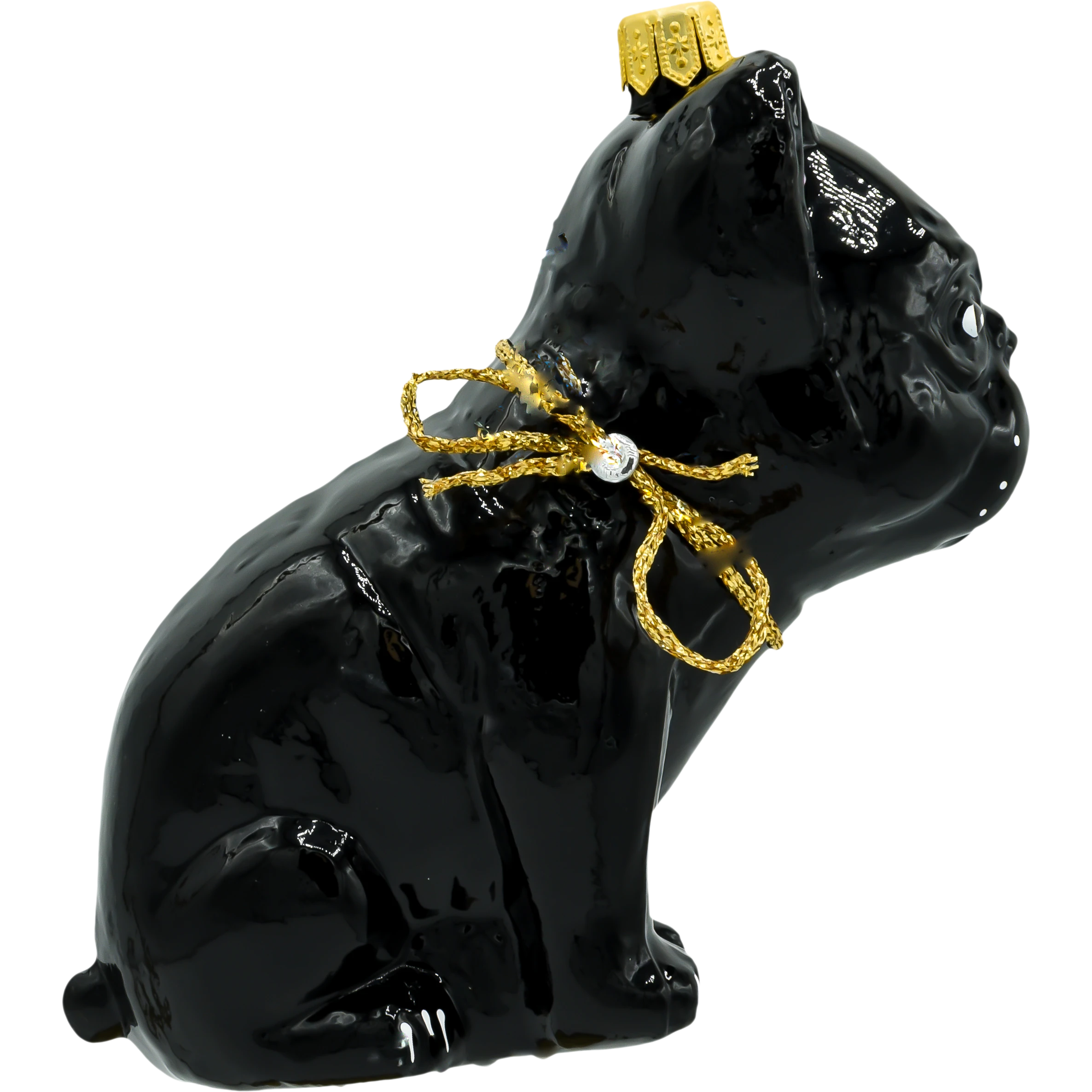 Ręcznie malowana bombka choinkowa w kształcie czarnego buldoga francuskiego. Szklana ozdoba dla miłośników psów i oryginalnych dekoracji świątecznych – idealna na choinkę.