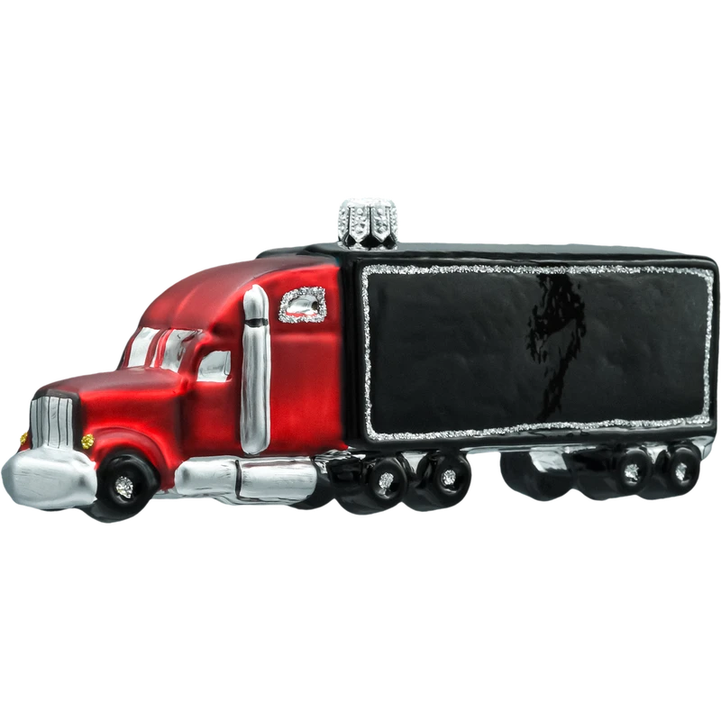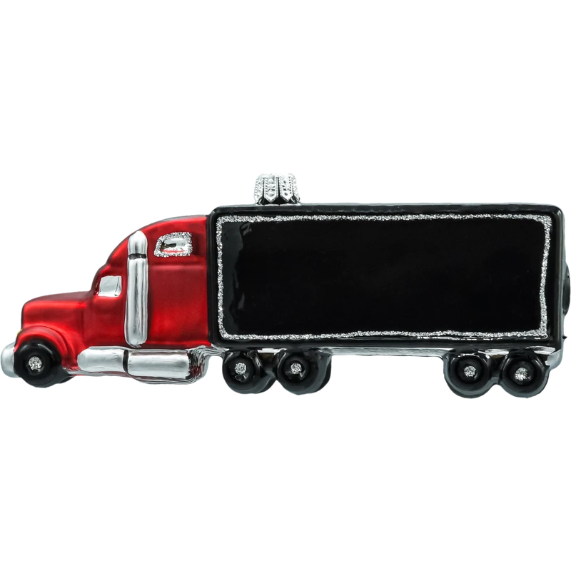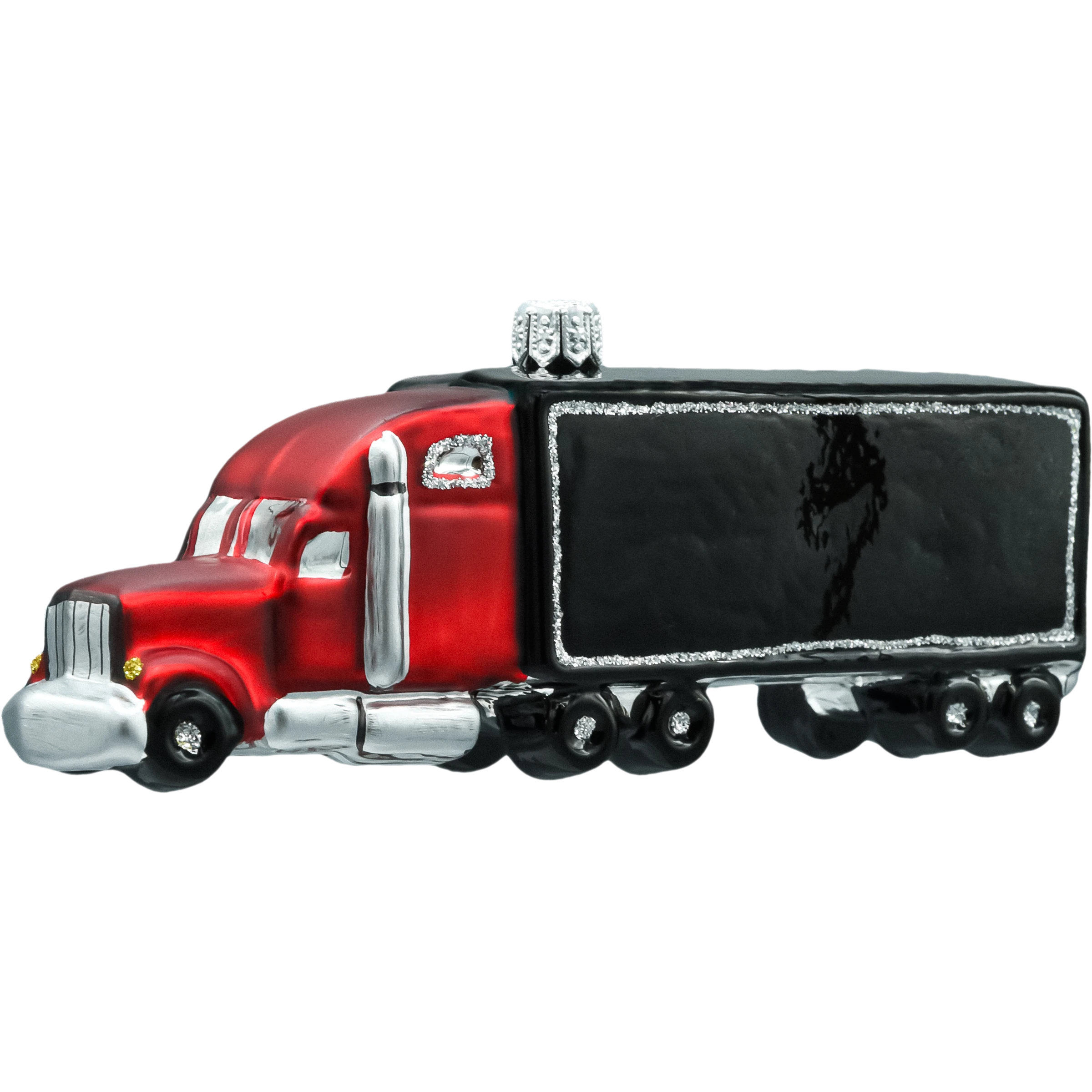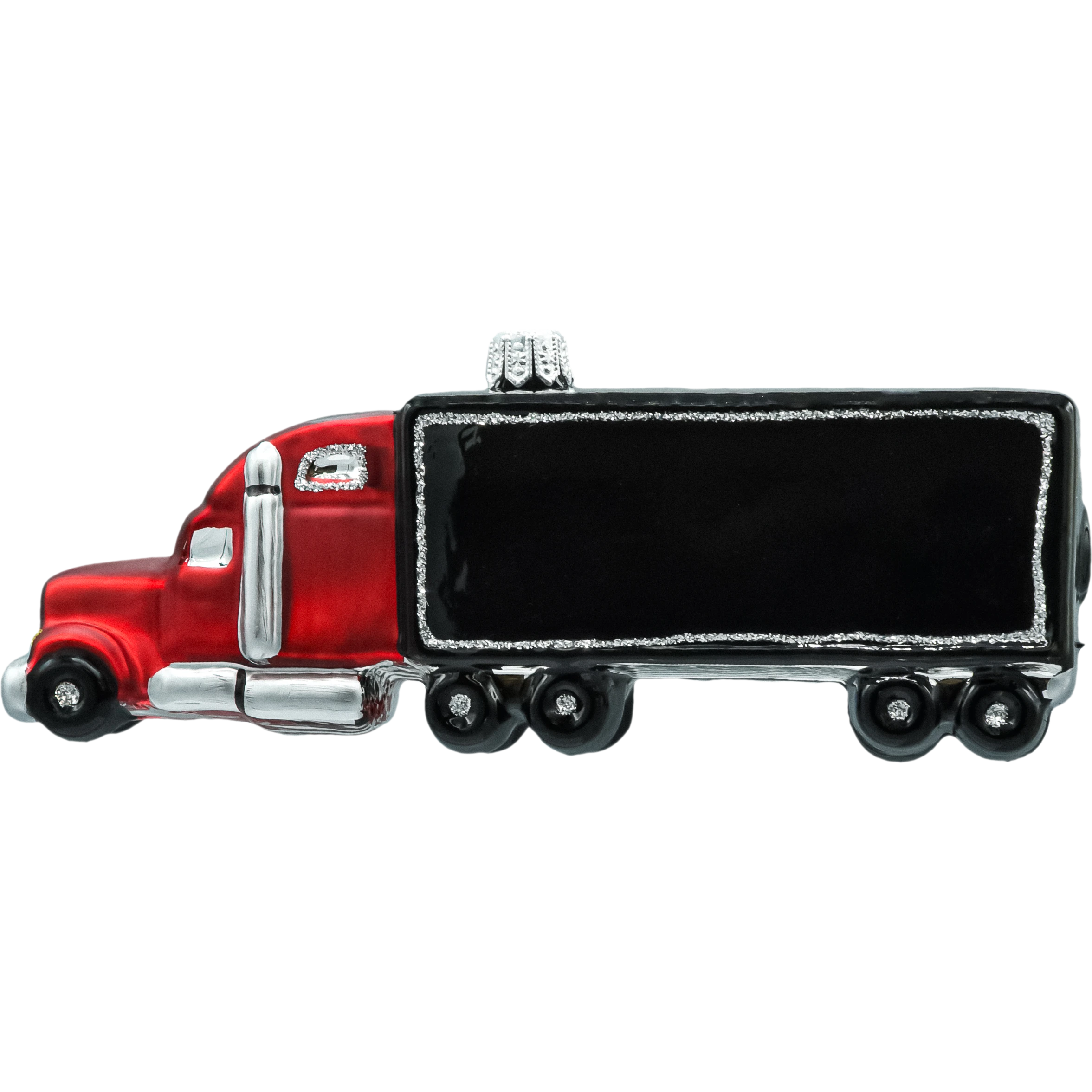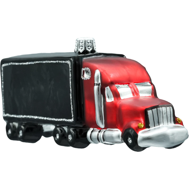 Ręcznie malowana szklana bombka TIR – czerwony truck z czarną naczepą. Połyskujące, brokatowe detale, idealny prezent dla kierowcy ciężarówki i fana motoryzacji.