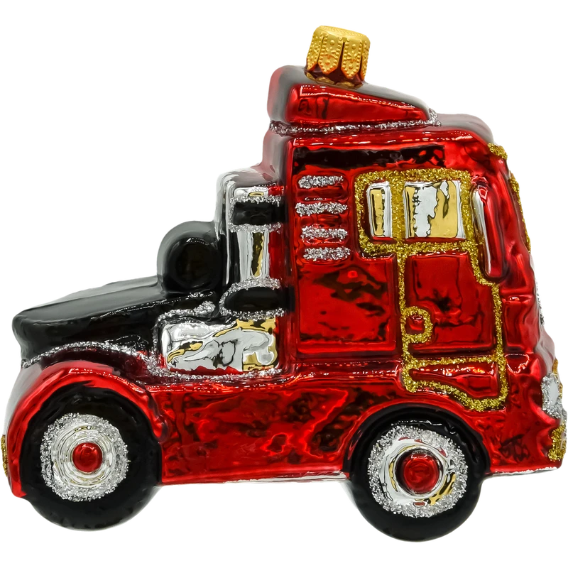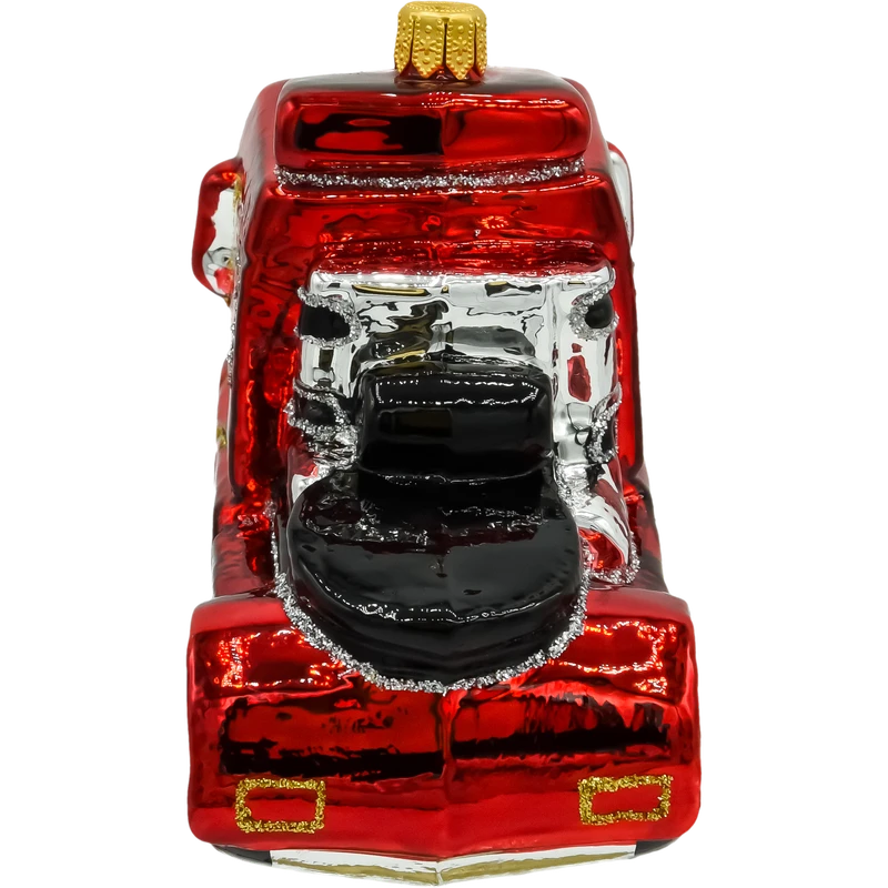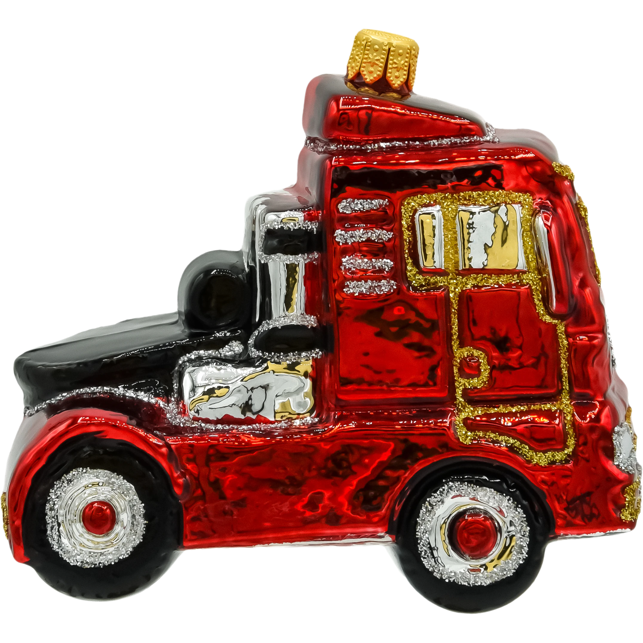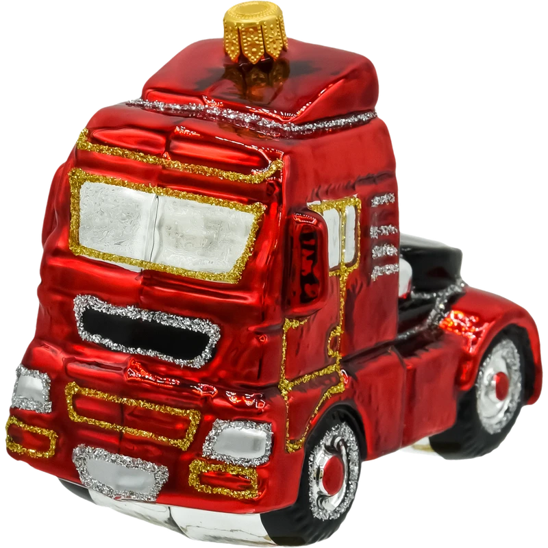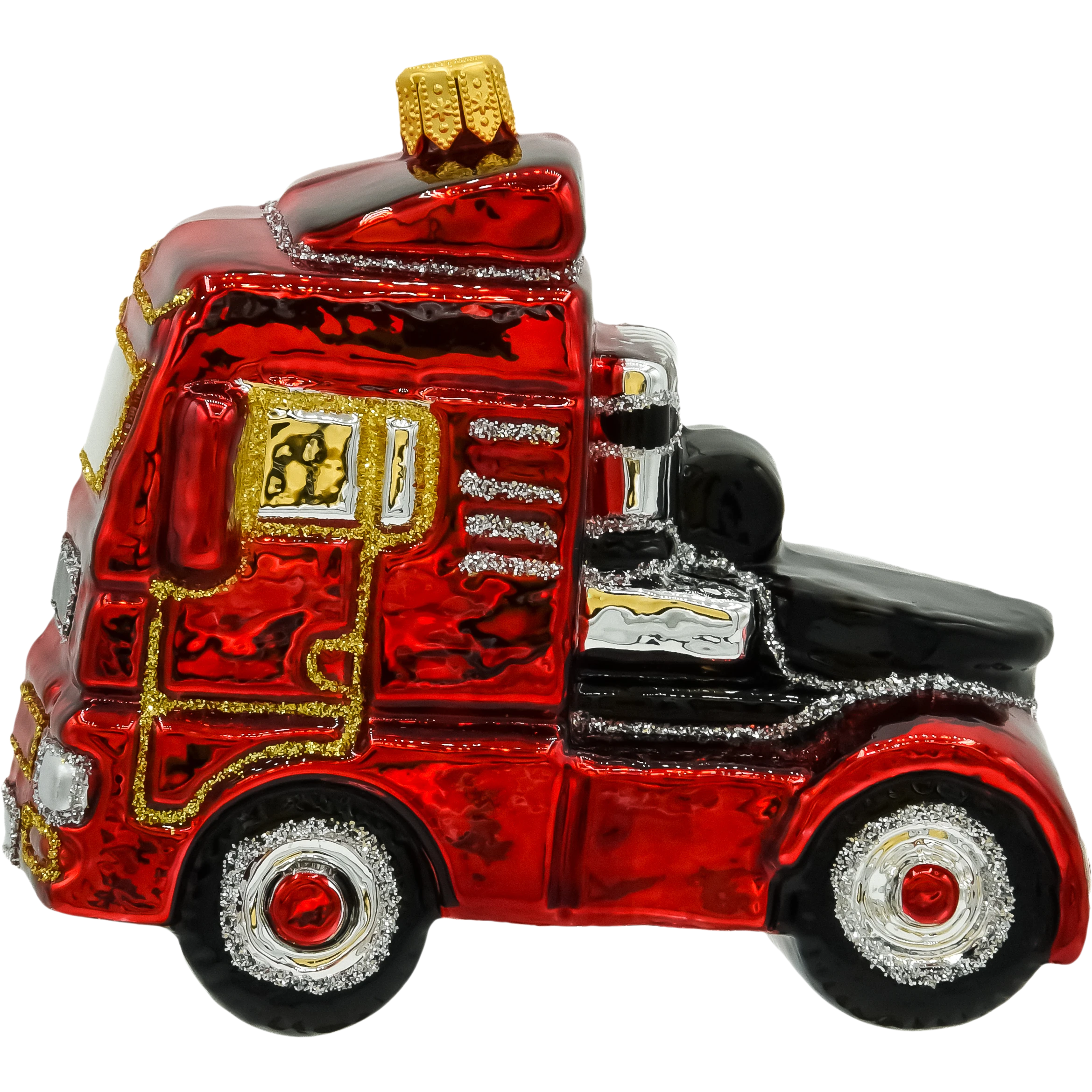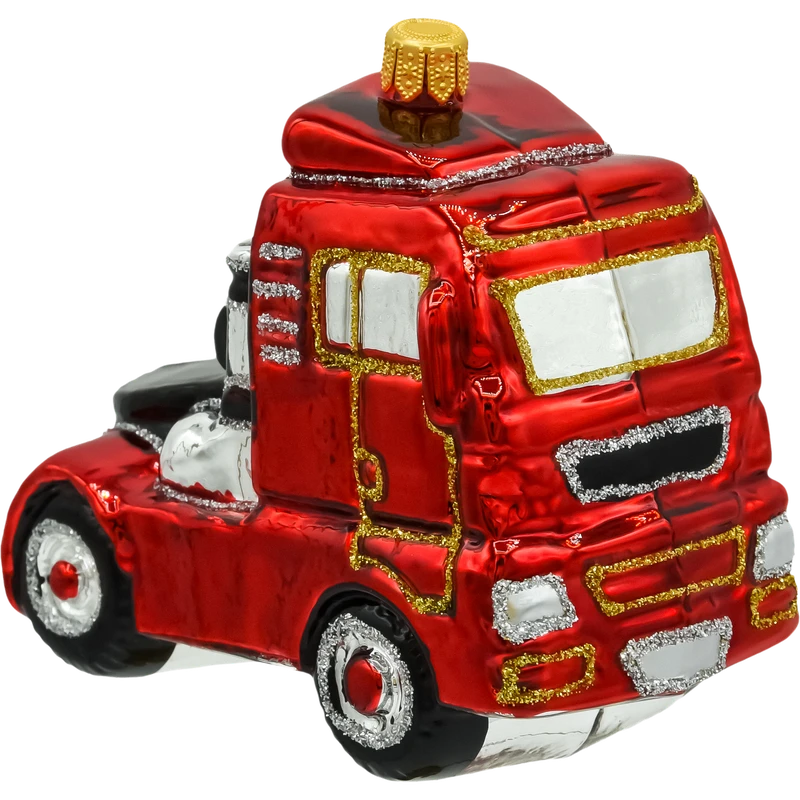Bombka wykonana jest ze szkła i ręcznie malowana, co nadaje jej niepowtarzalnego charakteru oraz sprawia, że każda sztuka jest jedyna w swoim rodzaju. Intensywny czerwony kolor pojazdu, w połączeniu ze srebrnymi i złotymi akcentami, przyciąga wzrok i nadaje choince nowoczesny, a jednocześnie świąteczny wygląd. Szczegółowe zdobienia, takie jak reflektory, okna i drobne detale kabiny, zostały precyzyjnie odwzorowane, dzięki czemu bombka wygląda realistycznie i stanowi idealny akcent na choince
