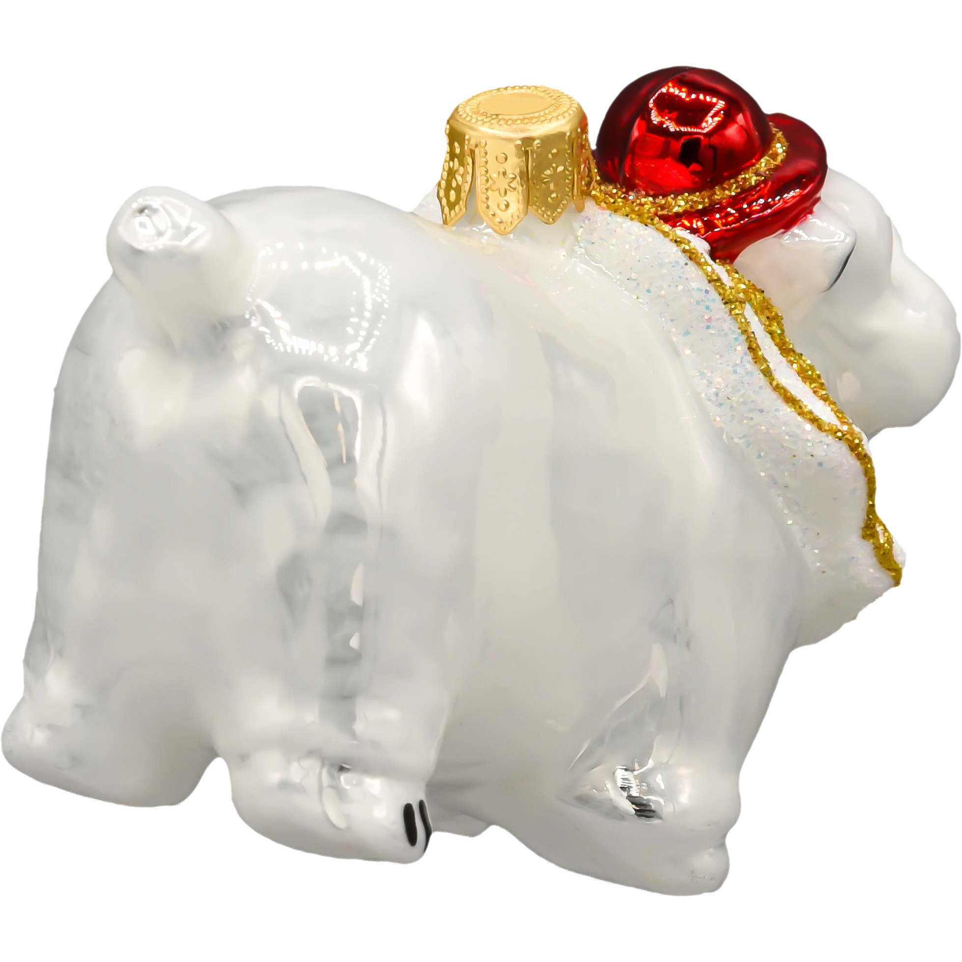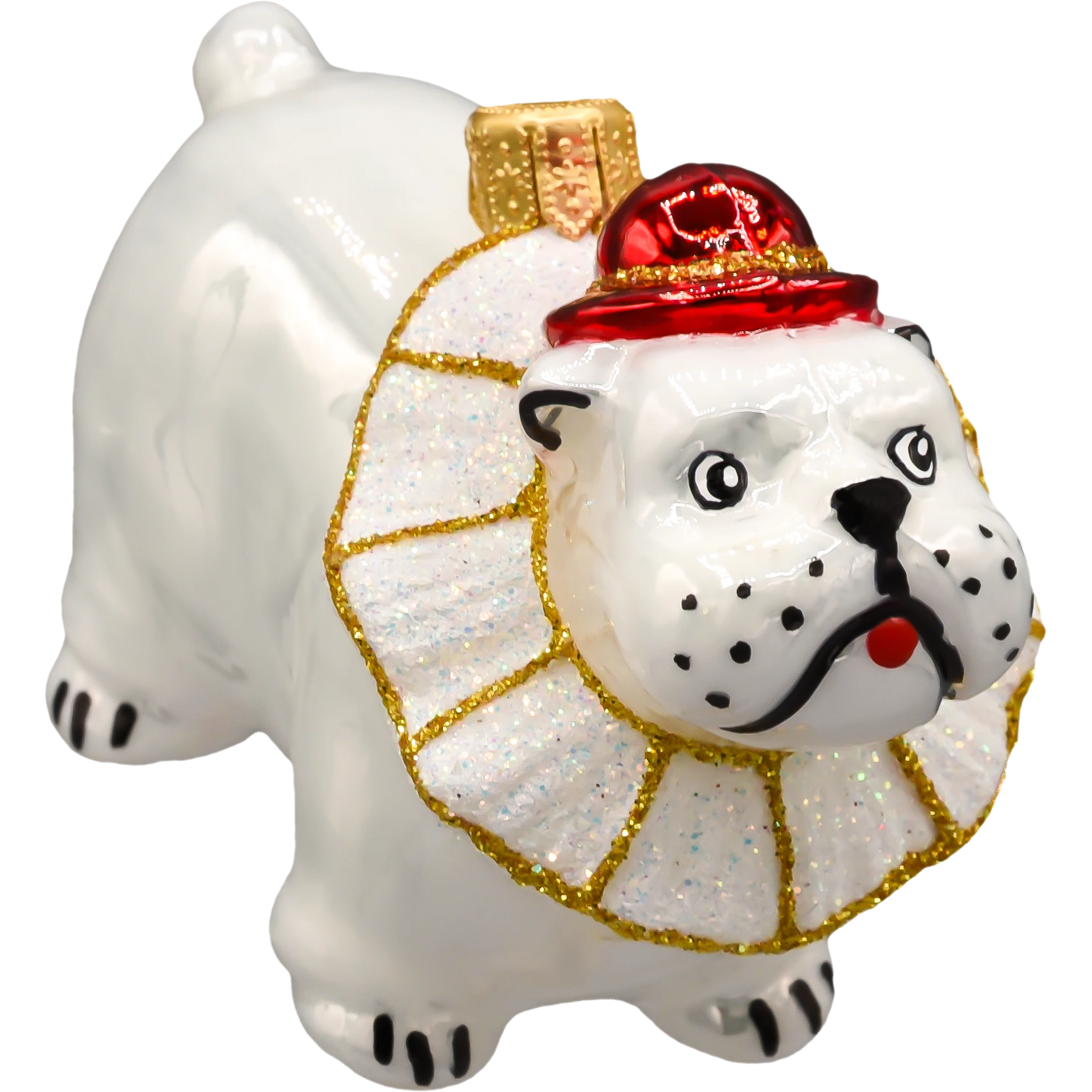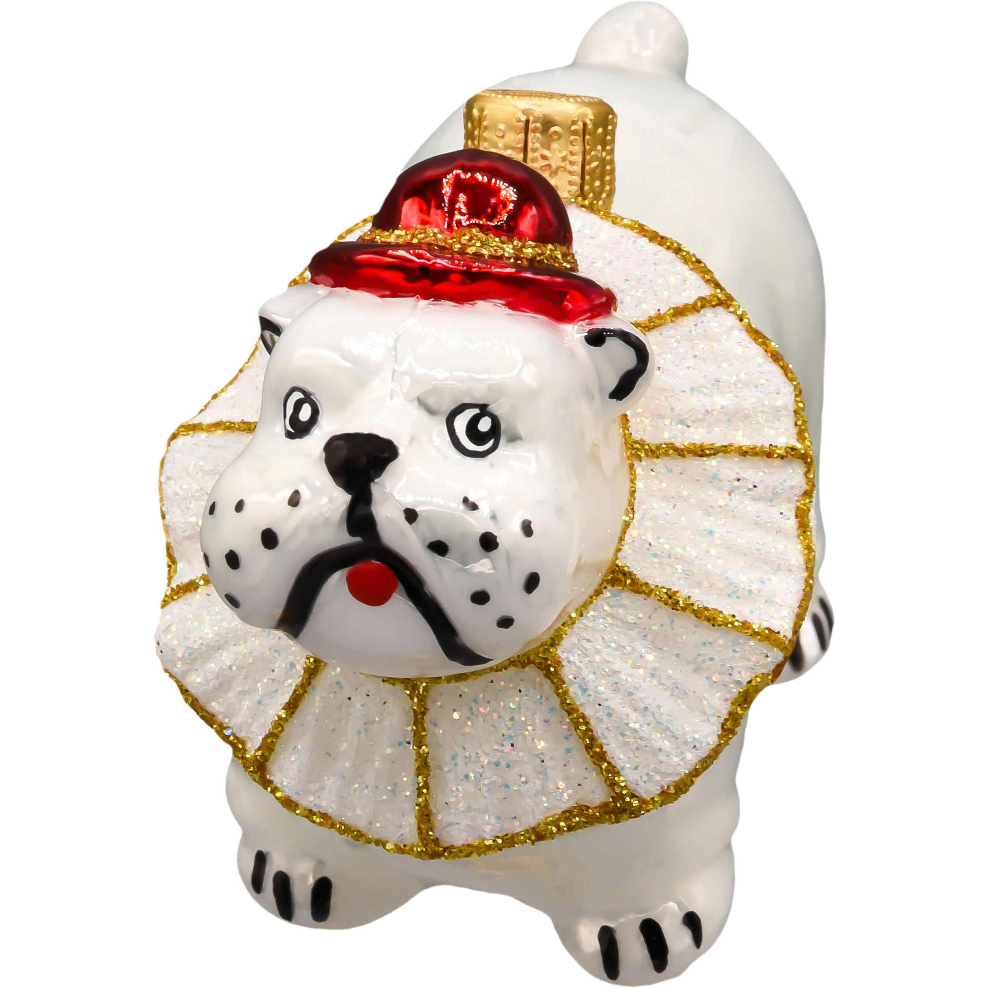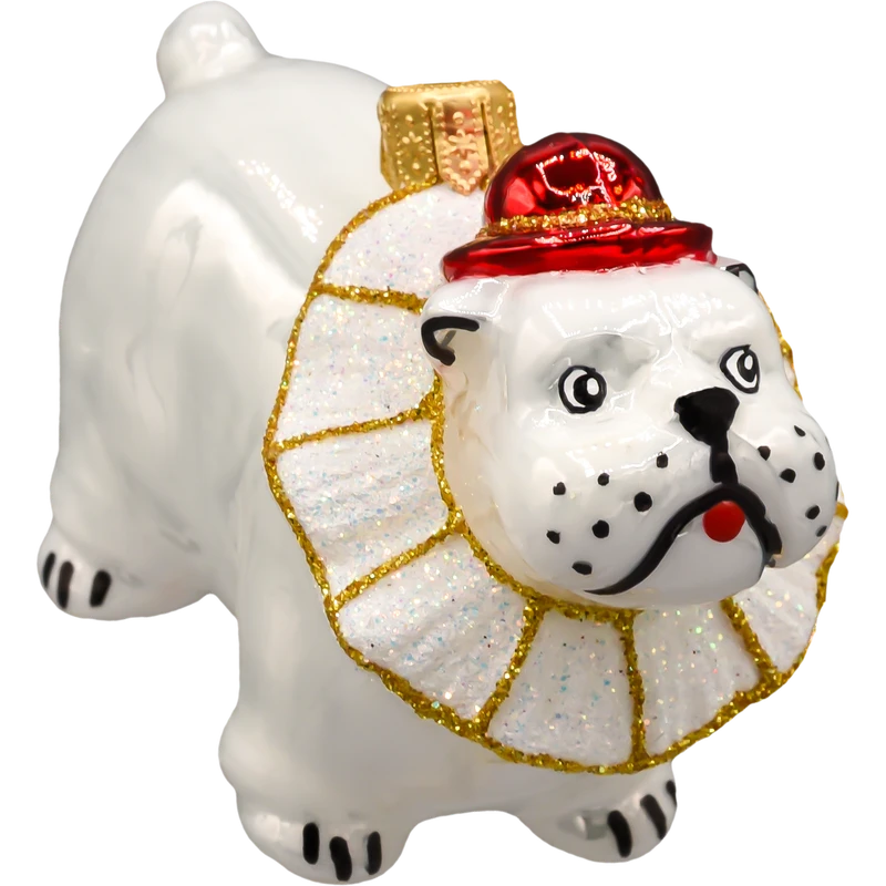 Buldog ma zabawną minę i dumną postawę, a jego szeroki, brokatowy kołnierz w stylu teatralnym wykonany został z połyskującego materiału zdobionego złotą lamówką. Całość zachowana jest w klasycznej, ciepłej kolorystyce świątecznej – biel, czerwień, złoto – która doskonale komponuje się z zarówno nowoczesnymi, jak i tradycyjnymi dekoracjami bożonarodzeniowymi.