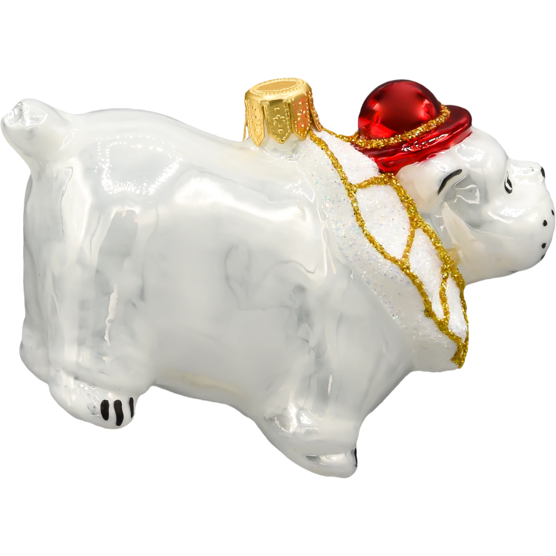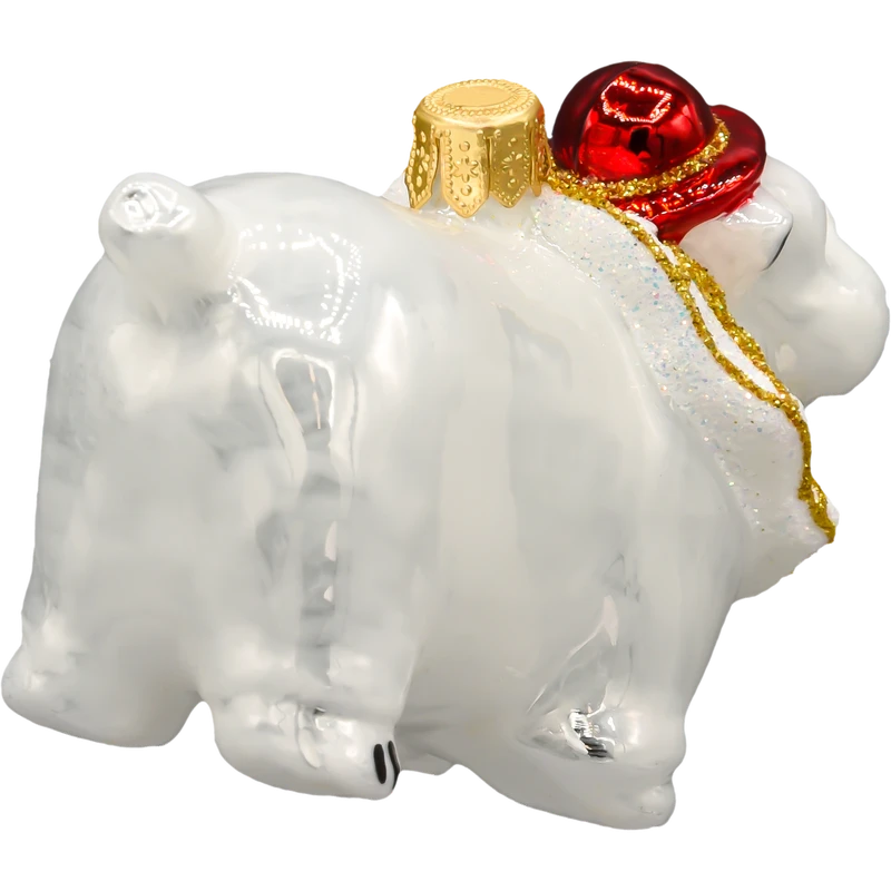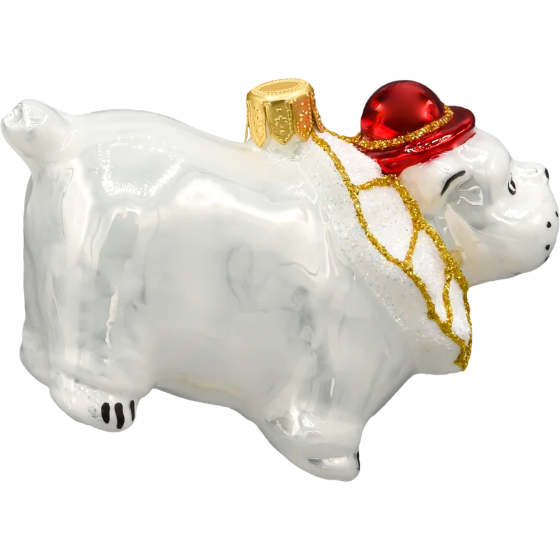 Jeśli lubisz święta z humorem i charakterem, ta bombka będzie strzałem w dziesiątkę! Szklana bombka choinkowa w kształcie białego buldoga ubranego w cyrkowy strój to nietuzinkowa ozdoba, która wnosi na choinkę odrobinę zabawy i ekstrawagancji. Ręcznie malowana, z brokatowym wykończeniem i efektownym czerwonym kapeluszem – ta bombka wyróżnia się zarówno pomysłem, jak i precyzją wykonania.