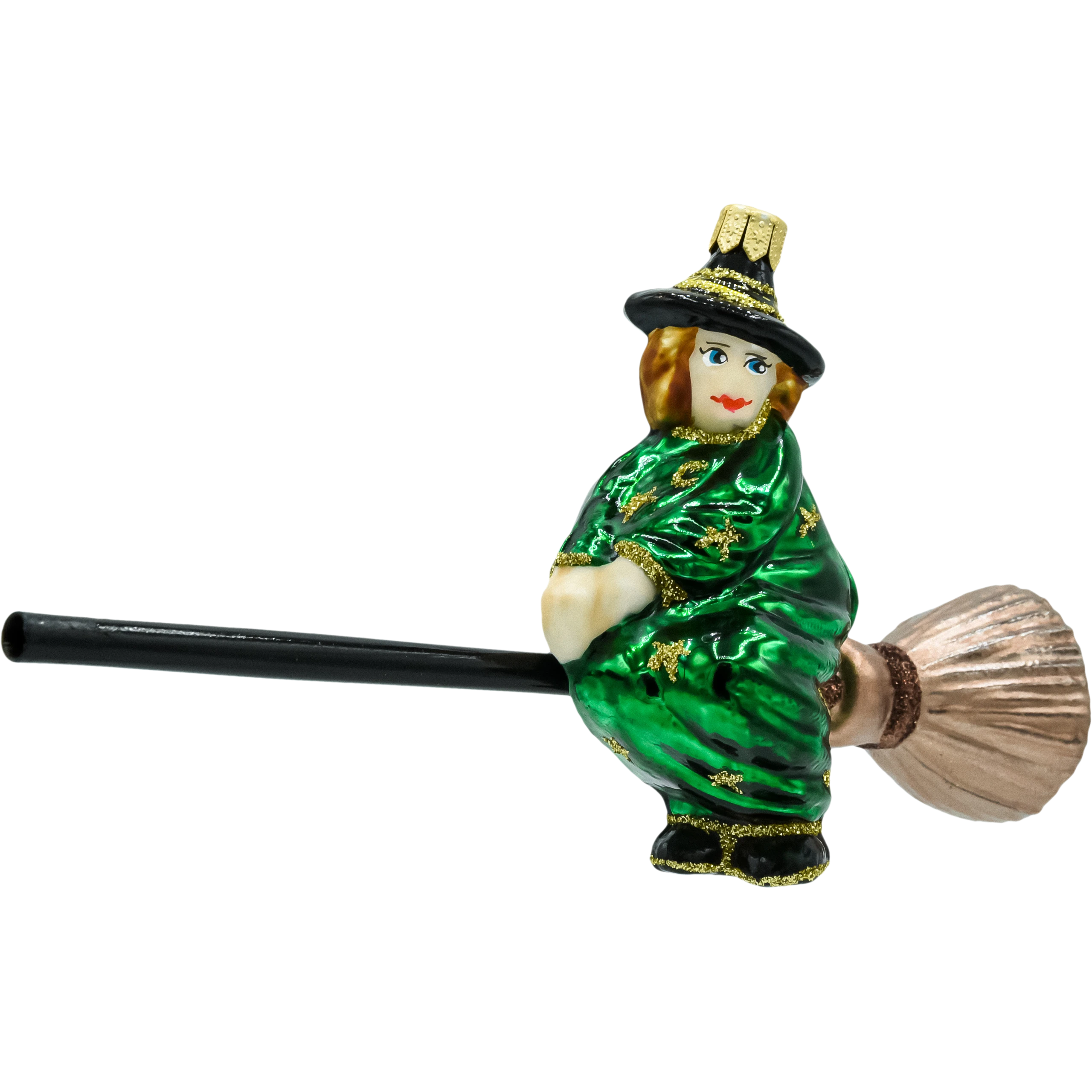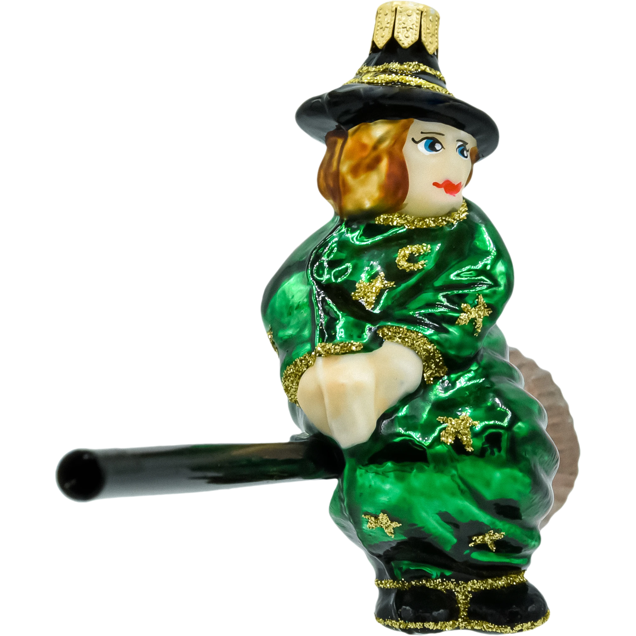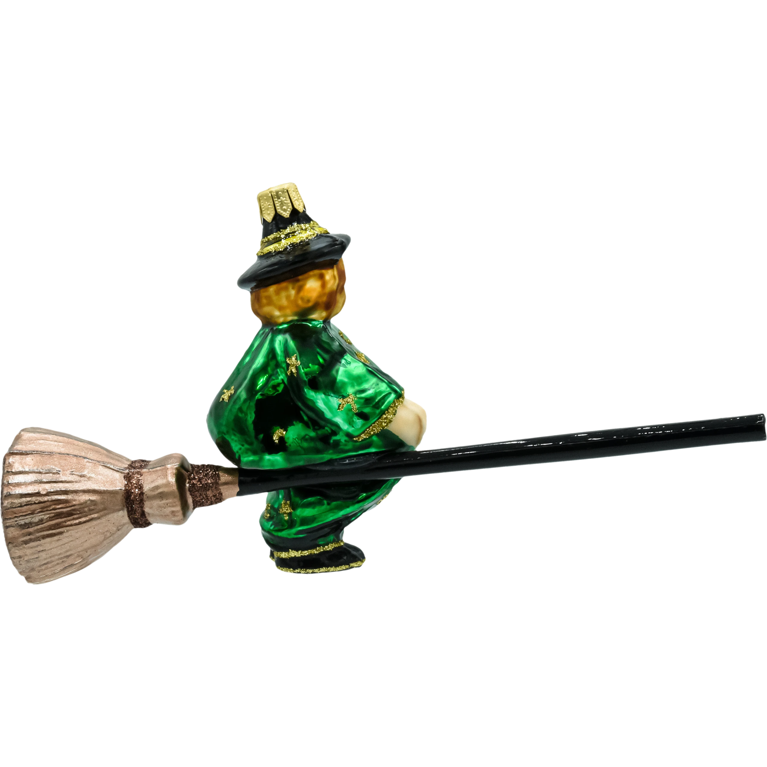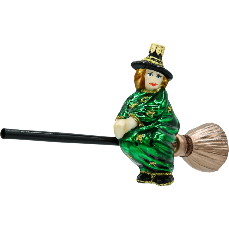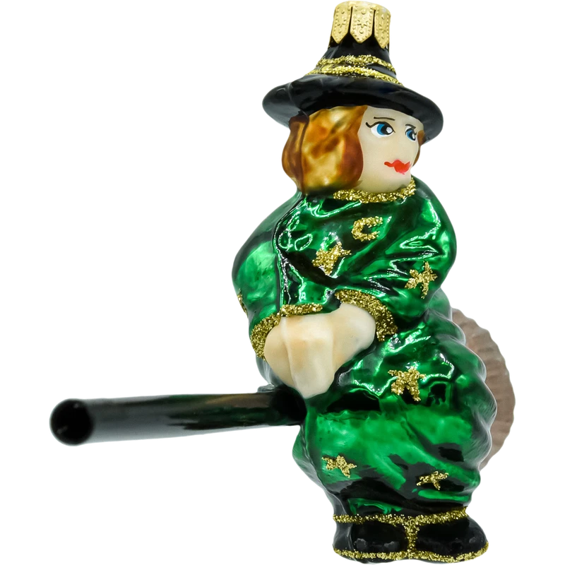 Ręcznie dmuchana bombka szklana – Czarownica na miotle. Figurka w zielonej pelerynie, zdobiona złotym brokatem, z długą miotłą i złotą zawieszką. Oryginalna ozdoba bożonarodzeniowa do choinki, stroików i girland; idealna dla fanów fantasy. Polska manufaktura, ręcznie malowana bombka choinkowa.