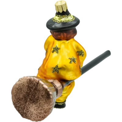 Szklana bombka-figurka Czarownica na miotle to ręcznie robione arcydzieło polskiej pracowni. Każdy egzemplarz jest ustnie dmuchany ze szkła, a następnie ręcznie malowany i zdobiony złotym brokatem. Głęboka zieleń szaty, czarny kapelusz z brokatowym rantem oraz charakterystyczna miotła z długim kijem tworzą efektowną, humorystyczną scenkę, która od razu przyciąga wzrok na choince. To idealna bombka dla fanów baśni, fantasy i… odrobiny psot w świątecznym wystroju.