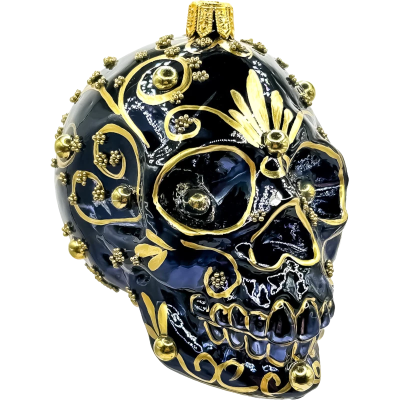 Design „Sugar Skull”: Złote ornamenty na czarnym tle tworzą unikalny wzór inspirowany tradycją meksykańskiego Dnia Zmarłych (Día de los Muertos). Wyrafinowane detale, takie jak złote akcenty wokół oczu, nosa i ust, podkreślają artystyczny charakter bombki.