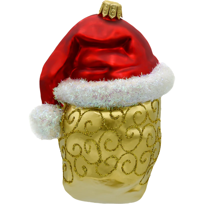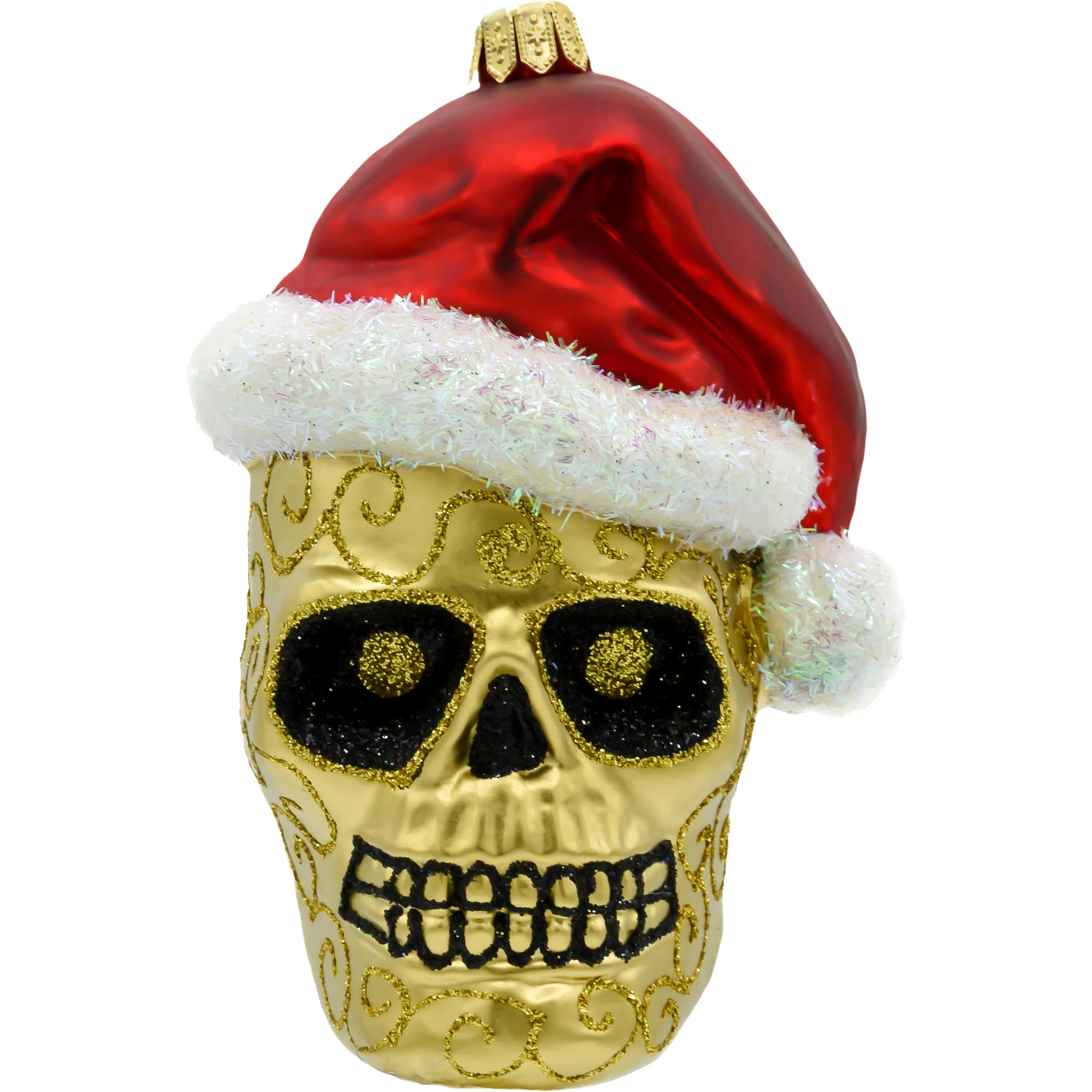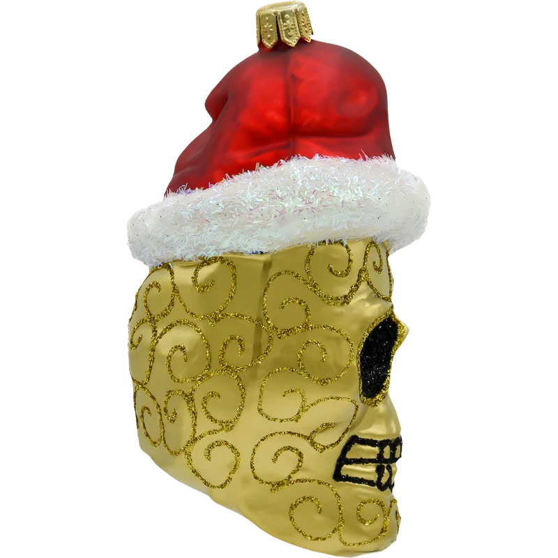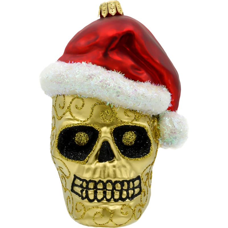 Motyw: Złota czaszka ozdobiona brokatowymi akcentami i misternymi wzorami, które nadają jej elegancki charakter. Połączenie z klasyczną czerwoną czapką Świętego Mikołaja, ozdobioną białym, puszystym futerkiem, sprawia, że dekoracja idealnie wpasowuje się w świąteczny klimat.